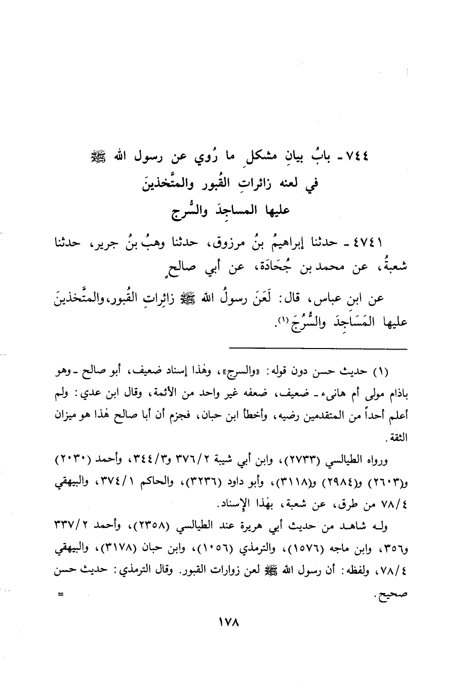 4741 - حَدَّثَنَا إِبْرَاهِيمُ بْنُ مَرْزُوقٍ , حَدَّثَنَا وَهْبُ بْنُ جَرِيرٍ , حَدَّثَنَا شُعْبَةُ , عَنْ مُحَمَّدِ بْنِ جُحَادَةَ , عَنْ أَبِي صَالِحٍ، عَنِ ابْنِ عَبَّاسٍ قَالَ: " لَعَنَ رَسُولُ اللهِ صَلَّى اللَّهُ عَلَيْهِ وَسَلَّمَ زَائِرَاتِ الْقُبُورِ، وَالْمُتَّخِذِينَ عَلَيْهَا الْمَسَاجِدَ وَالسُّرُجَ "