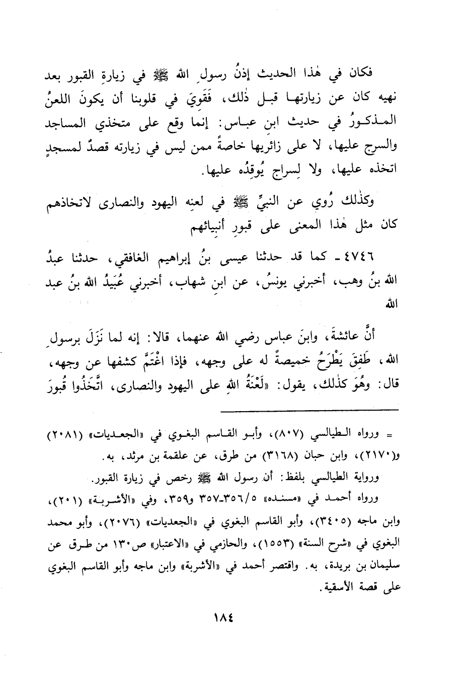 4746 - كَمَا قَدْ حَدَّثَنَا عِيسَى بْنُ إِبْرَاهِيمَ الْغَافِقِيُّ , حَدَّثَنَا عَبْدُ اللهِ بْنُ وَهْبٍ , أَخْبَرَنِي يُونُسُ , عَنِ ابْنِ شِهَابٍ , أَخْبَرَنِي عُبَيْدُ اللهِ بْنُ عَبْدِ اللهِ، أَنَّ عَائِشَةَ، وَابْنَ عَبَّاسٍ رَضِيَ اللهُ عَنْهُمَا قَالَا: إِنَّهُ لَمَّا نَزَلَ بِرَسُولِ اللهِ صَلَّى اللَّهُ عَلَيْهِ وَسَلَّمَ، طَفِقَ يَطْرَحُ خَمِيصَةً لَهُ عَلَى وَجْهِهِ، فَإِذَا اغْتَمَّ كَشَفَهَا عَنْ وَجْهِهِ قَالَ: وَهُوَ كَذَلِكَ، يَقُولُ: " لَعْنَةُ اللهِ عَلَى الْيَهُودِ وَالنَّصَارَى، اتَّخَذُوا قُبُورَ -[185]- أَنْبِيَائِهِمْ مَسَاجِدَ " يُحَذِّرُ مِثْلَ مَا صَنَعُوا -[186]- قَالَ أَبُو جَعْفَرٍ: فَوَقَفْنَا بِهَذَا الْحَدِيثِ عَلَى قَصْدِ رَسُولِ اللهِ صَلَّى اللَّهُ عَلَيْهِ وَسَلَّمَ بِالتَّحْذِيرِ مِنَ اتِّخَاذِ الْقُبُورِ مَسَاجِدَ فَوَقَفْنَا بِذَلِكَ عَلَى أَنَّ لِلَّعْنِ الَّذِي فِي حَدِيثِ ابْنِ عَبَّاسٍ إِنَّمَا كَانَ لِمَنْ هَذِهِ سَبِيلُهُ، وَلَا لِمَنْ سِوَاهُ مِنْ زائرِي الْقُبُورِ، لَا لِمِثْلِ ذَلِكَ، وَلَكِنْ لِمَا سِوَاهُ مِمَّا أَبَاحَ زِيَارَتَهَا مِنْ أَجْلِهِ، وَقَصَدْنَا إِلَى حَدِيثِ ابْنِ عَبَّاسٍ وَعَائِشَةَ هَذَا؛ لِأَنَّ فِيهِ أَنَّ ذَلِكَ الْقَوْلَ كَانَ مِنْ رَسُولِ اللهِ صَلَّى اللَّهُ عَلَيْهِ وَسَلَّمَ عِنْدَ وَفَاتِهِ، وَأَنَّهُ لَا نَاسِخَ لَهُ، وَغَنِينَا بِذَلِكَ عَنْ ذِكْرِنَا مَا رُوِيَ عَنْ رَسُولِ اللهِ صَلَّى اللَّهُ عَلَيْهِ وَسَلَّمَ فِي لَعْنَةِ الْيَهُودِ وَالنَّصَارَى لِاتِّخَاذِهِمْ قُبُورَ أَنْبِيَائِهِمْ مَسَاجِدَ، مِمَّا قَدْ يَجُوزُ أَنْ يَكُونَ كَانَ مِنْهُ النَّبِيُّ صَلَّى اللَّهُ عَلَيْهِ وَسَلَّمَ بَعْدَ ذَلِكَ فِي هَذَا الْمَعْنَى غَيْرُ هَذَا الْكَلَامِ، وَاللهَ عَزَّ وَجَلَّ نَسْأَلُهُ التَّوْفِيقَ