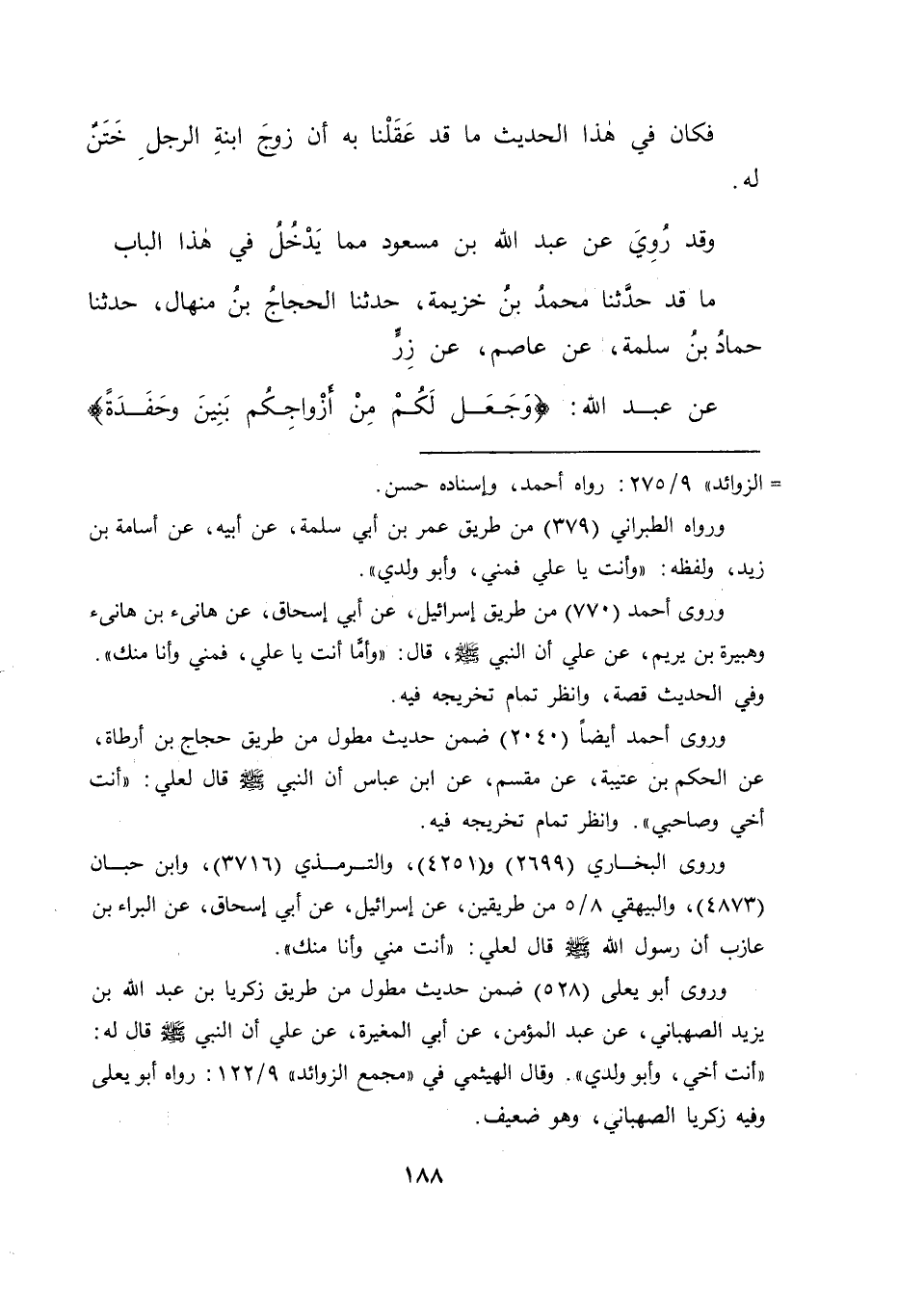 مَا قَدْ حَدَّثَنَا مُحَمَّدُ بْنُ خُزَيْمَةَ , حَدَّثَنَا الْحَجَّاجُ بْنُ مِنْهَالٍ , حَدَّثَنَا حَمَّادُ بْنُ سَلَمَةَ , عَنْ عَاصِمٍ , عَنْ زِرٍّ، عَنْ عَبْدِ اللهِ: {وَجَعَلَ لَكُمْ مِنْ أَزْوَاجِكُمْ بَنِينَ وَحَفَدَةً -[189]-} [النحل: 72] قَالَ: " الْحَفَدَةُ: الْأَخْتَانُ " وَمَا قَدْ حَدَّثَنَا ابْنُ أَبِي مَرْيَمَ , حَدَّثَنَا الْفِرْيَابِيُّ , حَدَّثَنَا سُفْيَانُ الثَّوْرِيُّ , عَنْ عَاصِمٍ , عَنْ زِرٍّ , عَنْ عَبْدِ اللهِ مِثْلَهُ -[190]- وَكَانَ ذَلِكَ عِنْدَنَا وَاللهُ أَعْلَمُ أَنَّ اللهَ تَعَالَى جَعَلَ لِعِبَادِهِ بَنِينَ وَهُمُ الذُّكْرَانُ، وَبَنَاتٍ يُزَوِّجُونَهُنُّ مِمَّنْ يَكُونُ مِنْ حَفَدَتِهِمْ، أَيْ: مِنْ أَعْوَانِهِمْ، وَمِمَّنْ يَدْخُلُ فِي جُمْلَتِهِمْ، وَقَدْ رُوِيَ عَنِ ابْنِ عَبَّاسٍ فِي ذَلِكَ