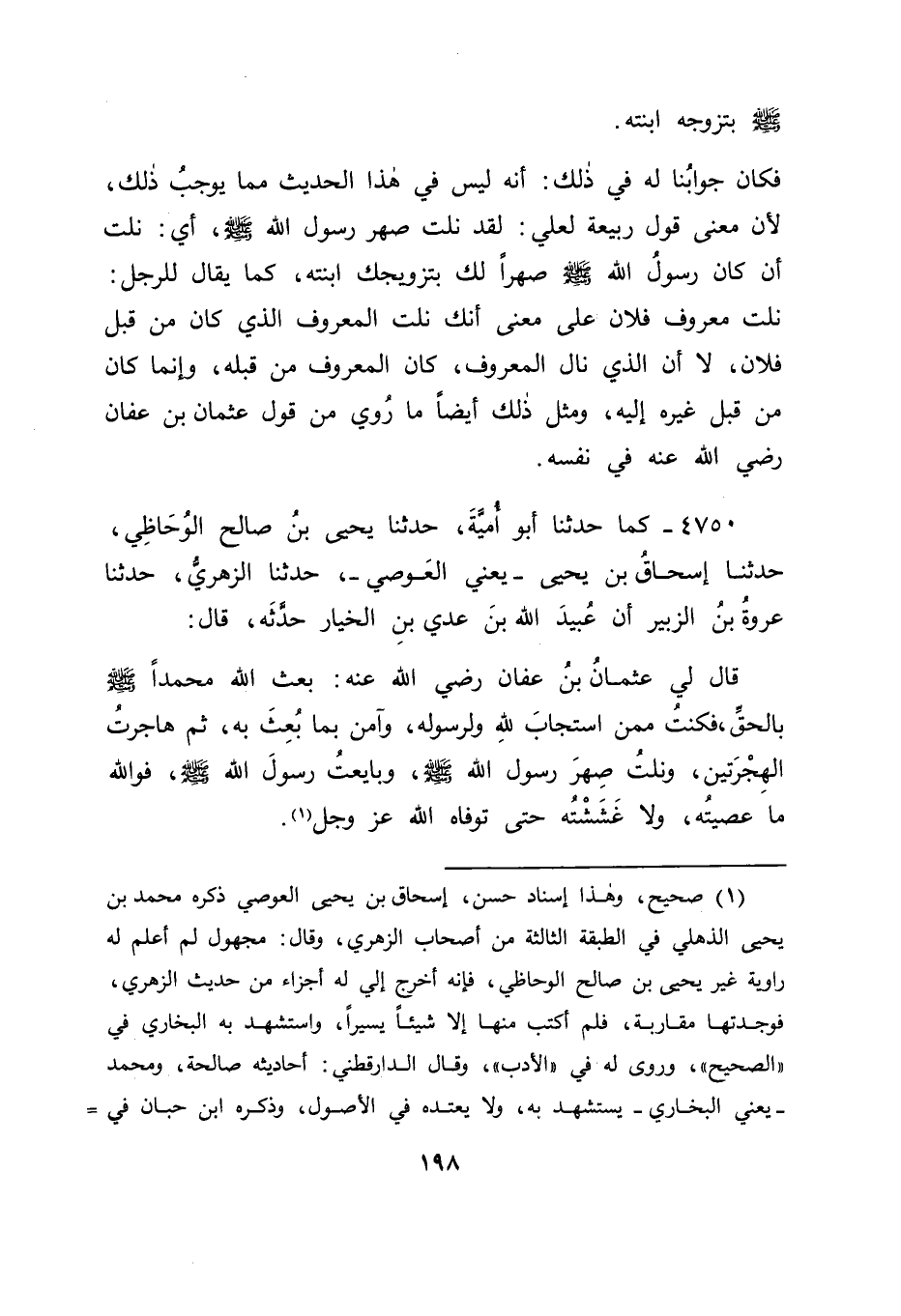 4750 - كَمَا حَدَّثَنَا أَبُو أُمَيَّةَ , حَدَّثَنَا يَحْيَى بْنُ صَالِحٍ الْوُحَاظِيُّ , حَدَّثَنَا إِسْحَاقُ بْنُ يَحْيَى يَعْنِي الْعَوْصِيَّ , حَدَّثَنَا الزُّهْرِيُّ , حَدَّثَنَا عُرْوَةُ بْنُ الزُّبَيْرِ أَنَّ عُبَيْدَ اللهِ بْنَ عَدِيِّ بْنِ الْخِيَارِ، حَدَّثَهُ قَالَ: قَالَ لِي عُثْمَانُ بْنُ عَفَّانَ رَضِيَ اللهُ عَنْهُ: " " بَعَثَ اللهُ مُحَمَّدًا صَلَّى اللَّهُ عَلَيْهِ وَسَلَّمَ بِالْحَقِّ، فَكُنْتُ مِمَّنِ اسْتَجَابَ لِلَّهِ وَلِرَسُولِهِ، وَآمَنَ بِمَا بُعِثَ بِهِ، ثُمَّ هَاجَرْتُ الْهِجْرَتَيْنِ، وَنِلْتُ صِهْرَ رَسُولِ اللهِ صَلَّى اللَّهُ عَلَيْهِ وَسَلَّمَ، وَبَايَعْتُ رَسُولَ اللهِ صَلَّى اللَّهُ عَلَيْهِ وَسَلَّمَ، فَوَاللهِ مَا عَصَيْتُهُ، وَلَا غَشَشْتُهُ حَتَّى تَوَفَّاهُ اللهُ عَزَّ وَجَلَّ " " -[199]- فَمَعْنَى ذَلِكَ كَمَعْنَى مَا ذَكَرْنَاهُ فِي مِثْلِهِ فِي عَلِيِّ بْنِ أَبِي طَالِبٍ رَضِيَ اللهُ عَنْهُ , وَلَمَّا ثَبَتَ فِي الْأَصْهَارِ مَا ذَكَرْنَا، وَأَنَّهُمْ أَنْسِبَاءُ أَزْوَاجِ الْبَنَاتِ، كَانَتْ أَنْسِبَاءُ أَرْحَامِهِمْ بِأَزْوَاجِهِمْ مُحَرَّمَاتٍ أَوْ غَيْرَ مُحَرَّمَاتٍ كَانَ مِثْلَ ذَلِكَ الْأَخْتَانُ الَّذِينَ هُمْ أَزْوَاجُ الْبَنَاتِ، وَأَزْوَاجُ الْأَخَوَاتِ، وَأَزْوَاجُ الْعَمَّاتِ، وَأَزْوَاجُ الْخَالِاتِ يَكُونُ أَنْسِبَاؤُهُمُ الَّذِينَ هُمْ مِنْ أَزْوَاجِ هَؤُلَاءِ كَأَنْسِبَاءِ الزَّوْجَاتِ فِيمَا ذَكَرْنَا الَّذِينَ صَارُوا بِذَلِكَ أَصْهَارًا لِلْأَزْوَاجِ يَسْتَوِي فِي ذَلِكَ مَنْ كَانَتْ رَحِمُهُ مِنْ أَزْوَاجِ هَؤُلَاءِ النِّسَاءِ مُحَرَّمَاتٍ أَوْ غَيْرَ مُحَرَّمَاتٍ، وَقَدْ أَجَازَ لَنَا عَلِيُّ بْنُ عَبْدِ الْعَزِيزِ، عَنْ أَبِي عُبَيْدٍ فِي كِتَابِهِ فِي " " الْأَنْسَابِ " " أَنَّهُ ذَكَرَ عَاصِمَ بْنَ عَبْدِ اللهِ بْنِ يَزِيدَ، وَهُوَ رَجُلٌ مِنْ بَنِي هِلَالٍ قَالَ: كَانَ قَدْ وَلِيَ لِأَبِي جَعْفَرٍ خُرَاسَانَ، وَأَنَّهُ ذَكَرَ ذَلِكَ مِنْ كَلَامِ أَبِي عُبَيْدٍ لِإِبْرَاهِيمَ بْنِ مُحَمَّدٍ الْعَبَّاسِيِّ، فَأَنْشَدَهُ لِعَاصِمٍ هَذَا قَالَ: