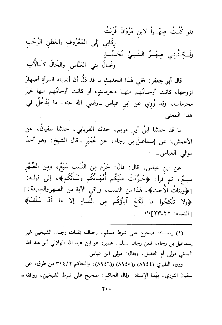 مَا قَدْ حَدَّثَنَا ابْنُ أَبِي مَرْيَمَ , حَدَّثَنَا الْفِرْيَابِيُّ , حَدَّثَنَا سُفْيَانُ , عَنِ الْأَعْمَشِ , عَنْ إِسْمَاعِيلَ بْنِ رَجَاءٍ , عَنْ عُمَيْرٍ قَالَ الشَّيْخُ: وَهُوَ أَحَدُ مَوَالِي الْعَبَّاسِ عَنِ ابْنِ عَبَّاسٍ قَالَ: قَالَ: " حُرِّمَ مِنَ النَّسَبِ سَبْعٌ، وَمَنِ الصِّهْرِ سَبْعٌ، ثُمَّ قَرَأَ: {حُرِّمَتْ عَلَيْكُمْ أُمَّهَاتُكُمْ وَبَنَاتُكُمْ} [النساء: 23] إِلَى قَوْلِهِ: {وَبَنَاتُ الْأُخْتِ} [النساء: 23] هَذَا مِنَ النَّسَبِ، وَبَاقِي الْآيَةِ مِنَ الصِّهْرِ، وَالسَّابِعَةُ: {وَلَا تَنْكِحُوا مَا نَكَحَ آبَاؤُكُمْ مِنَ النِّسَاءِ إِلَّا مَا قَدْ سَلَفَ} [النساء: 22]-[201]- فَفِي هَذَا الْحَدِيثِ أَنَّ اللهَ تَعَالَى حَرَّمَ مِنَ الصِّهْرِ سَبْعًا، أَيْ حَرَّمَ عَلَى الرَّجُلِ أَنْ يَتَزَوَّجَ مَنْ يَكُونُ لَهُ بِتَزْوِيجِهِ إِيَّاهُ أَصْهَارًا سِوَاهُ مِنْ أَنْسِبَائِهِ، وَفِي ذَلِكَ مَا قَدْ دَلَّ عَلَى مَا ذَكَرْنَا، وَاللهَ نَسْأَلُهُ التَّوْفِيقَ