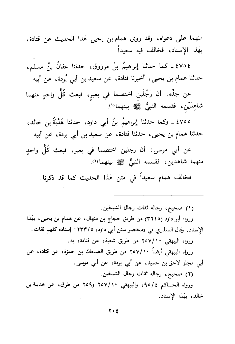 4755 - وَكَمَا حَدَّثَنَا إِبْرَاهِيمُ بْنُ أَبِي دَاوُدَ , حَدَّثَنَا هُدْبَةُ بْنُ خَالِدٍ , حَدَّثَنَا هَمَّامُ بْنُ يَحْيَى , حَدَّثَنَا قَتَادَةُ , عَنْ سَعِيدِ بْنِ أَبِي بُرْدَةَ , عَنْ أَبِيهِ عَنْ أَبِي مُوسَى: أَنَّ رَجُلَيْنِ اخْتَصَمَا فِي بَعِيرٍ، فَبَعَثَ كُلُّ وَاحِدٍ مِنْهُمَا شَاهِدَيْنِ، فَقَسَمَهُ النَّبِيُّ صَلَّى اللَّهُ عَلَيْهِ وَسَلَّمَ بَيْنَهُمَا فَخَالَفَ هَمَّامٌ سَعِيدًا فِي مَتْنِ هَذَا الْحَدِيثِ كَمَا قَدْ ذَكَرْنَا، -[205]- ثُمَّ نَظَرْنَا: هَلْ رَوَى هَذَا الْحَدِيثَ عَنْ قَتَادَةَ غَيْرُ سَعِيدٍ، وَغَيْرُ هَمَّامٍ
