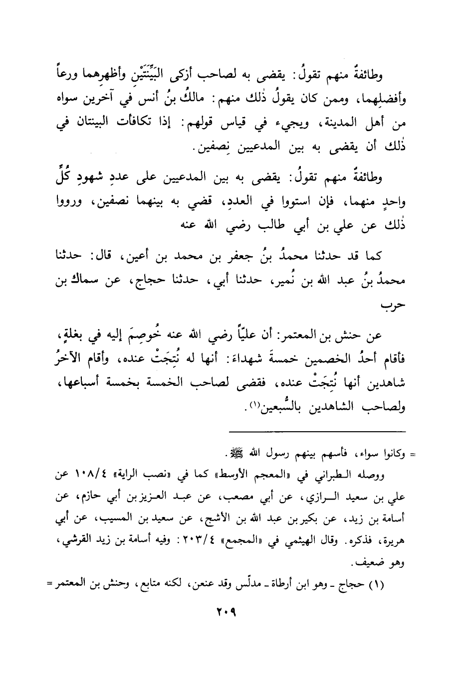 كَمَا قَدْ حَدَّثَنَا مُحَمَّدُ بْنُ جَعْفَرِ بْنِ مُحَمَّدِ بْنِ أَعْيَنَ قَالَ: حَدَّثَنَا مُحَمَّدُ بْنُ عَبْدِ اللهِ بْنِ نُمَيْرٍ , حَدَّثَنَا أَبِي , حَدَّثَنَا حَجَّاجٌ , عَنْ سِمَاكِ بْنِ حَرْبٍ عَنْ حَنَشِ بْنِ الْمُعْتَمِرِ: أَنَّ عَلِيًّا رَضِيَ اللهُ عَنْهُ خُوصِمَ إِلَيْهِ فِي بَغْلَةٍ، فَأَقَامَ أَحَدُ الْخَصْمَيْنِ خَمْسَةَ شُهَدَاءَ: أَنَّهَا لَهُ نُتِجَتْ عِنْدَهُ، وَأَقَامَ الْآخَرُ شَاهِدَيْنِ أَنَّهَا نُتِجَتْ عِنْدَهُ، فَقَضَى لِصَاحِبِ الْخَمْسَةِ بِخَمْسَةِ أَسْبَاعِهَا، وَلِصَاحِبِ الشَّاهِدَيْنِ بِالسُّبْعَيْنِ -[210]- وَلَمَّا اخْتَلَفُوا فِي ذَلِكَ، نَظَرْنَا فِيمَا اخْتَلَفُوا فِيهِ مِنْهُ لِنَعْلَمَ الْأَوْلَى مِمَّا قَالُوهُ فِيهِ، فَبَدَأْنَا بِقَوْلِ مَنْ قَالَ مَنْ قَالَ: يُقْرَعُ بَيْنَهُمَا، فَوَجَدْنَا الْقُرْعَةَ قَدْ كَانَتْ تُسْتَعْمَلُ فِي بَدْءِ الْإِسْلَامِ، وَيُقْضَى بِهَا