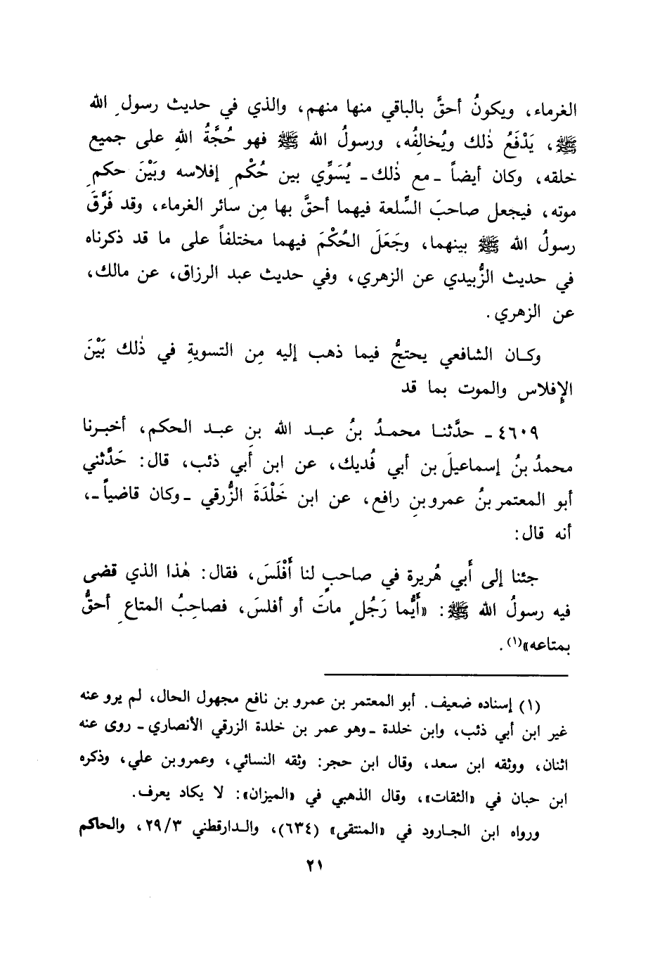 4609 - حَدَّثَنَا مُحَمَّدُ بْنُ عَبْدِ اللهِ بْنِ الْحَكَمِ، أَخْبَرَنَا مُحَمَّدُ بْنُ إِسْمَاعِيلَ بْنِ أَبِي فُدَيْكٍ، عَنِ ابْنِ أَبِي ذِئْبٍ قَالَ: حَدَّثَنِي أَبُو مُعْتَمِرِ بْنُ عَمْرِو بْنِ رَافِعٍ، عَنِ ابْنِ خَلْدَةَ الزُّرَقِيِّ وَكَانَ قَاضِيًا أَنَّهُ قَالَ: جِئْنَا إِلَى أَبِي هُرَيْرَةَ فِي صَاحِبٍ لَنَا أَفْلَسَ، فَقَالَ: هَذَا الَّذِي قَضَى فِيهِ رَسُولُ اللهِ صَلَّى اللَّهُ عَلَيْهِ وَسَلَّمَ: " أَيُّمَا رَجُلٍ مَاتَ أَوْ أَفْلَسَ، فَصَاحِبُ الْمَتَاعِ أَحَقُّ بِمَتَاعِهِ " -[22]-