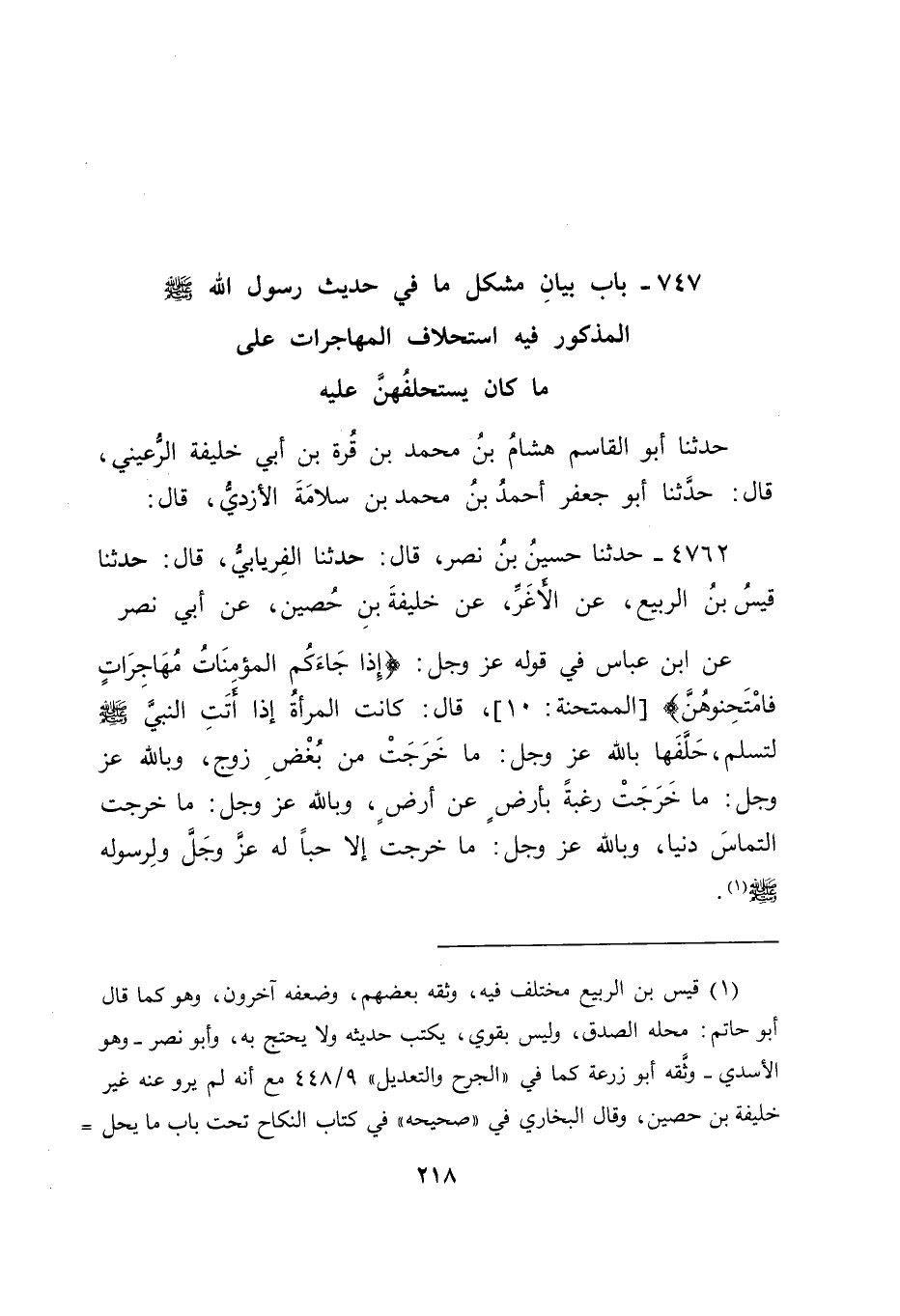 4762 - حَدَّثَنَا أَبُو الْقَاسِمِ هِشَامُ بْنُ مُحَمَّدِ بْنِ قُرَّةَ بْنِ أَبِي خَلِيفَةَ الرُّعَيْنِيُّ قَالَ: حَدَّثَنَا أَبُو جَعْفَرٍ أَحْمَدُ بْنُ مُحَمَّدِ بْنِ سَلَامَةَ الْأَزْدِيُّ قَالَ: حَدَّثَنَا حُسَيْنُ بْنُ نَصْرٍ قَالَ: حَدَّثَنَا الْفِرْيَابِيُّ قَالَ: حَدَّثَنَا قَيْسُ بْنُ الرَّبِيعِ , عَنِ الْأَغَرِّ , عَنْ خَلِيفَةَ بْنِ حُصَيْنٍ , عَنْ أَبِي نَصْرٍ، عَنِ ابْنِ عَبَّاسٍ، فِي قَوْلِهِ عَزَّ وَجَلَّ: {إِذَا جَاءَكُمُ الْمُؤْمِنَاتُ مُهَاجِرَاتٍ فَامْتَحِنُوهُنَّ} [الممتحنة: 10] قَالَ: كَانَتِ الْمَرْأَةُ إِذَا أَتَتِ النَّبِيَّ صَلَّى اللَّهُ عَلَيْهِ وَسَلَّمَ لِتُسْلِمَ، حَلَّفَهَا بِاللهِ عَزَّ وَجَلَّ: " مَا خَرَجَتْ مِنْ بُغْضِ زَوْجٍ، وَبِاللهِ عَزَّ وَجَلَّ: مَا خَرَجَتْ رَغْبَةً بِأَرْضٍ عَنْ أَرْضٍ، وَبِاللهِ عَزَّ وَجَلَّ: مَا خَرَجَتِ الْتِمَاسَ دُنْيَا، وَبِاللهِ عَزَّ وَجَلَّ: مَا خَرَجَتْ إِلَّا حُبًّا لَهُ عَزَّ وَجَلَّ وَلِرَسُولِهِ صَلَّى اللَّهُ عَلَيْهِ وَسَلَّمَ " -[219]- قَالَ أَبُو جَعْفَرٍ: فَفِي هَذَا الْحَدِيثِ اسْتِحْلَافُ رَسُولِ اللهِ صَلَّى اللَّهُ عَلَيْهِ وَسَلَّمَ مَنْ كَانَ يَأْتِيهِ مِنَ النِّسَاءِ لِلْهِجْرَةِ إِلَيْهِ عَلَى مَا ذُكِرَ فِيهِ مِنَ اسْتِحْلَافِهِ إِيَّاهُنَّ عَلَيْهِ، وَهَذَا مِمَّا يَدْخُلُ فِي بَابٍ مِنَ الْفِقْهِ، قَدِ اخْتَلَفَ أَهْلُهُ فِيهِ، وَهُوَ الرَّجُلُ يَمُرُّ بِمَالِهِ عَلَى عَاشِرِ الْمُسْلِمِينَ، فَيَطْلُبُ مِنْهُ زَكَاتَهُ، فَيَقُولُ: قَدْ أَدَّيْتُهَا إِلَى الْمَسَاكِينَ الَّذِينَ يَسْتَحِقُّونَ مِثْلَهَا، أَوْ قَدْ أَدَّيْتُهَا إِلَى عَاشِرٍ مَرَرْتُ بِهِ قَبْلَكَ، فَكَانَ بَعْضُهُمْ يَقُولُ: يَسْتَحْلِفُهُ عَلَى ذَلِكَ إِنِ اتَّهَمَهُ عَلَى مَا قَالَهُ لَهُ، وَيُخَلِّي بَيْنَهُ وَبَيْنَ مَالِهِ، مِنْهُمْ: أَبُو حَنِيفَةَ وَأَصْحَابُهُ وَالشَّافِعِيُّ، وَمِنْهُمْ مَنْ يُصَدِّقُهُ عَلَى ذَلِكَ، وَلَا يَسْتَحْلِفُهُ عَلَيْهِ، مِنْهُمْ مَالِكٌ وَالثَّوْرِيُّ، وَكَانَا يَذْهَبَانِ فِي ذَلِكَ إِلَى أَنَّ هَذِهِ عِبَادَةٌ، الْمُتَعَبِّدُونَ بِهَا مُؤْتَمَنُونَ عَلَيْهَا، وَلَا يَجِبُ اسْتِحْلَافُهُمْ بِالظُّنُونِ بِهِمْ فِيهَأ غَيْرِ الْوَاجِبِ كَانَ عَلَيْهِمْ فِيهَا، وَيَذْهَبُونَ إِلَى أَنَّ الِاسْتِحَلَافَاتِ عَلَى الْأَشْيَاءِ الْمُدَّعَاةِ -[220]- إِنَّمَا تَجِبُ لِلْمُدَّعِيِينَ بَعْدَ عِلْمِهِمْ أَنَّهَا قَدْ كَانَتْ مِنَ الْمَطْلُوبِينَ بِهَا، وَأَنَّ اسْتِعْمَالَ الظُّنُونِ بِهِمْ غَيْرُ الْوَاجِبِ كَانَ عَلَيْهِمْ فِيهَا غَيْرُ وَاسِعٍ لِمَنْ ظَنَّ ذَلِكَ بِهِمْ، وَفِي ذَلِكَ مَا يَنْفِي أَنْ يَكُونَ عَلَى الْمُدَّعَى عَلَيْهِ فِي ذَلِكَ بِالظُّنُونِ لَا بِالْحَقَائِقِ يَمِينٌ، وَكَانَ هَذَا الْقَوْلُ هُوَ الَّذِي يَقُومُ فِي قُلُوبِنَا وَالَّذِي نَذْهَبُ إِلَيْهِ فِي هَذَا الْمَعْنَى حَتَّى وَقَفْنَا عَلَى مَا فِي الْحَدِيثِ الَّذِي رُوِّينَاهُ فِي هَذَا الْبَابِ مِنَ اسْتِحْلَافِ رَسُولِ اللهِ صَلَّى اللَّهُ عَلَيْهِ وَسَلَّمَ الْمُهَاجِرَاتِ إِلَيْهِ عَلَى مَا كَانَ يَسْتَحْلِفُهُنَّ عَلَيْهِ مِمَّا ذَكَرَ فِي الْحَدِيثِ الَّذِي رُوِّينَاهُ فِي ذَلِكَ حِيَاطَةً لِلْإِسْلَامٍ، فَمِثْلُ ذَلِكَ الِاسْتِحْلَافِ فِيمَا اخْتُلِفَ فِيهِ مِمَّا ذَكَرْنَا يَكُونُ ذَلِكَ لِمَنْ تَوَلَّى الصَّدَقَاتِ حِيَاطَةً لِلْإِسْلَامِ، وَاسْتِيفَاءً لِحُقُوقِ أَهْلِهِ مِمَّنْ وَجَبَتْ لَهُمْ عَلَيْهِمْ وَاللهَ نَسْأَلُهُ التَّوْفِيقَ