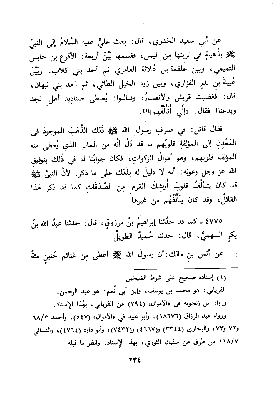 4775 - كَمَا قَدْ حَدَّثَنَا إِبْرَاهِيمُ بْنُ مَرْزُوقٍ قَالَ: حَدَّثَنَا عَبْدُ اللهِ بْنُ بَكْرٍ السَّهْمِيُّ قَالَ: حَدَّثَنَا حُمَيْدٌ الطَّوِيلُ عَنْ أَنَسِ بْنِ مَالِكٍ: أَنَّ رَسُولَ اللهِ صَلَّى اللَّهُ عَلَيْهِ وَسَلَّمَ أَعْطَى مِنْ غَنَائِمِ حُنَيْنٍ مِائَةً -[235]- مِنَ الْإِبِلِ: عُيَيْنَةَ بْنَ بَدْرٍ، وَالْأَقْرَعَ بْنَ حَابِسٍ مِائَةً مِنَ الْإِبِلِ وَلَمَّا كَانَ مَا ذَكَرْنَا كَذَلِكَ انْتَفَى أَنْ يَكُونَ فِي الْحَدِيثِ الْأَوَّلِ دَلِيلٌ لِهَذَا الْقَائِلِ عَلَى مَا تُوُهِّمَ أَنَّهُ دَلِيلٌ لَهُ عَلَى مَا اسْتَدَلَّ بِهِ فِيهِ، وَاللهَ عَزَّ وَجَلَّ نَسْأَلُهُ التَّوْفِيقَ