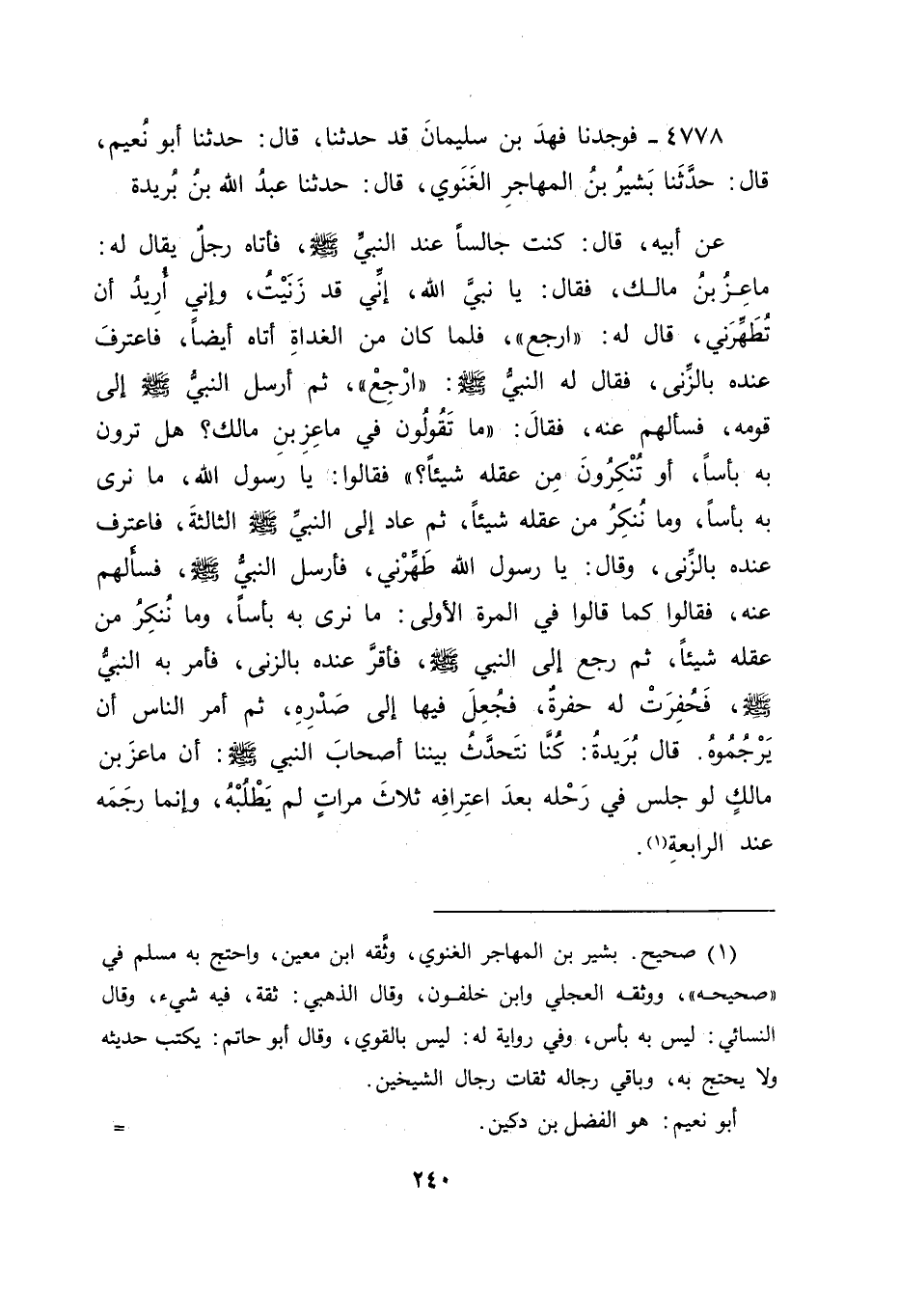 4778 - فَوَجَدْنَا فَهْدَ بْنَ سُلَيْمَانَ قَدْ حَدَّثَنَا قَالَ: حَدَّثَنَا أَبُو نُعَيْمٍ قَالَ: حَدَّثَنَا بَشِيرُ بْنُ الْمُهَاجِرِ الْغَنَوِيُّ قَالَ: حَدَّثَنَا عَبْدُ اللهِ بْنُ بُرَيْدَةَ , عَنْ أَبِيهِ قَالَ: كُنْتُ جَالِسًا عِنْدَ النَّبِيِّ صَلَّى اللَّهُ عَلَيْهِ وَسَلَّمَ، فَأَتَاهُ رَجُلٌ يُقَالُ لَهُ مَاعِزُ بْنُ مَالِكٍ , فَقَالَ: يَا نَبِيَّ اللهِ إِنِّي قَدْ زَنَيْتُ، وَإِنِّي أُرِيدُ أَنْ تُطَهِّرَنِي قَالَ لَهُ: " ارْجِعْ " , فَلَمَّا كَانَ مِنَ الْغَدَاةِ أَتَاهُ أَيْضًا، فَاعْتَرَفَ عِنْدَهُ بِالزِّنَى، فَقَالَ لَهُ النَّبِيُّ صَلَّى اللَّهُ عَلَيْهِ وَسَلَّمَ: " ارْجِعْ " , ثُمَّ أَرْسَلَ النَّبِيُّ صَلَّى اللَّهُ عَلَيْهِ وَسَلَّمَ إِلَى قَوْمِهِ، فَسَأَلَهُمْ عَنْهُ، فَقَالَ: " مَا تَقُولُونَ فِي مَاعِزِ بْنِ مَالِكٍ؟ هَلْ تَرَوْنَ بِهِ بَأْسًا، أَوْ تُنْكِرُونَ مِنْ عَقْلِهِ شَيْئًا؟ " فَقَالُوا: يَا رَسُولَ اللهِ , مَا نَرَى بِهِ بَأْسًا، وَمَا نُنْكِرُ مِنْ عَقْلِهِ شَيْئًا، ثُمَّ عَادَ إِلَى النَّبِيِّ صَلَّى اللَّهُ عَلَيْهِ وَسَلَّمَ الثَّالِثَةَ، فَاعْتَرَفَ عِنْدَهُ بِالزِّنَى، وَقَالَ يَا رَسُولَ اللهِ , طَهِّرْنِي، فَأَرْسَلَ النَّبِيُّ صَلَّى اللَّهُ عَلَيْهِ وَسَلَّمَ، فَسَأَلَهُمْ عَنْهُ، فَقَالُوا كَمَا قَالُوا فِي الْمَرَّةِ الْأُولَى: مَا نَرَى بِهِ بَأْسًا، وَمَا نُنْكِرُ مِنْ عَقْلِهِ شَيْئًا، ثُمَّ رَجَعَ إِلَى النَّبِيِّ صَلَّى اللَّهُ عَلَيْهِ وَسَلَّمَ، فَأَقَرَّ عِنْدَهُ بِالزِّنَى، فَأَمَرَ بِهِ النَّبِيُّ صَلَّى اللَّهُ عَلَيْهِ وَسَلَّمَ، فَحُفِرَتْ لَهُ حُفْرَةٌ، فَجُعِلَ فِيهَا إِلَى صَدْرِهِ، ثُمَّ أَمَرَ النَّاسَ أَنْ يَرْجُمُوهُ قَالَ بُرَيْدَةُ: كُنَّا نَتَحَدَّثُ بَيْنَنَا أَصْحَابَ النَّبِيِّ صَلَّى اللَّهُ عَلَيْهِ وَسَلَّمَ: أَنَّ مَاعِزَ بْنَ مَالِكٍ لَوْ جَلَسَ فِي رَحْلِهِ بَعْدَ اعْتِرَافِهِ ثَلَاثَ مَرَّاتٍ لَمْ يَطْلُبْهُ، وَإِنَّمَا رَجَمَهُ عِنْدَ الرَّابِعَةِ -[241]- فَكَانَ فِي هَذَا الْحَدِيثِ مِنْ قَوْلِ رَسُولِ اللهِ صَلَّى اللَّهُ عَلَيْهِ وَسَلَّمَ فِي سُؤَالِهِ قَوْمَ مَاعِزٍ عَنْهُ: " هَلْ تُنْكِرُونَ مِنْ عَقْلِهِ شَيْئًا؟ " وَلَمْ يُخَصِّصْ فِي ذَلِكَ سَبَبًا مِمَّا يُنْكَرُ بِهِ عَقْلُهُ مِنْ سُكْرٍ وَمِنْ غَيْرِهِ، عَقَلْنَا بِذَلِكَ: أَنَّهُ إِذَا أُنْكِرَ مِنْ عَقْلِهِ شَيْءٌ، خَرَجَ بِهِ مِنْ أَحْكَامِ الْأَصِحَّاءِ الْمَقْبُولَةِ إِقْرَارَاتُهُمْ إِلَى مَنْ سِوَاهُمْ مِمَّنْ لَا يُقْبَلُ إِقْرَارُهُ، وَأَنَّهُ يَسْتَوِي فِي ذَلِكَ حُكْمُ الْأَسْبَابِ الَّتِي بِهَا يُنْكَرُ مِنْ عُقُولِ أَصْحَابِهَا مَا يُنْكَرُ مِنَ الْجُنُونِ، وَمِنْ غَيْرِهِ، وَفِي ذَلِكَ دُخُولُ السُّكْرِ فِي ذَلِكَ الْمَعْنَى، وَوَجَدْنَا عَنْ رَسُولِ اللهِ صَلَّى اللَّهُ عَلَيْهِ وَسَلَّمَ أَيْضًا فِي أَمْرِ مَاعِزِ مَا يَزِيدُ عَلَى مَا فِي هَذَا الْحَدِيثِ