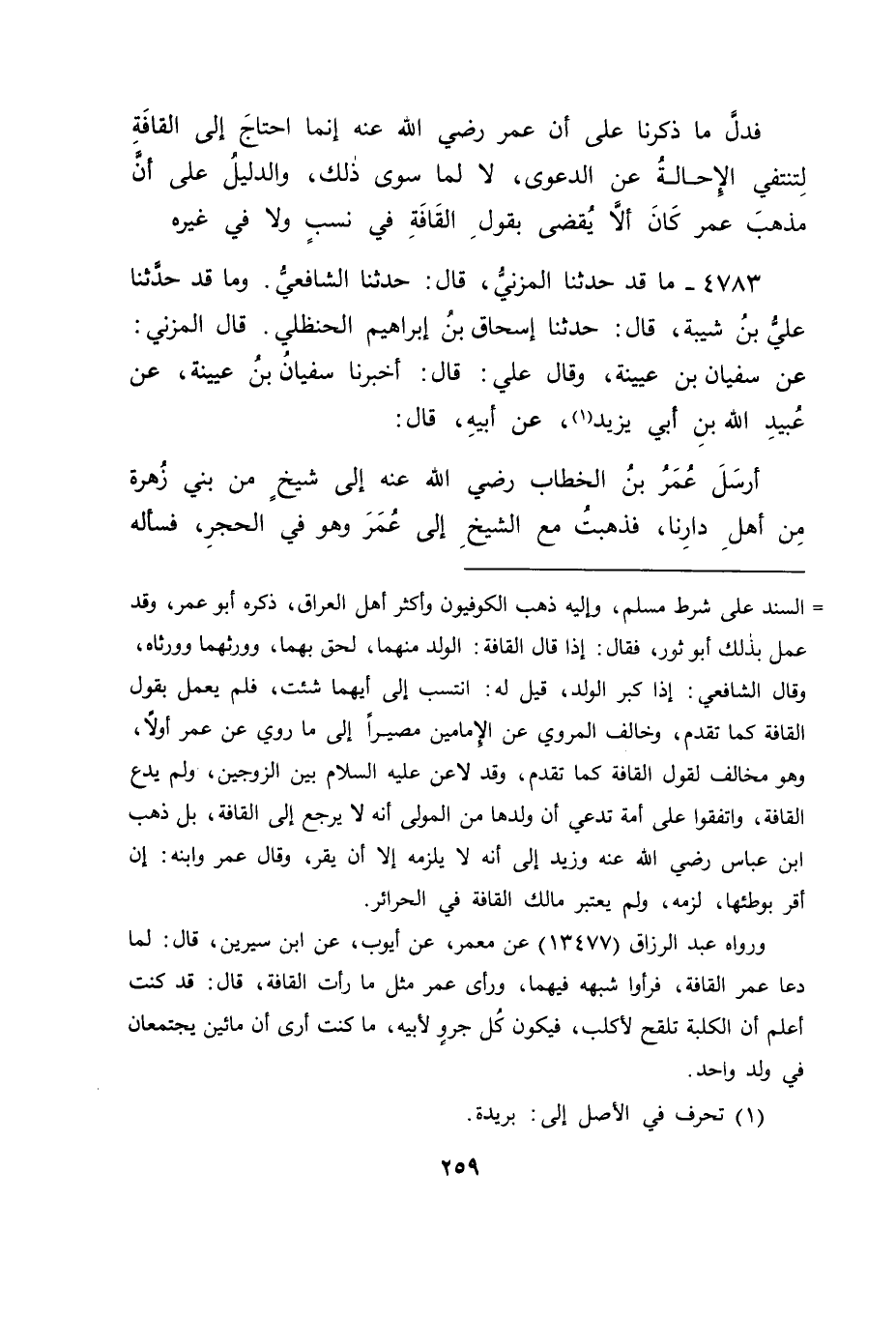 4783 - مَا قَدْ حَدَّثَنَا الْمُزَنِيُّ قَالَ: حَدَّثَنَا الشَّافِعِيُّ، وَمَا قَدْ حَدَّثَنَا عَلِيُّ بْنُ شَيْبَةَ قَالَ: حَدَّثَنَا إِسْحَاقُ بْنُ إِبْرَاهِيمَ الْحَنْظَلِيُّ، قَالَ الْمُزَنِيُّ , عَنْ سُفْيَانَ بْنِ عُيَيْنَةَ، وَقَالَ عَلِيٌّ: قَالَ: أَخْبَرَنَا سُفْيَانُ بْنُ عُيَيْنَةَ عَنْ عُبَيْدِ اللهِ بْنِ أَبِي يَزِيدَ، عَنْ أبيه قَالَ: أَرْسَلَ عُمَرُ بْنُ الْخَطَّابِ رَضِيَ اللهُ عَنْهُ إِلَى شَيْخٍ مِنْ بَنِي زُهْرَةَ مِنْ أَهْلِ دَارِنَا، فَذَهَبْتُ مَعَ الشَّيْخِ إِلَى عُمَرَ وَهُوَ فِي الْحِجْرِ، فَسَأَلَهُ -[260]- عَنْ وِلَادٍ مِنْ وِلَادِ الْجَاهِلِيَّةِ قَالَ: وَكَانَتِ الْمَرْأَةُ فِي الْجَاهِلِيَّةِ إِذَا طَلَّقَهَا زَوْجُهَا، أَوْ مَاتَ عَنْهَا، نَكَحَتْ بِغَيْرِ عِدَّةٍ، فَقَالَ الرَّجُلُ: أَمَّا النُّطْفَةُ فَمِنْ فُلَانٍ، وَأَمَّا الْوَلَدُ، فَعَلَى فِرَاشِ فُلَانٍ، فَقَالَ عُمَرُ: صَدَقَ، وَلَكِنَّ قَضَاءَ رَسُولِ اللهِ صَلَّى اللَّهُ عَلَيْهِ وَسَلَّمَ بِالْوَلَدِ لِلْفِرَاشِ " قَالَ أَبُو جَعْفَرٍ: أَفَلَا تَرَى أَنَّ عُمَرَ لَمْ يَلْتَفِتْ إِلَى مَا قَالَ ذَلِكَ الرَّجُلُ الْمَسْئُولُ فِي النُّطْفَةِ، وَهِيَ مَا سُئِلَ بِهِ الْقَافَةُ عَلَى مَا يَقُولُونَهُ فِي ذَلِكَ، وَرَدَّ الْحُكْمَ إِلَى مَا يُخَالِفُهُ مِمَّا كَانَ رَسُولُ اللهِ صَلَّى اللَّهُ عَلَيْهِ وَسَلَّمَ قَضَى بِهِ، وَمَا يُؤَكِّدُ ذَلِكَ أَيْضًا أَنَّ أَهْلَ الْإِسْلَامِ لَمْ يَخْتَلِفُوا فِي الرَّجُلِ يَنْفِي وَلَدَ زَوْجَتِهِ الَّتِي قَدْ وَلَدَتْهُ عَلَى فِرَاشِهِ، وَيَقُولُ: لَيْسَ هُوَ مِنِّي، وَتَقُولُ أُمُّهُ: هُوَ مِنْهُ أَنَّهُ يُلَاعِنُ بَيْنَهُمَا، وَيُنْفَى مِنْهُ، وَيُرَدُّ إِلَى أُمِّهِ، وَأَنَّ أُمَّهُ لَوْ جَاءَتْ لِجَمَاعَةٍ مِنَ الْقَافَةِ يَشْهَدُونَ لَهَا بِتَصْدِيقِهَا، وَأَنَّ الْوَلَدَ مِنْهُ أَنَّ قَوْلَهُمْ فِي ذَلِكَ كَلَا قَوْلٍ، وَأَنَّ حُكْمَ اللِّعَانِ الَّذِي يَكُونُ نَفْيِ نَسَبِهِ بِهِ مِنْهُ قَائِمًا عَلَى حَالِهِ، وَأَنَّ قَوْلَ الْقَافَةِ فِي ذَلِكَ لَيْسَ كَشَهَادَةٍ بَيِّنَةٍ عَادِلَةٍ عَلَيْهِ أَنَّهُ ابْنُهُ، هَذِهِ يُقْضَى بِهَا، وَلَا يُسْتَعْمَلُ مَعَهَا اللِّعَانُ وَفِي ذَلِكَ مَا قَدْ دَلَّ أَنَّ أَقْوَالَ الْقَافَةِ فِيمَا ذَكَرْنَا لَيْسَ بِحُجَّةٍ، وَإِنَّمَا كَانَتْ أَقْوَالُ الْقَافَةِ تُسْتَعْمَلُ فِي الْجَاهِلِيَّةِ فِي مِثْلِ هَذَا الْمَعْنَى فِي مَا -[261]- قَدْ نَفَاهُ رَسُولُ اللهِ صَلَّى اللَّهُ عَلَيْهِ وَسَلَّمَ، وَرَدَّ الْأَحْكَامَ إِلَى خِلَافِهِ مِمَّا أَهْلُ الْإِسْلَامِ عَلَيْهِ