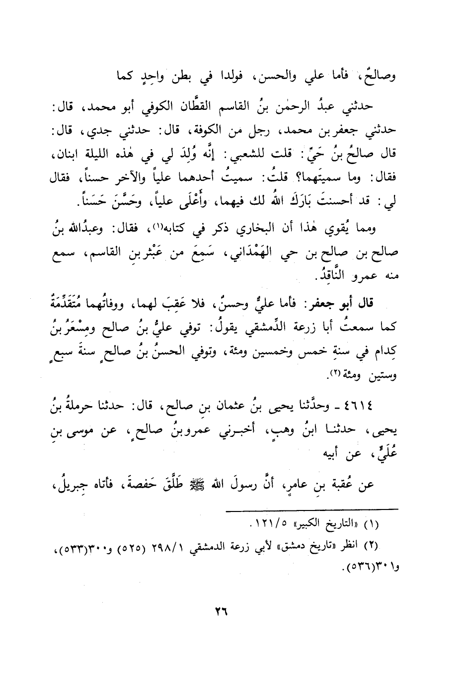 حَدَّثَنِي عَبْدُ الرَّحْمَنِ بْنُ الْقَاسِمِ الْقَطَّانُ الْكُوفِيُّ أَبُو مُحَمَّدٍ قَالَ: حَدَّثَنِي جَعْفَرُ بْنُ مُحَمَّدٍ رَجُلٌ مِنَ الْكُوفَةِ قَالَ: حَدَّثَنِي جَدِّي قَالَ: قَالَ صَالِحُ بْنُ حَيٍّ: قُلْتُ لِلشَّعْبِيِّ: " إِنَّهُ وُلِدَ لِي فِي هَذِهِ اللَّيْلَةِ ابْنَانِ، فَقَالَ: وَمَا سَمَّيْتَهُمَا؟ قُلْتُ: سَمَّيْتُ أَحَدَهُمَا عَلِيًّا، وَالْآخَرَ حَسَنًا، فَقَالَ لِي: " قَدْ أَحْسَنْتَ بَارَكَ اللهُ لَكَ فِيهِمَا، وَأَعْلَى عَلِيًّا، وَحَسَّنَ حَسَنًا " وَمِمَّا يُقَوِّي هَذَا أَنَّ الْبُخَارِيَّ ذَكَرَ فِي كِتَابِهِ، فَقَالَ: وَعَبْدُ اللهِ بْنُ صَالِحِ بْنِ صَالِحِ بْنِ حَيٍّ الْهَمْدَانِيُّ سَمِعَ مِنَ عَبْثَرَ بْنِ الْقَاسِمِ: سَمِعَ مِنْهُ عَمْرٌو النَّاقِدُ قَالَ أَبُو جَعْفَرٍ: فَأَمَّا عَلِيٌّ، وَحَسَنٌ، فَلَا عَقِبَ لَهُمَا، وَوَفَاتُهُمَا مُتَقَدِّمَةٌ كَمَا سَمِعْتُ أَبَا زُرْعَةَ الدِّمَشْقِيَّ يَقُولُ: تُوُفِّيَ عَلِيُّ بْنُ صَالِحٍ، وَمِسْعَرُ بْنُ كِدَامٍ فِي سَنَةِ خَمْسٍ وَخَمْسِينَ وَمِائَةٍ، وَتُوُفِّيَ الْحَسَنُ بْنُ صَالِحٍ سَنَةَ سَبْعٍ وَسِتِّينَ وَمِائَةٍ