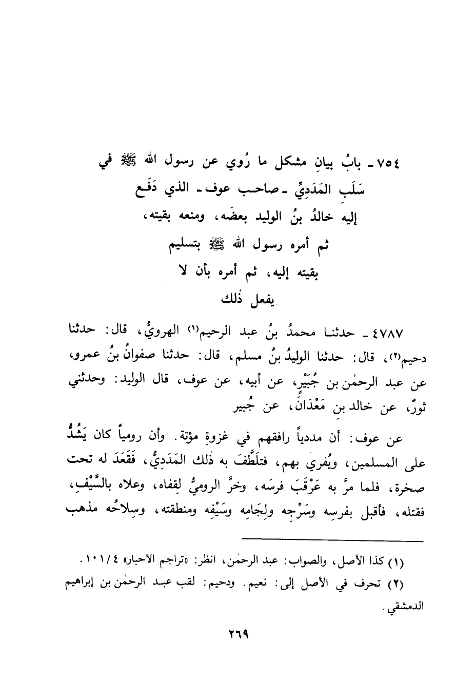 4787 - حَدَّثَنَا مُحَمَّدُ بْنُ عَبْدِ الرَّحِيمِ الْهَرَوِيُّ قَالَ: حَدَّثَنَا دُحَيْمٌ قَالَ: حَدَّثَنَا الْوَلِيدُ بْنُ مُسْلِمٍ قَالَ: حَدَّثَنَا صَفْوَانُ بْنُ عَمْرٍو , عَنْ عَبْدِ الرَّحْمَنِ بْنِ جُبَيْرٍ , عَنْ أَبِيهِ , عَنْ عَوْفٍ، قَالَ الْوَلِيدُ: وَحَدَّثَنِي ثَوْرٌ , عَنْ خَالِدِ بْنِ مَعْدَانَ , عَنْ جُبَيْرٍ عَنْ عَوْفٍ: أَنَّ مَدَدِيًّا رَافَقَهُمْ فِي غَزْوَةِ مُؤْتَةَ وَأَنَّ رُومِيًّا كَانَ يَشُدُّ عَلَى الْمُسْلِمِينَ، وَيَفْرِي بِهِمْ، فَتَلَطَّفَ بِهِ ذَلِكَ الْمَدَدِيُّ، فَقَعَدَ لَهُ تَحْتَ صَخْرَةٍ، فَلَمَّا مَرَّ بِهِ عَرْقَبَ فَرَسَهُ، وَخَرَّ الرُّومِيُّ لِقَفَاهُ، وَعَلَاهُ بِالسَّيْفِ، فَقَتَلَهُ، فَأَقْبَلَ بِفَرَسِهِ وَسَرْجِهِ وَلِجَامِهِ وَسَيْفِهِ وَمِنْطَقَتِهِ، وَسِلَاحُهُ مُذَهَّبٌ -[270]- بِالذَّهَبِ وَالْجَوْهَرِ إِلَى خَالِدِ بْنِ الْوَلِيدِ، فَأَخَذَ مِنْهُ خَالِدٌ طَائِفَةً، وَنَفَّلَهُ بَقِيَّتَهُ، فَقُلْتُ: يَا خَالِدُ، مَا هَذَا؟ مَا تَعْلَمُ أَنَّ رَسُولَ اللهِ صَلَّى اللَّهُ عَلَيْهِ وَسَلَّمَ سَلَّبَ الْقَاتِلَ السَّلَبَ كُلَّهُ قَالَ: بَلَى، وَلَكِنِّي اسْتَكْثَرْتُهُ، فَقُلْتُ: أَمَا وَاللهِ لَأُعَرِّفَنَّكَهَا عِنْدَ رَسُولِ اللهِ قَالَ عَوْفٌ: فَلَمَّا قَدِمْنَا عَلَى رَسُولِ اللهِ أَخْبَرْتُهُ خَبَرَهُ، فَدَعَاهُ وَأَمَرَهُ أَنْ يَدْفَعَ إِلَى الْمَدَدِيِّ بَقِيَّةَ سَلَبِهِ، فَوَلَّى خَالِدٌ لِيَفْعَلَ فَقُلْتُ: كَيْفَ رَأَيْتَ يَا خَالِدُ؟ أَوَلَمْ أُوَفِّ لَكَ مَا وَعَدْتُكَ؟ فَغَضِبَ رَسُولُ اللهِ، وَقَالَ: " يَا خَالِدُ، لَا تُعْطِهِ "، وَأَقْبَلَ عَلَيَّ، فَقَالَ " هَلْ أَنْتُمْ تَارِكُو أُمَرَائِي، لَكُمْ صَفْوَةُ أَمْرِهِمْ وَعَلَيْهِمْ -[271]- كَدَرُهُ " -[272]- فَفِي هَذَا الْحَدِيثِ: أَنَّ خَالِدَ بْنَ الْوَلِيدِ كَانَ دَفَعَ إِلَى الْمَدَدِيِّ بَعْضَ سَلَبِ قَتِيلِهِ، وَمَنَعَهُ مِنْ بَقِيَّتِهِ بَعْدَ عِلْمِهِ أَنَّ رَسُولَ اللهِ صَلَّى اللَّهُ عَلَيْهِ وَسَلَّمَ كَانَ يُسَلِّبُ الْقَاتِلَ سَلَبَ مَنْ قَتَلَهُ فَتَأَمَّلْنَا ذَلِكَ، فَاحْتُمِلَ عِنْدَنَا أَنْ يَكُونَ رَسُولُ اللهِ صَلَّى اللَّهُ عَلَيْهِ وَسَلَّمَ كَانَ لِا يَعْرِضُ لِلْقَاتِلِينَ فِي أَسْلَابِ قَتْلَاهُمْ، وَلَا بِوُجُوبِهَا لِلْقَاتِلِينَ، وَلَكِنْ لِسَمَاحَتِهِ بِهَا لَهُمْ، لَا بِوَاجِبٍ لَهُمْ فِيهَا وَالدَّلِيلُ عَلَى ذَلِكَ