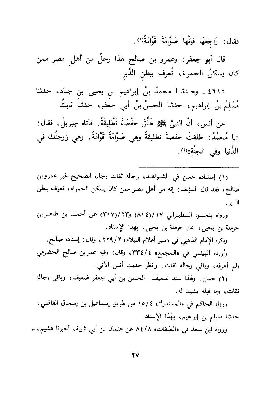4615 - وَحَدَّثَنَا مُحَمَّدُ بْنُ إِبْرَاهِيمَ بْنِ يَحْيَى بْنِ جُنَادٍ، حَدَّثَنَا مُسْلِمُ بْنُ إِبْرَاهِيمَ، حَدَّثَنَا الْحَسَنُ بْنُ أَبِي جَعْفَرٍ، حَدَّثَنَا ثَابِتٌ، عَنْ أَنَسٍ أَنَّ النَّبِيَّ صَلَّى اللَّهُ عَلَيْهِ وَسَلَّمَ طَلَّقَ حَفْصَةَ تَطْلِيقَةً، فَأَتَاهُ جِبْرِيلُ، فَقَالَ: " يَا مُحَمَّدُ طَلَّقْتَ حَفْصَةَ تَطْلِيقَةً وَهِيَ صَوَّامَةٌ قَوَّامَةٌ، وَهِيَ زَوْجَتُكَ فِي الدُّنْيَا وَفِي الْجَنَّةِ " -[28]- فَقَالَ قَائِلٌ: وَكَيْفَ تَقْبَلُونَ مِثْلَ هَذَا عَنْ رَسُولِ اللهِ صَلَّى اللَّهُ عَلَيْهِ وَسَلَّمَ أَنَّهُ يُطَلِّقُ زَوْجَةً مِنْ أَزْوَاجِهِ هِيَ زَوْجَتُهُ فِي الدُّنْيَا وَفِي الْجَنَّةِ، وَقَدْ كَانَ اللهُ عَزَّ وَجَلَّ خَيَّرَ أَزْوَاجَ نَبِيِّهِ، وَهِيَ مِنْهُنَّ بَيْنَ الدُّنْيَا وَالْآخِرَةِ، فَاخْتَرْنَ اللهَ وَرَسُولَهُ عَلَى الدُّنْيَا، فَشَكَرَ اللهُ ذَلِكَ لَهُنَّ، وَاحْتَبَسَهُ عَلَيْهِنَّ، وَاحْتَبَسَهُنَّ عَلَيْهِ، حَتَّى جَعَلَ لَهُنَّ أَنْ يَكُنَّ بَعْدَ مَوْتِهِ كَمَا كُنَّ فِي حَيَاتِهِ، لِأَنَّهَنَّ مَحْبُوسَاتٌ عَلَيْهِ، وَمُحَرَّمَاتٌ عَلَى مَنْ سِوَاهُ مِنَ النَّاسِ -[29]- فَكَانَ جَوَابُنَا لَهُ فِي ذَلِكَ: أَنَّهُ وَإِنْ كَانَ صَلَّى اللَّهُ عَلَيْهِ وَسَلَّمَ قَدْ طَلَّقَهَا، فَلَمْ يُخْرِجْهَا بِذَلِكَ مِنْ أَزْوَاجِهِ الْمُسْتَحِقَّاتِ فِي الدُّنْيَا وَالْآخِرَةِ مَا اسْتَحَقَّتْهُ مَنْ لَمْ يُطَلِّقْهَا مِنْ أَزْوَاجِهِ، وَإِنَّمَا كَانَ طَلَاقُهُ لَهَا طَلَاقًا لَمْ يَقْطَعِ السَّبَبَ الَّذِي بَيْنَهُ وَبَيْنَهَا؛ لِأَنَّهُ كَانَ طَلَاقًا رَجْعِيًّا، ثُمَّ كَانَ بِحَمْدِ اللهِ وَنِعْمَتِهِ مِنْهُ فِيهَا مَا كَانَ مِنْ مُرَاجَعَتِهِ إِيَّاهَا إِلَى مَا كَانَتْ عَلَيْهِ قَبْلَ طَلَاقِهِ إِيَّاهَا رَضِيَ اللهُ عَنْهَا، فَإِنْ قَالَ هَذَا الْقَائِلُ: فَلَوِ انْقَضَتْ عِدَّتُهَا وَلَمْ يُرَاجِعْهَا، أَكَانَتْ بِذَلِكَ تَخْرُجُ مِنْ جُمْلَةِ أُمَّهَاتِ الْمُؤْمِنِينَ، حَتَّى لَا تَكُونَ أُمًّا لَهُمْ كَمَا كَانَتْ قَبْلَ ذَلِكَ؟ كَانَ جَوَابُنَا لَهُ فِي ذَلِكَ: أَنَّ ذَلِكَ لَوْ كَانَ، لَمَا خَرَجَتْ مِنْ جُمْلَةِ أُمَّهَاتِ الْمُؤْمِنِينَ، وَلَكَانَتْ بَعْدَهُ أُمًّا لَهُمْ، وَأَنَّ حُرْمَتَهَا عَلَيْهِمْ كَحُرْمَتِهَا عَلَيْهِمْ قَبْلَ ذَلِكَ، وَأَنَّهَا زَوْجَةٌ لِرَسُولِ اللهِ صَلَّى اللَّهُ عَلَيْهِ وَسَلَّمَ فِي الْجَنَّةِ كَمَا لَا يُخْرِجُهَا الْمَوْتُ مِنْ ذَلِكَ، لَوْ كَانَ مَاتَ عَنْهَا، وَهِيَ بَعْدَ مَوْتِهِ تَسْتَحِقُّ النَّفَقَةَ عَلَيْهَا مِمَّا كَانَ يُنْفِقُ عَلَيْهَا مِنْهُ فِي حَيَاتِهِ؛ لِأَنَّهَا مَحْبُوسَةٌ عَلَيْهِ بَعْدَ مَوْتِهِ، كَمَا كَانَتْ مَحْبُوسَةً عَلَيْهِ فِي حَيَاتِهِ، وَفِيمَا ذَكَرْنَا بَيَانٌ لِمَا قَدْ تَوَهَّمَهُ هَذَا الْقَائِلُ، وَبِاللهِ التَّوْفِيقِ