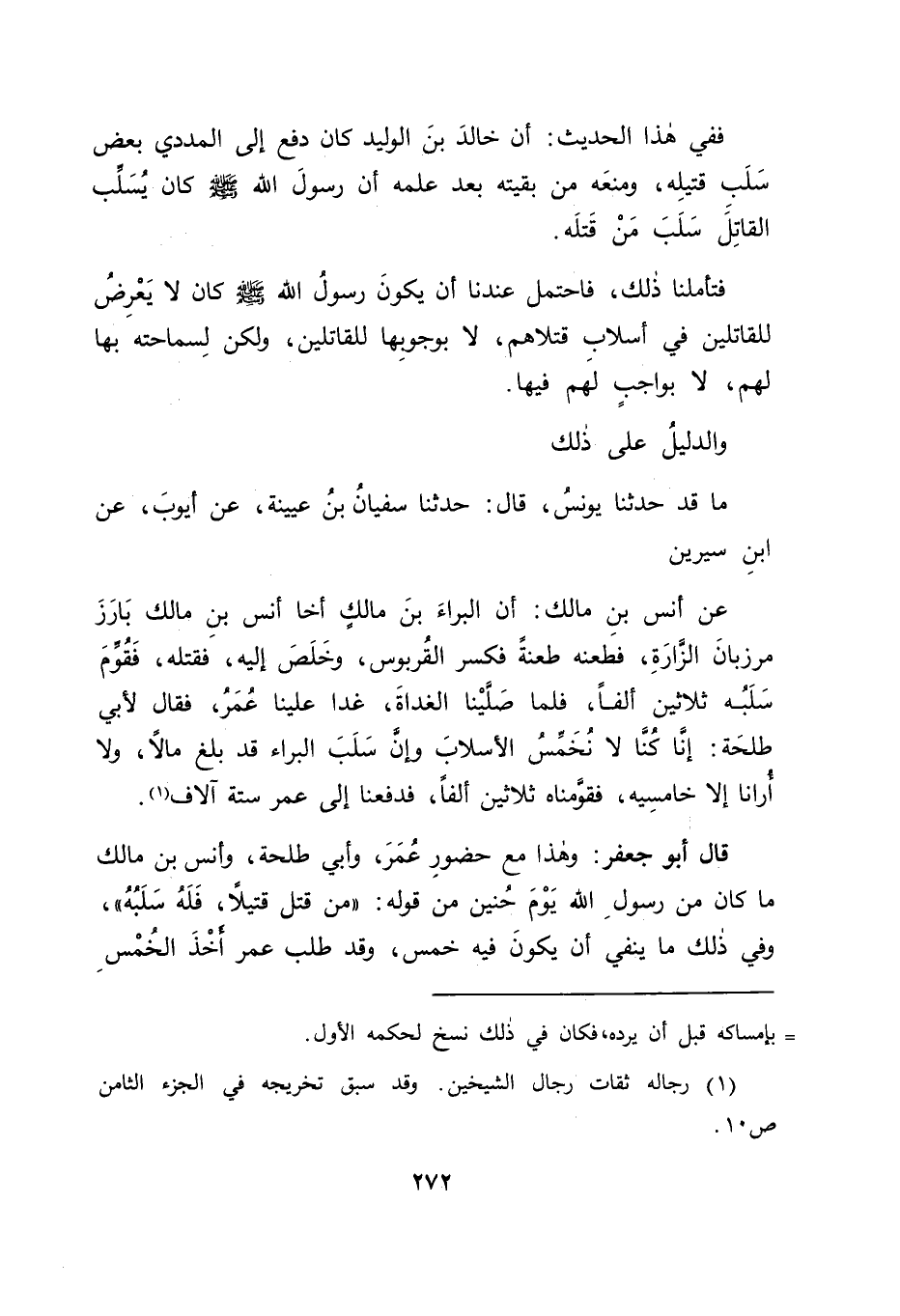 مَا قَدْ حَدَّثَنَا يُونُسُ قَالَ: حَدَّثَنَا سُفْيَانُ بْنُ عُيَيْنَةَ , عَنْ أَيُّوبَ , عَنِ ابْنِ سِيرِينَ عَنْ أَنَسِ بْنِ مَالِكٍ: أَنَّ الْبَرَاءَ بْنَ مَالِكٍ أَخَا أَنَسِ بْنِ مَالِكٍ بَارَزَ مَرْزُبَانَ الزَّارَةِ، فَطَعَنَهُ طَعْنَةً فَكَسَرَ الْقُرْبُوسَ، وَخَلَصَ إِلَيْهِ، فَقَتَلَهُ، فَقُوِّمَ سَلَبُهُ ثَلَاثِينَ أَلْفًا، فَلَمَّا صَلَّيْنَا الْغَدَاةَ، غَدَا عَلَيْنَا عُمَرُ، فَقَالَ لِأَبِي طَلْحَةَ: إِنَّا كُنَّا لَا نُخَمِّسُ الْأَسْلَابَ، وَإِنَّ سَلَبَ الْبَرَاءِ قَدْ بَلَغَ مَالًا، وَلَا أُرَانَا إِلَّا خَامِسِيهِ، فَقَوَّمْنَاهُ ثَلَاثِينَ أَلْفًا، فَدَفَعْنَا إِلَى عُمَرَ سِتَّةَ آلَافٍ قَالَ أَبُو جَعْفَرٍ: وَهَذَا مَعَ حُضُورِ عُمَرَ، وَأَبِي طَلْحَةَ، وَأَنَسِ بْنِ مَالِكٍ مَا كَانَ مِنْ رَسُولِ اللهِ يَوْمَ حُنَيْنٍ مِنْ قَوْلِهِ: " مَنْ قَتَلَ قَتِيلًا، فَلَهُ سَلَبُهُ "، وَفِي ذَلِكَ مَا يَنْفِي أَنْ يَكُونَ فِيهِ خُمُسٌ، وَقَدْ طَلَبَ عُمَرُ أَخْذَ الْخُمُسِ -[273]- مِنْ سَلَبِ الْبَرَاءِ، فَدَلَّ ذَلِكَ: أَنَّهُمْ كَانُوا يَتْرُكُونَ أَخْمَاسَ الْأَسْلَابِ لَا بِوَاجِبٍ عَلَيْهِمْ تَرْكُهَا، وَلَكِنْ سَمَاحَةٍ مِنْهُمْ بِهَا لِلْقَاتِلِينَ لِأَهْلِهَا، وَإِذَا كَانَ ذَلِكَ كَذَلِكَ فِي أَخْمَاسِ الْأَسْلَابِ كَانَ كَذَلِكَ هُوَ فِي بَقِيَّتُهَا، فَكَانَ مِنْ ذَلِكَ مَا كَانَ مِمَّا لَهُ أَنْ يَمْنَعَ مِنْهُ، وَكَانَ مِنْهُ مَا كَانَ مِمَّا لَهُ أَنْ يَسْمَحَ بِهِ، وَإِمْضَاءُ رَسُولِ اللهِ صَلَّى اللَّهُ عَلَيْهِ وَسَلَّمَ قَبْلَ قَوْلِ عَوْفٍ، وَبَعْدَ قَوْلِهِ عَلَى مَا أَمْضَى الْأَمْرَ عَلَيْهِ بِمَا قَدْ كَانَ لَهُ أَنْ يُمْضِيَهُ عَلَيْهِ، وَفِي ذَلِكَ مَا قَدْ دَلَّ أَنَّ أَسْلَابَ الْقَتْلَى لَا تُسْتَحَقُّ إِلَّا بِقَوْلٍ مُتَقَدِّمٍ مِنَ الْإِمَامِ: " مَنْ قَتَلَ قَتِيلًا، فَلَهُ سَلَبُهُ "، فَذَلِكَ الَّذِي لَا يَجُوزُ أَنْ يُمْنَعَ مِنْهُ بِحَالٍ مِنَ الْأَحْوَالِ، وَاللهَ نَسْأَلُهُ التَّوْفِيقَ