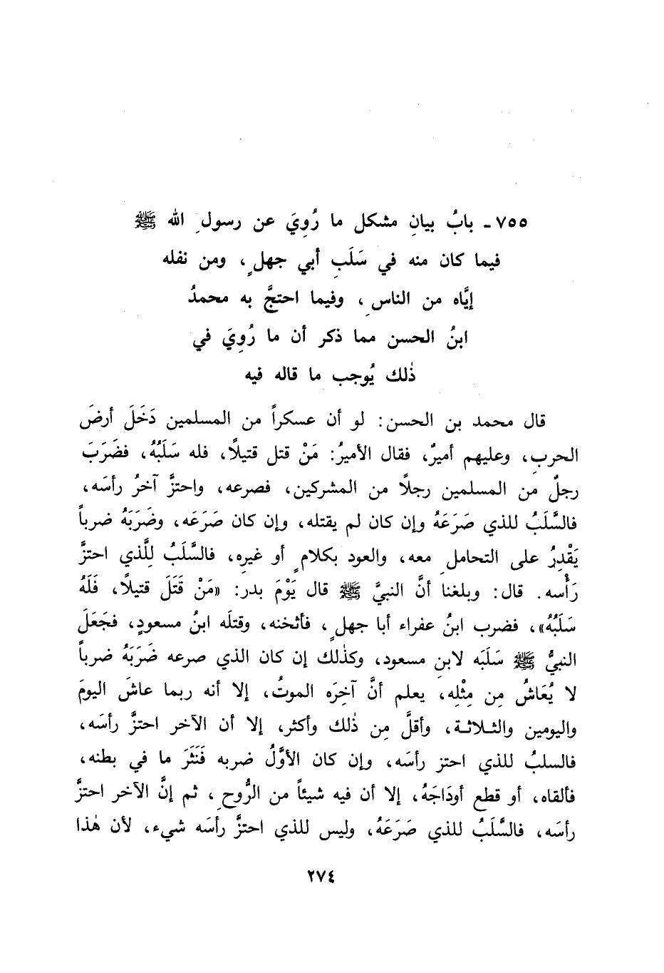 بَابُ بَيَانِ مُشْكِلِ مَا رُوِيَ عَنْ رَسُولِ اللهِ صَلَّى اللَّهُ عَلَيْهِ وَسَلَّمَ فِيمَا كَانَ مِنْهُ فِي سَلَبِ أَبِي جَهْلٍ، وَمِنْ نَفْلِهِ إِيَّاهُ مِنَ النَّاسِ، وَفِيمَا احْتَجَّ بِهِ مُحَمَّدُ بْنُ الْحَسَنِ مِمَّا ذَكَرَ أَنَّ مَا رُوِيَ فِي ذَلِكَ يُوجِبُ مَا قَالَهُ فِيهِ قَالَ مُحَمَّدُ بْنُ الْحَسَنِ: " لَوْ أَنَّ عَسْكَرًا مِنَ الْمُسْلِمِينَ دَخَلَ أَرْضَ الْحَرْبِ، وَعَلَيْهِمْ أَمِيرٌ، فَقَالَ الْأَمِيرُ: مَنْ قَتَلَ قَتِيلًا، فَلَهُ سَلَبُهُ، فَضَرَبَ رَجُلٌ مِنَ الْمُسْلِمِينَ رَجُلًا مِنَ الْمُشْرِكِينَ، فَصَرَعَهُ، وَاحْتَزَّ آخِرَ رَأْسِهِ، " فَالسَّلَبُ لِلَّذِي صَرَعَهُ، وَإِنْ كَانَ لَمْ يَقْتُلْهُ، وَإِنْ كَانَ صَرَعَهُ، وَضَرَبَهُ ضَرْبًا يَقْدِرُ عَلَى التَّحَامُلِ مَعَهُ، وَالْعَوْدِ بِكَلَامٍ أَوْ غَيْرِهِ، فَالسَّلَبُ لِلَّذِي احْتَزَّ رَأْسَهُ قَالَ: وَبَلَغَنَا أَنَّ النَّبِيَّ صَلَّى اللَّهُ عَلَيْهِ وَسَلَّمَ قَالَ يَوْمَ بَدْرٍ: " مَنْ قَتَلَ قَتِيلًا، فَلَهُ سَلَبُهُ "، فَضَرَبَ ابْنُ عَفْرَاءَ أَبَا جَهْلٍ، فَأَثْخَنَهُ، وَقَتَلَهُ ابْنُ مَسْعُودً، فَجَعَلَ النَّبِيُّ صَلَّى اللَّهُ عَلَيْهِ وَسَلَّمَ سَلَبَهُ لِابْنِ مَسْعُودٍ، وَكَذَلِكَ إِنْ كَانَ الَّذِي صَرَعَهُ ضَرَبَهُ ضَرْبًا لَا يُعَاشُ مِنْ مِثْلِهِ، يُعْلَمُ أَنَّ آخِرَهُ الْمَوْتُ، إِلَّا أَنَّهُ رُبَّمَا عَاشَ الْيَوْمَ وَالْيَوْمَيْنِ وَالثَّلَاثَةَ، وَأَقَلَّ مِنْ ذَلِكَ وَأَكْثَرَ إِلَّا أَنَّ الْآخَرَ احْتَزَّ رَأْسَهُ، فَالسَّلَبُ لِلَّذِي احْتَزَّ رَأْسَهُ، وَإِنْ كَانَ الْأَوَّلُ ضَرَبَهُ فَنَثَرَ مَا فِي بَطْنِهِ، فَأَلْقَاهُ، أَوْ قَطَعَ أَوْدَاجَهُ، إِلَّا أَنَّ فِيهِ شَيْئًا مِنَ الرُّوحِ، ثُمَّ إِنَّ الْآخَرَ احْتَزَّ رَأْسَهُ، فَالسَّلَبُ لِلَّذِي صَرَعَهُ، وَلَيْسَ لِلَّذِي احْتَزَّ رَأْسَهُ شَيْءٌ؛ لِأَنَّ هَذَا