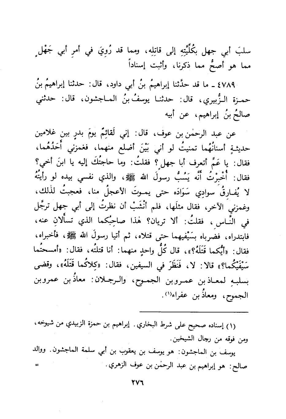 4789 - مَا قَدْ حَدَّثَنَا إِبْرَاهِيمُ بْنُ أَبِي دَاوُدَ قَالَ: حَدَّثَنَا إِبْرَاهِيمُ بْنُ حَمْزَةَ الزُّبَيْرِيُّ قَالَ: حَدَّثَنَا يُوسُفُ بْنُ الْمَاجِشُونِ قَالَ: حَدَّثَنِي صَالِحُ بْنُ إِبْرَاهِيمَ , عَنْ أَبِيهِ عَنْ عَبْدِ الرَّحْمَنِ بْنِ عَوْفٍ قَالَ: إِنِّي لَقَائِمٌ يَوْمَ بَدْرٍ بَيْنَ غُلَامَيْنِ حَدِيثَةٍ أَسْنَانُهُمَا تَمَنَّيْتُ لَوْ أَنِّي بَيْنَ أَضْلُعٍ مِنْهُمَا، فَغَمَزَنِي أَحَدُهُمَا، فَقَالَ: يَا عَمِّ , أَتَعْرِفُ أَبَا جَهْلٍ؟ فَقُلْتُ: وَمَا حَاجَتُكَ إِلَيْهِ يَا ابْنَ أَخِي؟ فَقَالَ: أُخْبِرْتُ أَنَّهُ يَسُبُّ رَسُولَ اللهِ صَلَّى اللَّهُ عَلَيْهِ وَسَلَّمَ، وَالَّذِي نَفْسِي بِيَدِهِ لَوْ رَأَيْتُهُ لَا يُفَارِقُ سَوَادِي سَوَادَهُ حَتَّى يَمُوتَ الْأَعْجَلُ مِنَّا، فَعَجِبْتُ لِذَلِكَ وَغَمَزَنِي الْآخَرُ، فَقَالَ مِثْلَهَا، فَلَمْ أَنْشَبْ أَنْ نَظَرْتُ إِلَى أَبِي جَهْلٍ تَرَجَّلَ فِي النَّاسِ، فَقُلْتُ: أَلَا تَرَيَانِ؟ هَذَا صَاحِبُكُمَا الَّذِي تَسْأَلَانِ عَنْهُ، فَابْتَدَرَاهُ، فَضَرَبَاهُ بِسَيْفَيْهِمَا حَتَّى قَتَلَاهُ، ثُمَّ أَتَيَا رَسُولَ اللهِ صَلَّى اللَّهُ عَلَيْهِ وَسَلَّمَ، فَأَخْبَرَاهُ، فَقَالَ: " أَيُّكُمَا قَتَلَهُ؟ " قَالَ كُلُّ وَاحِدٍ مِنْهُمَا: أَنَا قَتَلْتُهُ، فَقَالَ: " أَمَسَحْتُمَا سَيْفَيْكُمَا؟ " قَالَا: لَا، فَنَظَرَ فِي السَّيْفَيْنِ، فَقَالَ: كِلَاكُمَا قَتَلَهُ "، وَقَضَى بِسَلَبِهِ لِمُعَاذِ بْنِ عَمْرِو بْنِ الْجَمُوحِ، وَالرِّجْلَانِ: مُعَاذُ بْنُ عَمْرِو بْنِ الْجَمُوحِ، وَمُعَاذُ بْنُ عَفْرَاءَ -[277]- فَفِي هَذَا الْحَدِيثِ قَضَى رَسُولُ اللهِ صَلَّى اللَّهُ عَلَيْهِ وَسَلَّمَ بِالسَّلَبِ لِأَحَدِ رَجُلَيْنِ قَدْ أَخْبَرَا رَسُولَ اللهِ قَبْلَ ذَلِكَ: أَنَّ كِلَيْهِمَا قَدْ قَتَلَهُ، فَفِي ذَلِكَ مَا قَدْ دَلَّ أَنَّهُ لَمْ يَكُنْ لِسَلَبِهِ مُسْتَحِقٌّ بِعَيْنِهِ، وَإِنَّمَا كَانَ سَلَبُهُ مَرْدُودًا إِلَى مَا يَرَاهُ رَسُولُ اللهِ فِيهِ مِنْ سَمَاحٍ بِهِ لِمَنْ يَقْتُلُهُ، وَمِمَّا سِوَى ذَلِكَ، وَالدَّلِيلُ عَلَى هَذَا أَيْضًا: دَفْعُ بَعْضِ سَلَبِهِ إِلَى ابْنِ مَسْعُودٍ، وَمَنْعُهُ بَقِيَّتَهُ، وَدَفَعَ بَقِيَّةِ سَلَبِهِ بَعْدَ الَّذِي نَفَّلَهُ مِنْهُ ابْنُ مَسْعُودٍ؟ إِلَى مُعَاذِ بْنِ عَمْرٍو دُونَ مُعَاذِ بْنِ عَفْرَاءَ، وَفِي هَذَا مَا قَدْ دَلَّ عَلَى أَنَّ رَسُولَ اللهِ صَلَّى اللَّهُ عَلَيْهِ وَسَلَّمَ لَمْ يَكُنْ تَقَدَّمَ مِنْهُ يَوْمَئِذٍ مَا ذَكَرَ مُحَمَّدُ بْنُ الْحَسَنِ: أَنَّهُ كَانَ تَقَدَّمَ مِنْهُ مِنَ الْقَوْلِ يَوْمَئِذٍ، وَأَنَّ ذَلِكَ إِنَّمَا كَانَ مِمَّا سَمَحَ بِهِ لِمَنْ شَاءَ أَنْ يَسْمَحَ بِهِ لَهُ، وَمِمَّا مَنَعَ مِنْ سِوَاهُ مِمَّا مَنَعَهُ مِنْهُ مِنْ قَتَلَةِ أَبِي جَهْلٍ، لَا لِمَا قَالَهُ مُحَمَّدُ بْنُ الْحَسَنِ مِمَّا ذَكَرْنَاهُ عَنْهُ، وَاللهَ نَسْأَلُهُ التَّوْفِيقَ