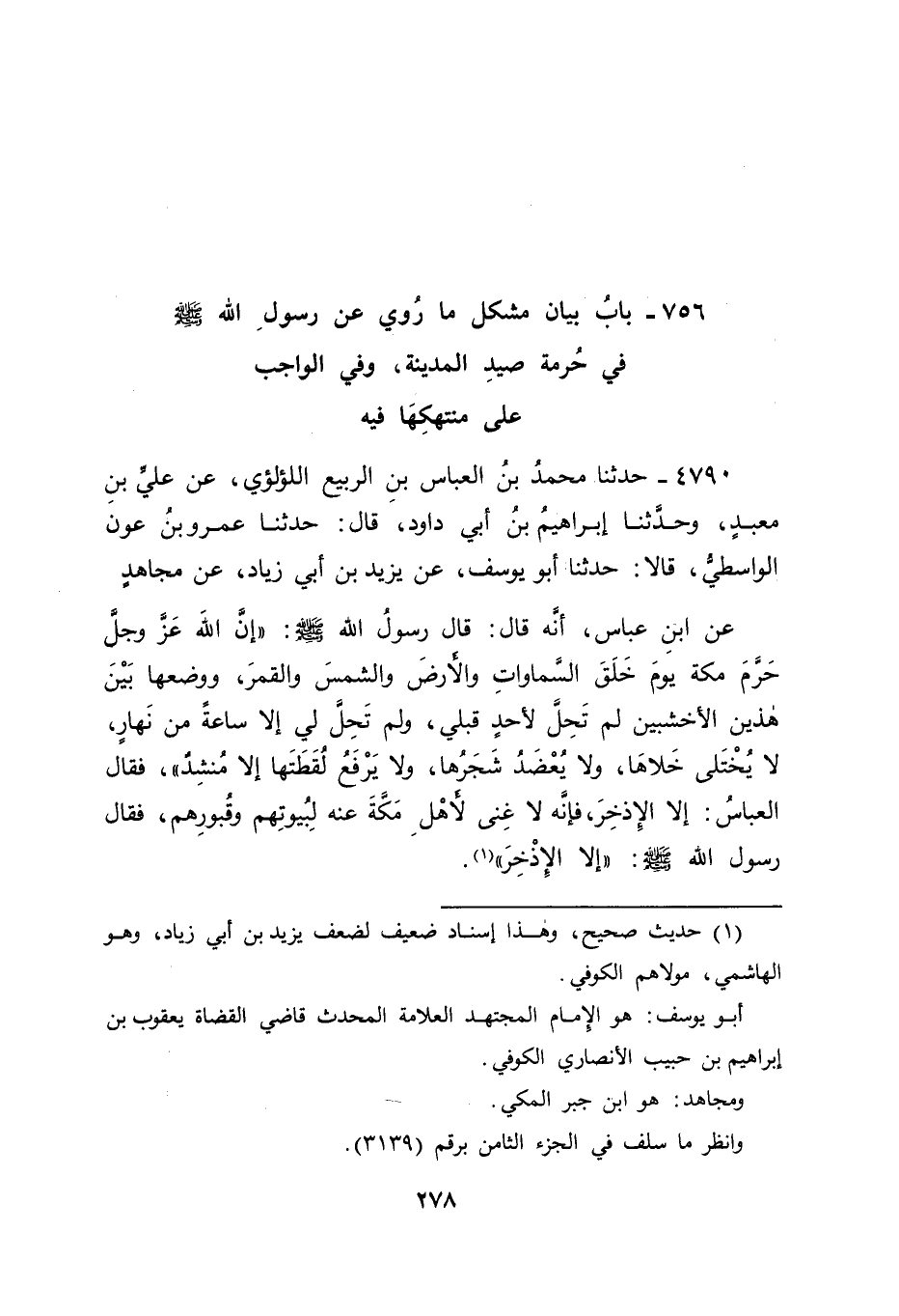 4790 - حَدَّثَنَا مُحَمَّدُ بْنُ الْعَبَّاسِ بْنِ الرَّبِيعِ اللُّؤْلُؤِيُّ , عَنْ عَلِيِّ بْنِ مَعْبَدٍ، وَحَدَّثَنَا إِبْرَاهِيمُ بْنُ أَبِي دَاوُدَ قَالَ: حَدَّثَنَا عَمْرُو بْنُ عَوْنٍ الْوَاسِطِيُّ قَالَا: حَدَّثَنَا أَبُو يُوسُفَ , عَنْ يَزِيدَ بْنِ أَبِي زِيَادٍ , عَنْ مُجَاهِدٍ، عَنِ ابْنِ عَبَّاسٍ أَنَّهُ قَالَ: قَالَ رَسُولُ اللهِ صَلَّى اللَّهُ عَلَيْهِ وَسَلَّمَ: " إِنَّ اللهَ عَزَّ وَجَلَّ حَرَّمَ مَكَّةَ يَوْمَ خَلَقَ السَّمَوَاتِ وَالْأَرْضَ، وَالشَّمْسَ وَالْقَمَرَ، وَوَضَعَهَا بَيْنَ هَذَيْنِ الْأَخْشَبَيْنِ لَمْ تَحِلَّ لِأَحَدٍ قَبْلِي، وَلَمْ تَحِلَّ لِي إِلَّا سَاعَةً مِنْ نَهَارٍ، لَا يُخْتَلَى خَلَاهَا، وَلَا يُعْضَدُ شَجَرُهَا، وَلَا يَرْفَعُ لُقَطَتُهَا إِلَّا مُنْشِدٌ " , فَقَالَ الْعَبَّاسُ: إِلَّا الْإِذْخِرَ، فَإِنَّهُ لَا غِنَى لِأَهْلِ مَكَّةَ عَنْهُ لِبُيُوتِهِمْ وَقُبُورِهِمْ، فَقَالَ رَسُولُ اللهِ صَلَّى اللَّهُ عَلَيْهِ وَسَلَّمَ: " إِلَّا الْإِذْخِرَ " -[279]- قَالَ أَبُو جَعْفَرٍ: فَفِي هَذَا الْحَدِيثِ: أَنَّ تَحْرِيمَ مَكَّةَ كَانَ بِتَحْرِيمِ اللهِ إِيَّاهَا يَوْمَ خَلَقَ السَّمَوَاتِ وَالْأَرْضَ وَالشَّمْسَ وَالْقَمَرَ، وَوَضْعِهِ إِيَّاهَا بَيْنَ الْأَخْشَبَيْنِ اللَّذَيْنِ وَضَعَهَا بَيْنَهُمَا