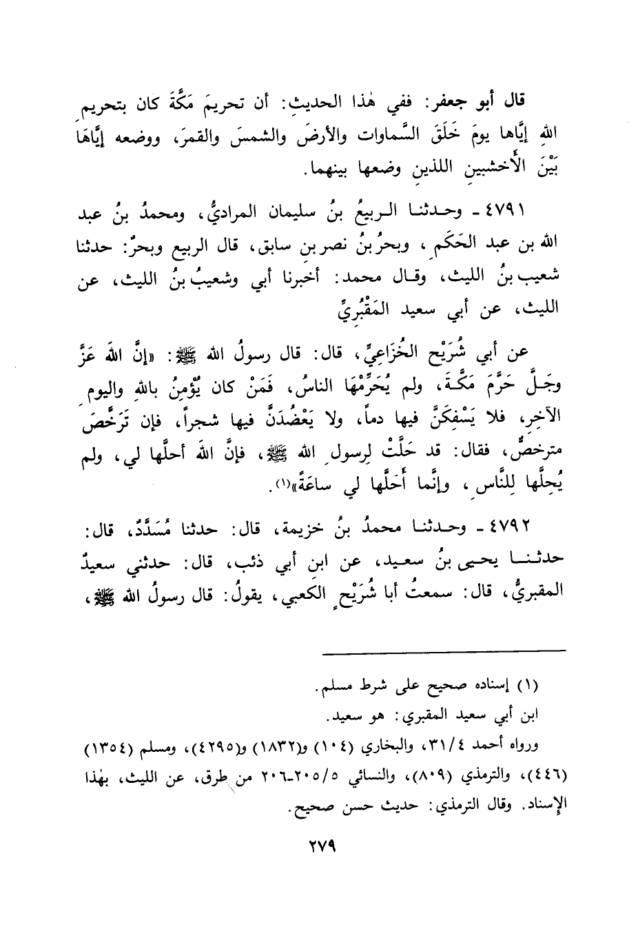 4791 - وَحَدَّثَنَا الرَّبِيعُ بْنُ سُلَيْمَانَ الْمُرَادِيُّ، وَمُحَمَّدُ بْنُ عَبْدِ اللهِ بْنِ عَبْدِ الْحَكَمِ، وَبَحْرُ بْنُ نَصْرِ بْنِ سَابِقٍ قَالَ الرَّبِيعُ، وَبَحْرٌ: حَدَّثَنَا شُعَيْبُ بْنُ اللَّيْثِ، وَقَالَ مُحَمَّدٌ: أَخْبَرَنَا أَبِي، وَشُعَيْبُ بْنُ اللَّيْثِ , عَنِ اللَّيْثِ , عَنْ أَبِي سَعِيدٍ الْمَقْبُرِيِّ عَنْ أَبِي شُرَيْحٍ الْخُزَاعِيِّ قَالَ: قَالَ رَسُولُ اللهِ صَلَّى اللَّهُ عَلَيْهِ وَسَلَّمَ: " إِنَّ اللهَ عَزَّ وَجَلَّ حَرَّمَ مَكَّةَ، وَلَمْ يُحَرِّمْهَا النَّاسُ، فَمَنْ كَانَ يُؤْمِنُ بِاللهِ وَالْيَوْمِ الْآخِرِ، فَلَا يَسْفِكَنَّ فِيهَا دَمًا، وَلَا يَعْضُدَنَّ فِيهَا شَجَرًا، فَإِنْ تَرَخَّصَ مُتَرَخِّصٌ، فَقَالَ: قَدْ حَلَّتْ لِرَسُولِ اللهِ صَلَّى اللَّهُ عَلَيْهِ وَسَلَّمَ، فَإِنَّ اللهَ أَحَلَّهَا لِي، وَلَمْ يُحِلَّهَا لِلنَّاسِ، وَإِنَّمَا أَحَلَّهَا لِي سَاعَةً "