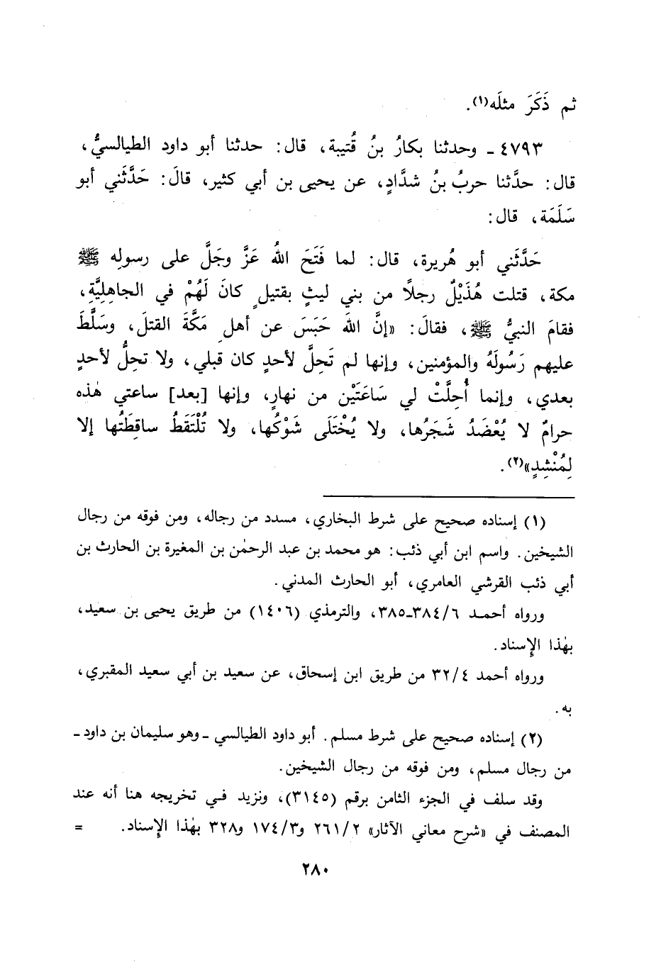 4793 - وَحَدَّثَنَا بَكَّارُ بْنُ قُتَيْبَةَ قَالَ: حَدَّثَنَا أَبُو دَاوُدَ الطَّيَالِسِيُّ قَالَ: حَدَّثَنَا حَرْبُ بْنُ شَدَّادٍ , عَنْ يَحْيَى بْنِ أَبِي كَثِيرٍ قَالَ: حَدَّثَنِي أَبُو سَلَمَةَ قَالَ: حَدَّثَنِي أَبُو هُرَيْرَةَ قَالَ: لَمَّا فَتَحَ اللهُ عَزَّ وَجَلَّ عَلَى رَسُولِهِ صَلَّى اللَّهُ عَلَيْهِ وَسَلَّمَ مَكَّةَ، قَتَلَتْ هُذَيْلٌ رَجُلًا مِنْ بَنِي لَيْثٍ بِقَتِيلٍ كَانَ لَهُمْ فِي الْجَاهِلِيَّةِ، فَقَامَ النَّبِيُّ صَلَّى اللَّهُ عَلَيْهِ وَسَلَّمَ، فَقَالَ: " إِنَّ اللهَ حَبَسَ عَنْ أَهْلِ مَكَّةَ الْقَتْلَ، وَسَلَّطَ عَلَيْهِمْ رَسُولَهُ وَالْمُؤْمِنِينَ، وَإِنَّهَا لَمْ تَحِلَّ لِأَحَدٍ كَانَ قَبْلِي، وَلَا تَحِلُّ لِأَحَدٍ بَعْدِي، وَإِنَّمَا أُحِلَّتْ لِي سَاعَتَيْنِ مِنْ نَهَارٍ، وَإِنَّهَا بَعْدَ سَاعَتَيَّ هَذِهِ حَرَامٌ لَا يُعْضَدُ شَجَرُهَا، وَلَا يُخْتَلَى شَوْكُهَا، وَلَا تُلْتَقَطُ سَاقِطَتُهَا إِلَّا لِمُنْشِدٍ " -[281]-