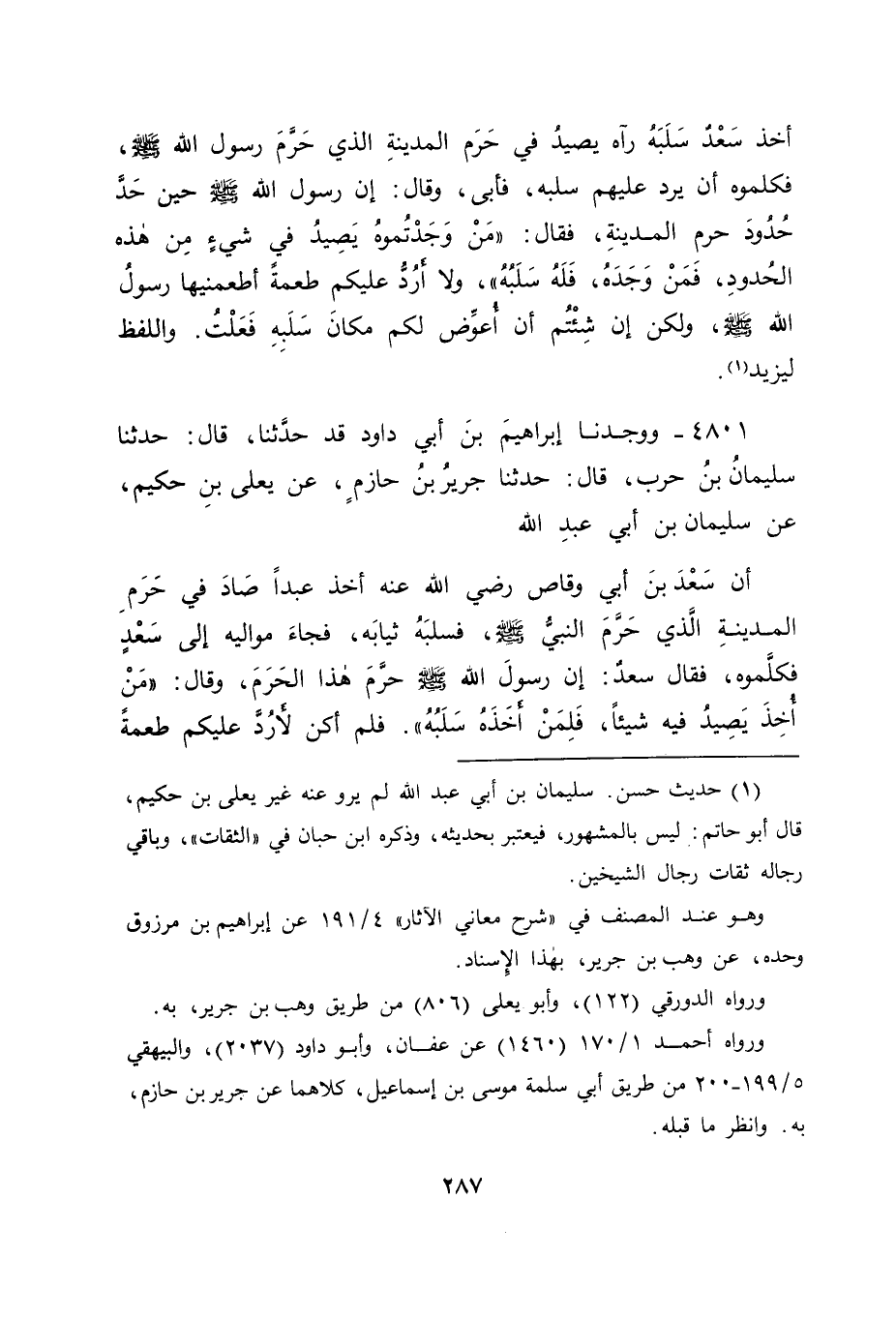 4801 - وَوَجَدْنَا إِبْرَاهِيمُ بْنُ أَبِي دَاوُدَ قَدْ حَدَّثَنَا قَالَ: حَدَّثَنَا سُلَيْمَانُ بْنُ حَرْبٍ قَالَ: حَدَّثَنَا جَرِيرُ بْنُ حَازِمٍ , عَنْ يَعْلَى بْنِ حَكِيمٍ، عَنْ سُلَيْمَانَ بْنِ أَبِي عَبْدِ اللهِ أَنَّ سَعْدَ بْنَ أَبِي وَقَّاصٍ رَضِيَ اللهُ عَنْهُ أَخَذَ عَبْدًا صَادَ فِي حَرَمِ الْمَدِينَةِ الَّذِي حَرَّمَ النَّبِيُّ صَلَّى اللَّهُ عَلَيْهِ وَسَلَّمَ، فَسَلَبَهُ ثِيَابَهُ، فَجَاءَ مَوَالِيهِ إِلَى سَعْدٍ فَكَلَّمُوهُ , فَقَالَ سَعْدٌ: إِنَّ رَسُولَ اللهِ صَلَّى اللَّهُ عَلَيْهِ وَسَلَّمَ حَرَّمَ هَذَا الْحَرَمَ، وَقَالَ: " مَنْ أَخَذَ يَصِيدُ فِيهِ شَيْئًا فَلِمَنْ أَخَذَهُ سَلَبُهُ " فَلَمْ أَكُنْ لِأَرُدَّ عَلَيْكُمْ طُعْمَةً -[288]- أَطْعَمَنِيهَا رَسُولُ اللهِ صَلَّى اللَّهُ عَلَيْهِ وَسَلَّمَ، وَلَكِنْ إِنْ شِئْتُمْ أَعْطَيْتُكُمْ ثَمَنَهُ فَكَانَ فِي هَذَا مَا قَدْ دَلَّنَا أَنَّ الْوَاجِبَ فِي انْتِهَاكِ الصَّيْدِ وَالْعِضَاهِ بَيْنَ لَابَتَيِ الْمَدِينَةِ غَيْرُ الْوَاجِبِ فِي انْتِهَاكِهِمَا فِي حُرْمَةِ مَكَّةَ؛ لِأَنَّ الْوَاجِبَ فِي انْتِهَاكِهِمَا فِي حُرْمَةِ مَكَّةَ مَا قَدْ ذَكَرْنَاهُ فِي هَذَا الْبَابِ فِي ذَلِكَ، وَالْوَاجِبُ فِي انْتِهَاكِ حُرْمَتِهَا مِنَ الْمَدِينَةِ هُوَ مَا قَدْ ذَكَرْنَاهُ فِي هَذَيْنِ الْحَدِيثَيْنِ، ثُمَّ وَجَدْنَا فُقَهَاءَ الْأَمْصَارِ الَّذِينَ تَدُورُ عَلَيْهِمُ الْفُتْيَا، وَيُؤْخَذُ الْعِلْمُ عَنْهُمْ فِي الْحَرَمَيْنِ وَفِي سَائِرِ الْبُلْدَانِ سِوَاهُمَا مُجْتَمِعِينَ عَلَى أَنَّ أَخْذَ سَلَبِ مُنْتَهِكِ حُرْمَةِ الصَّيْدِ وَالْعِضَاهِ بِالْمَدِينَةِ غَيْرُ مُسْتَعْمَلَةٍ، فَعَقَلْنَا بِذَلِكَ أَنَّ إِجْمَاعَهُمْ عَلَى تَرْكِ مَا فِي هَذَيْنِ الْحَدِيثَيْنِ كَانَ لِوُقُوفِهِمْ عَلَى نَسْخِهِ؛ لِأَنَّهُمُ الْمَأْمُونُونَ عَلَى مَا رَوَوْا، وَعَلَى مَا قَالُوا، وَلِأَنَّ مَنْ تَرَكَ مَا قَالَهُ رَسُولُ اللهِ صَلَّى اللَّهُ عَلَيْهِ وَسَلَّمَ، أَوْ حَكَمَ بِهِ خَارِجٌ مِنْ هَذِهِ الرُّتْبَةِ، غَيْرُ مَقْبُولٍ قَوْلُهُ، وَغَيْرُ مُسْتَعْمَلَةٍ رِوَايَتُهُ، وَحَاشَ للَّهِ عَزَّ وَجَلَّ أَنْ يَكُونُوا كَذَلِكَ، وَلَكِنَّ تَرْكَهُمْ لِذَلِكَ كَانَ عِنْدَنَا وَاللهُ أَعْلَمُ عَلَى مِثْلِ تَرْكِهِمْ مَا سِوَاهُ مِمَّا قَدْ رُوِيَ فِي انْتِهَاكِ الْحَرَمِ عَنِ النَّبِيِّ صَلَّى اللَّهُ عَلَيْهِ وَسَلَّمَ، فَمِثْلُ ذَلِكَ مَا رُوِيَ عَنْهُ فِي مَانِعِ الزَّكَاةِ: " إِنَّا آخِذُوهَا وَشَطْرَ مَالِهِ عَزْمَةً مِنْ عَزَمَاتِ رَبِّنَا عَزَّ وَجَلَّ " وَمَا رُوِيَ عَنْهُ صَلَّى اللَّهُ عَلَيْهِ وَسَلَّمَ فِي حَرِيسَةِ الْجَبَلِ: " أَنَّ فِيهَا غَرَامَةَ مِثْلَيْهَا، -[289]- وَجَلَدَاتِ نَكَالٍ " وَمَا رُوِيَ عَنْهُ فِيمَنْ وَقَعَ بِجَارِيَةِ امْرَأَتِهِ مُسْتَكْرِهًا لَهَا أَنَّهَا تُعْتَقَ عَلَيْهِ، وَيَكُونُ عَلَيْهِ مِثْلُهَا، وَأَنَّهُ إِنْ كَانَ ذَلِكَ مِنْهُ إِلَيْهَا، وَهِيَ مُطَاوِعَةٌ لَهُ كَانَتْ لَهُ، وَكَانَ عَلَيْهَا مِثْلُهَا لِزَوْجَتِهِ، فَأَلْزَمَ جَارِيَةً فَاسِدَةً، وَجَعَلَ عَلَيْهَا مَكَانَهَا جَارِيَةً غَيْرَ فَاسِدَةٍ، وَأَعْتَقَتْ عَلَيْهِ إِذَا كَانَ وَقَعَ بِهَا مُسْتَكْرِهًا لَهَا، فَمِثْلُ ذَلِكَ وَاللهُ أَعْلَمُ مَا رُوِيَ مِنَ السَّلَبِ فِيمَا ذَكَرْنَا يَحْتَمِلُ أَنْ يَكُونَ كَانَ وَالْأَحْكَامُ فِيهِ كَذَلِكَ، ثُمَّ نُسِخَ بِنَسْخِ أَشْكَالِهِ الَّتِي ذَكَرْنَاهَا فِي هَذَا الْبَابِ، وَاللهَ نَسْأَلُهُ التَّوْفِيقَ