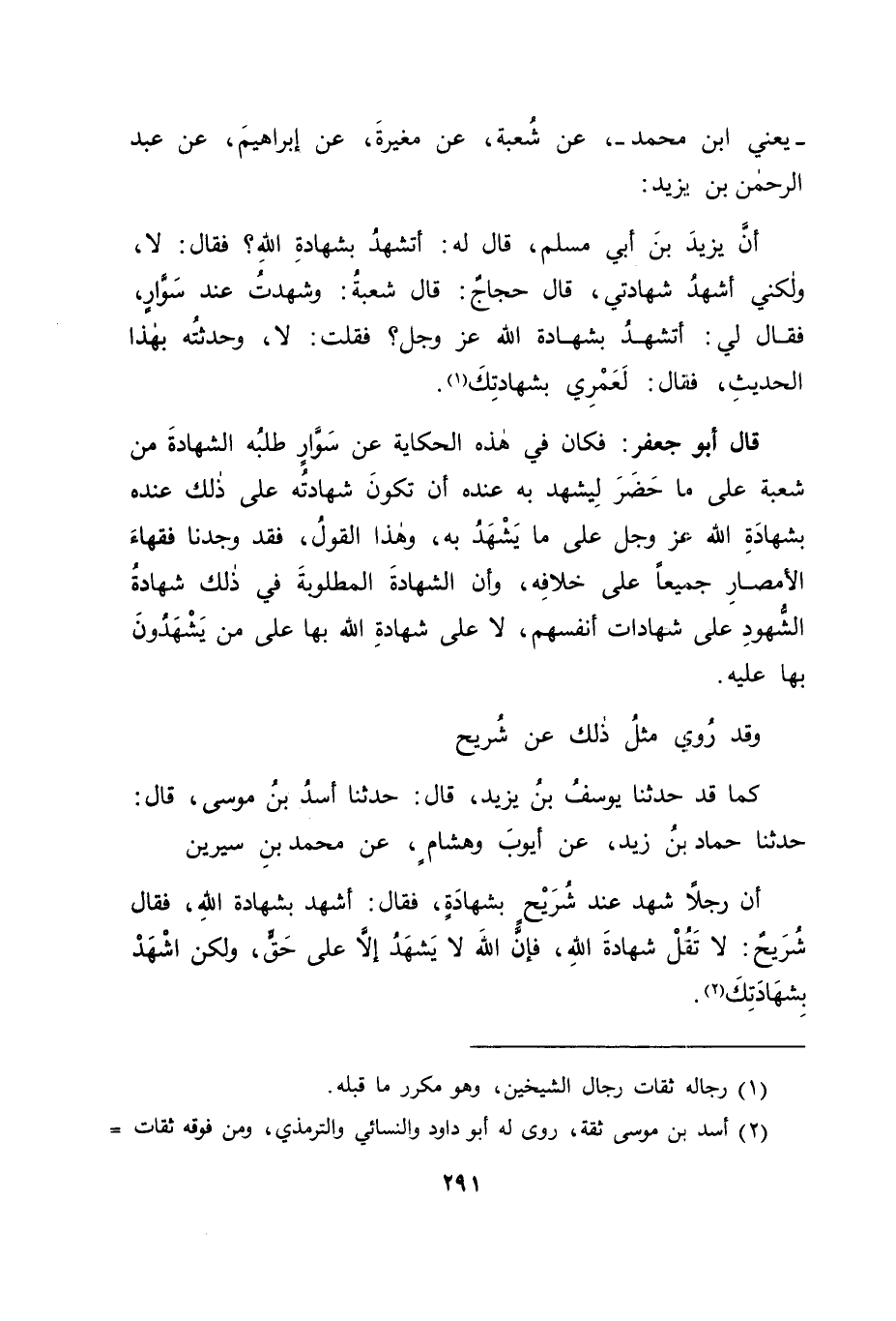 كَمَا قَدْ حَدَّثَنَا يُوسُفُ بْنُ يَزِيدَ قَالَ: حَدَّثَنَا أَسَدُ بْنُ مُوسَى قَالَ: حَدَّثَنَا حَمَّادُ بْنُ زَيْدٍ , عَنْ أَيُّوبَ، وَهِشَامٍ عَنْ مُحَمَّدِ بْنِ سِيرِينَ أَنَّ رَجُلًا شَهِدَ عِنْدَ شُرَيْحٍ بِشَهَادَةٍ، فَقَالَ: أَشْهَدُ بِشَهَادَةِ اللهِ، فَقَالَ شُرَيْحٌ: " لَا تَقُلْ شَهَادَةَ اللهِ، فَإِنَّ اللهَ لَا يَشْهَدُ إِلَّا عَلَى حَقٍّ، وَلَكِنِ اشْهَدْ بِشَهَادَتِكَ " -[292]- ثُمَّ نَظَرْنَا: هَلْ رُوِيَ عَنْ رَسُولِ اللهِ صَلَّى اللَّهُ عَلَيْهِ وَسَلَّمَ فِي ذَلِكَ شَيْءٌ يَدُلُّ عَلَى الْمُسْتَعْمَلِ فِيهَا، أَمْ لَا؟