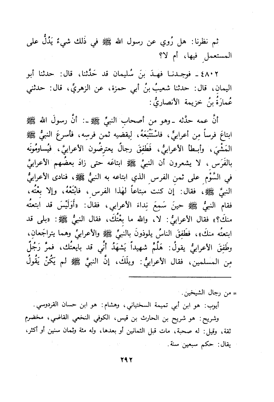 4802 - فَوَجَدْنَا فَهْدَ بْنَ سُلَيْمَانَ قَدْ حَدَّثَنَا قَالَ: حَدَّثَنَا أَبُو الْيَمَانِ قَالَ: حَدَّثَنَا شُعَيْبُ بْنُ أَبِي حَمْزَةَ , عَنِ الزُّهْرِيِّ قَالَ: حَدَّثَنِي عُمَارَةُ بْنُ خُزَيْمَةَ الْأَنْصَارِيُّ: أَنَّ عَمَّهُ، حَدَّثَهُ وَهُوَ مِنْ أَصْحَابِ النَّبِيِّ صَلَّى اللَّهُ عَلَيْهِ وَسَلَّمَ: أَنَّ رَسُولَ اللهِ صَلَّى اللَّهُ عَلَيْهِ وَسَلَّمَ ابْتَاعَ فَرَسًا مِنْ أَعْرَابِيٍّ، فَاسْتَتْبَعَهُ، لِيَقْضِيَهُ ثَمَنَ فَرَسِهِ، فَأَسْرَعَ النَّبِيُّ صَلَّى اللَّهُ عَلَيْهِ وَسَلَّمَ الْمَشْيَ، وَأَبْطَأَ الْأَعْرَابِيُّ، فَطَفِقَ رِجَالٌ يَعْتَرِضُونَ الْأَعْرَابِيَّ، فَيُسَاوِمُونَهُ بِالْفَرَسِ، لَا يَشْعُرُونَ أَنَّ النَّبِيَّ صَلَّى اللَّهُ عَلَيْهِ وَسَلَّمَ ابْتَاعَهُ حَتَّى زَادَ بَعْضُهُمُ الْأَعْرَابِيَّ فِي السَّوْمِ عَلَى ثَمَنِ الْفَرَسِ الَّذِي ابْتَاعَهُ بِهِ النَّبِيُّ صَلَّى اللَّهُ عَلَيْهِ وَسَلَّمَ، فَنَادَى الْأَعْرَابِيُّ النَّبِيَّ صَلَّى اللَّهُ عَلَيْهِ وَسَلَّمَ، فَقَالَ: إِنْ كُنْتَ مُبْتَاعًا لِهَذَا الْفَرَسِ، فَابْتَعْهُ، وَإِلَّا بِعْتُهُ، فَقَامَ النَّبِيُّ صَلَّى اللَّهُ عَلَيْهِ وَسَلَّمَ حِينَ سَمِعَ نِدَاءَ الْأَعْرَابِيِّ، فَقَالَ: " أَوَلَيْسَ قَدِ ابْتَعْتُهُ مِنْكَ؟ " , فَقَالَ الْأَعْرَابِيُّ: لَا، وَاللهِ مَا بِعْتُكَ، فَقَالَ النَّبِيُّ صَلَّى اللَّهُ عَلَيْهِ وَسَلَّمَ: " بَلَى قَدِ ابْتَعْتُهُ مِنْكَ " فَطَفِقَ النَّاسُ يَلُوذُونَ بِالنَّبِيِّ صَلَّى اللَّهُ عَلَيْهِ وَسَلَّمَ وَالْأَعْرَابِيُّ وَهُمَا يَتَرَاجَعَانِ وَطَفِقَ الْأَعْرَابِيُّ يَقُولُ: هَلُمَّ شَهِيدًا يَشْهَدُ أَنِّي قَدْ بَايَعْتُكَ، فَمَرَّ رَجُلٌ مِنَ الْمُسْلِمِينَ، فَقَالَ الْأَعْرَابِيُّ: وَيْلَكَ، إِنَّ النَّبِيَّ صَلَّى اللَّهُ عَلَيْهِ وَسَلَّمَ لَمْ يَكُنْ يَقُولُ -[293]- إِلَّا حَقًّا، حَتَّى جَاءَ خُزَيْمَةُ، فَاسْتَمَعَ لِمُرَاجَعَةِ النَّبِيِّ صَلَّى اللَّهُ عَلَيْهِ وَسَلَّمَ وَمُرَاجَعَةِ الْأَعْرَابِيِّ، وَهُوَ يَقُولُ: هَلُمَّ شَهِيدًا يَشْهَدُ لَكَ أَنِّي قَدْ بَايَعْتُكَ، فَقَالَ خُزَيْمَةُ: أَنَا أَشْهَدُ أَنَّكَ قَدْ بَايَعْتَهُ، فَأَقْبَلَ النَّبِيُّ صَلَّى اللَّهُ عَلَيْهِ وَسَلَّمَ عَلَى خُزَيْمَةَ، فَقَالَ: " بِمَ تَشْهَدُ؟ فَقَالَ: بِتَصْدِيقِكَ يَا رَسُولَ اللهِ , فَجَعَلَ رَسُولُ اللهِ صَلَّى اللَّهُ عَلَيْهِ وَسَلَّمَ شَهَادَةَ خُزَيْمَةَ شَهَادَةَ رَجُلَيْنِ قَالَ: فَكَانَ فِي هَذَا الْحَدِيثِ مِنْ شَهَادَةِ خُزَيْمَةَ عَلَى الْأَعْرَابِيِّ لِرَسُولِ اللهِ صَلَّى اللَّهُ عَلَيْهِ وَسَلَّمَ عِنْدَ حَاجَتِهِ إِلَى الشَّهَادَةِ لَهُ عَلَى مَا جَحَدَهُ إِيَّاهُ الْأَعْرَابِيُّ، بِأَنْ شَهِدَ لَهُ عَلَى بَيْعِهِ إِيَّاهُ، لَا عَلَى أَنْ شَهِدَ لَهُ بِشَهَادَةِ اللهِ عَزَّ وَجَلَّ عَلَى بَيْعِهِ إِيَّاهُ، فَاسْتَحَقَّ بِذَلِكَ الشَّرَفَ وَالرُّتْبَةَ الَّتِي خَصَّهُ اللهُ بِهِمَا، فَدَلَّ ذَلِكَ أَنَّ الشَّهَادَاتِ كُلَّهَا عِنْدَ الْحُكَّامِ عَلَى الْحُقُوقِ كَذَلِكَ، لَا عَلَى مَا كَانَ سَوَّارٌ ذَهَبَ إِلَيْهِ فِيهِ ثُمَّ وَجَدْنَا مَا هُوَ أَعْلَى مِنْ هَذَا، وَهُوَ مَا ذَكَرَهُ اللهُ فِي كِتَابِهِ فِي آيَةِ اللِّعَانِ مِنْ قَوْلِهِ عَزَّ وَجَلَّ: {فَشَهَادَةُ أَحَدِهِمْ أَرْبَعُ شَهَادَاتٍ بِاللهِ} [النور: 6] ، وَلَمْ يَقُلْ: شَهَادَةُ أَحَدِهِمْ بِشَهَادَةِ اللهِ عَزَّ وَجَلَّ بِمَا يُشْهَدُ بِهِ فِي اللِّعَانِ، وَفِي ذَلِكَ دَلِيلٌ عَلَى كَيْفِيَّةِ الشَّهَادَاتِ عَلَى الْحُقُوقِ -[294]- أَنَّهَا كَمَا ذَكَرْنَا، لَا عَلَى مَا كَانَ سَوَّارٌ كَلَّفَ شُعْبَةَ فِي شَهَادَتِهِ عِنْدَهُ، وَفِي ذَلِك
