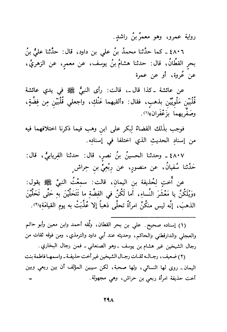 4806 - كَمَا حَدَّثَنَا مُحَمَّدُ بْنُ عَلِيِّ بْنِ دَاوُدَ قَالَ: حَدَّثَنَا عَلِيُّ بْنُ بَحْرٍ الْقَطَّانُ قَالَ: حَدَّثَنَا هِشَامُ بْنُ يُوسُفَ , عَنْ مَعْمَرٍ , عَنِ الزُّهْرِيِّ , عَنْ عُرْوَةَ أَوْ عَنْ عَمْرَةَ عَنْ عَائِشَةَ كَذَا قَالَ قَالَتْ: رَأَى النَّبِيُّ صَلَّى اللَّهُ عَلَيْهِ وَسَلَّمَ فِي يَدَيَّ عَائِشَةَ قُلْبَيْنِ مَلْوِيَّيْنِ بِذَهَبٍ، فَقَالَ: " أَلْقِيهِمَا عَنْكِ، وَاجْعَلِي قُلْبَيْنِ مِنْ فِضَّةٍ، وَصَفِّرِيهِمَا بِزَعْفَرَانٍ " فَوَجَبَ بِذَلِكَ الْقَضَاءُ لِبَكْرٍ عَلَى ابْنِ وَهْبٍ فِيمَا ذَكَرْنَا اخْتِلَافَهُمَا فِيهِ مِنْ إِسْنَادِ الْحَدِيثِ الَّذِي اخْتَلَفَا فِي إِسْنَادِهِ