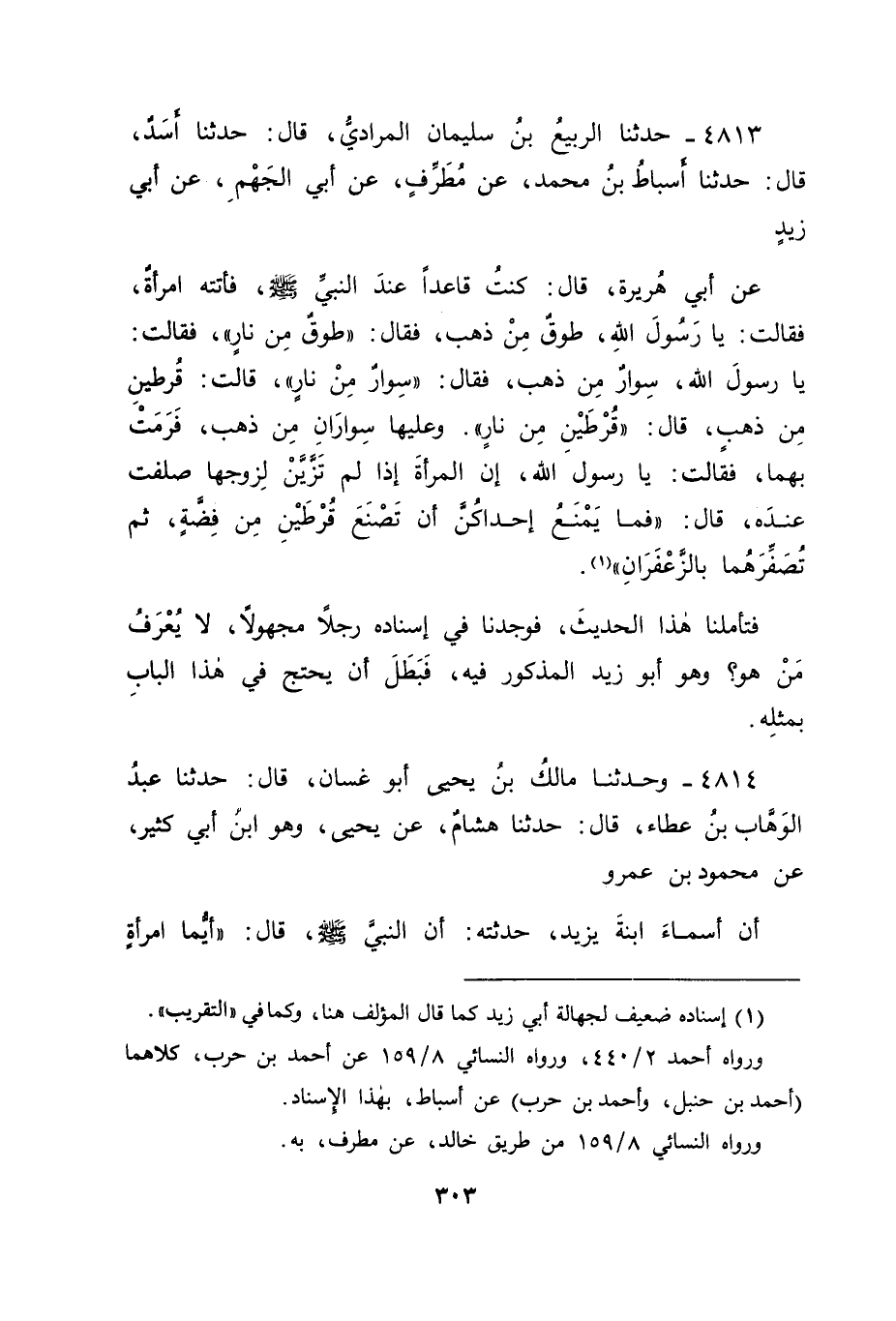 4813 - حَدَّثَنَا الرَّبِيعُ بْنُ سُلَيْمَانَ الْمُرَادِيُّ قَالَ: حَدَّثَنَا أَسَدٌ قَالَ: حَدَّثَنَا أَسْبَاطُ بْنُ مُحَمَّدٍ , عَنْ مُطَرِّفٍ , عَنْ أَبِي الْجَهْمِ , عَنْ أَبِي زَيْدٍ عَنْ أَبِي هُرَيْرَةَ قَالَ: كُنْتُ قَاعِدًا عِنْدَ النَّبِيِّ صَلَّى اللَّهُ عَلَيْهِ وَسَلَّمَ، فَأَتَتْهُ امْرَأَةٌ، فَقَالَتْ: يَا رَسُولَ اللهِ , طَوْقٌ مِنْ ذَهَبٍ، فَقَالَ: " طَوْقٌ مِنْ نَارٍ " فَقَالَتْ: يَا رَسُولَ اللهِ , سِوَارٌ مِنْ ذَهَبٍ فَقَالَ: " سِوَارٌ مِنْ نَارٍ " قَالَتْ: قُرْطَيْنِ مِنْ ذَهَبٍ قَالَ: " قُرْطَيْنِ مِنْ نَارٍ " وَعَلَيْهَا سِوَارَانِ مِنْ ذَهَبٍ، فَرَمَتْ بِهِمَا، فَقَالَتْ: يَا رَسُولَ اللهِ , إِنَّ الْمَرْأَةَ إِذَا لَمْ تَزَّيَّنْ لِزَوْجِهَا صَلِفَتْ عِنْدَهُ قَالَ: " فَمَا يَمْنَعُ إِحْدَاكُنَّ أَنْ تَصْنَعَ قُرْطَيْنِ مِنَ فِضَّةٍ، ثُمَّ تُصَفِّرَهُمَا بِالزَّعْفَرَانِ " فَتَأَمَّلْنَا هَذَا الْحَدِيثَ، فَوَجَدْنَا فِي إِسْنَادِهِ رَجُلًا مَجْهُولًا، لَا يُعْرَفُ مَنْ هُوَ؟ وَهُوَ أَبُو زَيْدٍ فِيهِ، فَبَطَلَ أَنْ يُحْتَجَّ فِي هَذَا الْبَابِ بِمِثْلِهِ