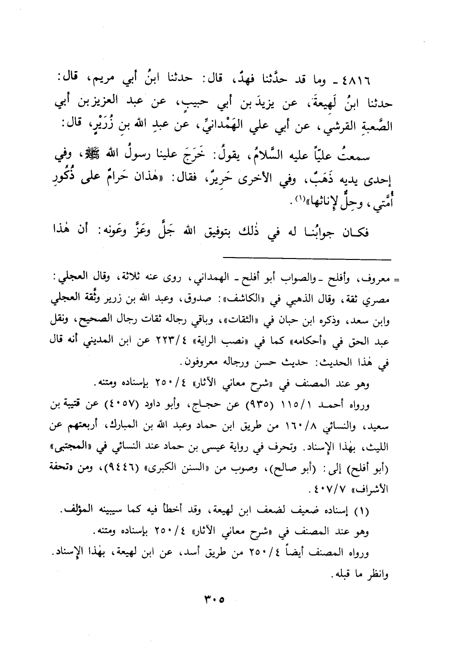4816 - وَمَا قَدْ حَدَّثَنَا فَهْدٌ قَالَ: حَدَّثَنَا ابْنُ أَبِي مَرْيَمَ قَالَ حَدَّثَنَا ابْنُ لَهِيعَةَ , عَنْ يَزِيدَ بْنِ أَبِي حَبِيبٍ , عَنْ عَبْدِ الْعَزِيزِ بْنِ أَبِي الصَّعْبَةِ الْقُرَشِيِّ , عَنْ أَبِي عَلِيٍّ الْهَمْدَانِيِّ عَنْ عَبْدِ اللهِ بْنِ زُرَيْرٍ قَالَ: سَمِعْتُ عَلِيًّا عَلَيْهِ السَّلَامُ، يَقُولُ: خَرَجَ عَلَيْنَا رَسُولُ اللهِ صَلَّى اللَّهُ عَلَيْهِ وَسَلَّمَ، وَفِي إِحْدَى يَدَيْهِ ذَهَبٌ، وَفِي الْأُخْرَى حَرِيرٌ، فَقَالَ: " هَذَانِ حَرَامٌ عَلَى ذُكُورِ أُمَّتِي، وَحِلٌّ لِإِنَاثِهَا " فَكَانَ جَوَابُنَا لَهُ فِي ذَلِكَ بِتَوْفِيقِ اللهِ جَلَّ وَعَزَّ وَعَوْنِهِ: أَنَّ هَذَا -[306]- الْحَدِيثَ فَاسِدُ الْإِسْنَادِ؛ لِأَنَّ ابْنَ لَهِيعَةَ قَالَ فِيهِ: عَنْ أَبِي عَلِيٍّ الْهَمْدَانِيِّ، وَقَدْ خَالَفَهُ اللَّيْثُ وَهُوَ أَصَحُّ رِوَايَةً مِنْهُ فَقَالَ فِيهِ: عَنْ رَجُلٍ مِنْ هَمْدَانَ يُقَالُ لَهُ: أَفْلَحُ، وَأَفْلَحُ هَذَا فَمَجْهُولٌ، وَلَيْسَ هُوَ أَبَا عَلِيٍّ الْهَمْدَانِيَّ؛ لِأَنَّ أَبَا عَلِيٍّ هُوَ ثُمَامَةُ بْنُ شُفَيٍّ، وَقَدْ رَوَى مُحَمَّدُ بْنُ إِسْحَاقَ هَذَا الْحَدِيثَ، عَنْ يَزِيدَ بْنِ أَبِي حَبِيبٍ، فَوَافَقَ اللَّيْثُ فِيهِ وَخَالَفَهُ ابْنُ لَهِيعَةَ