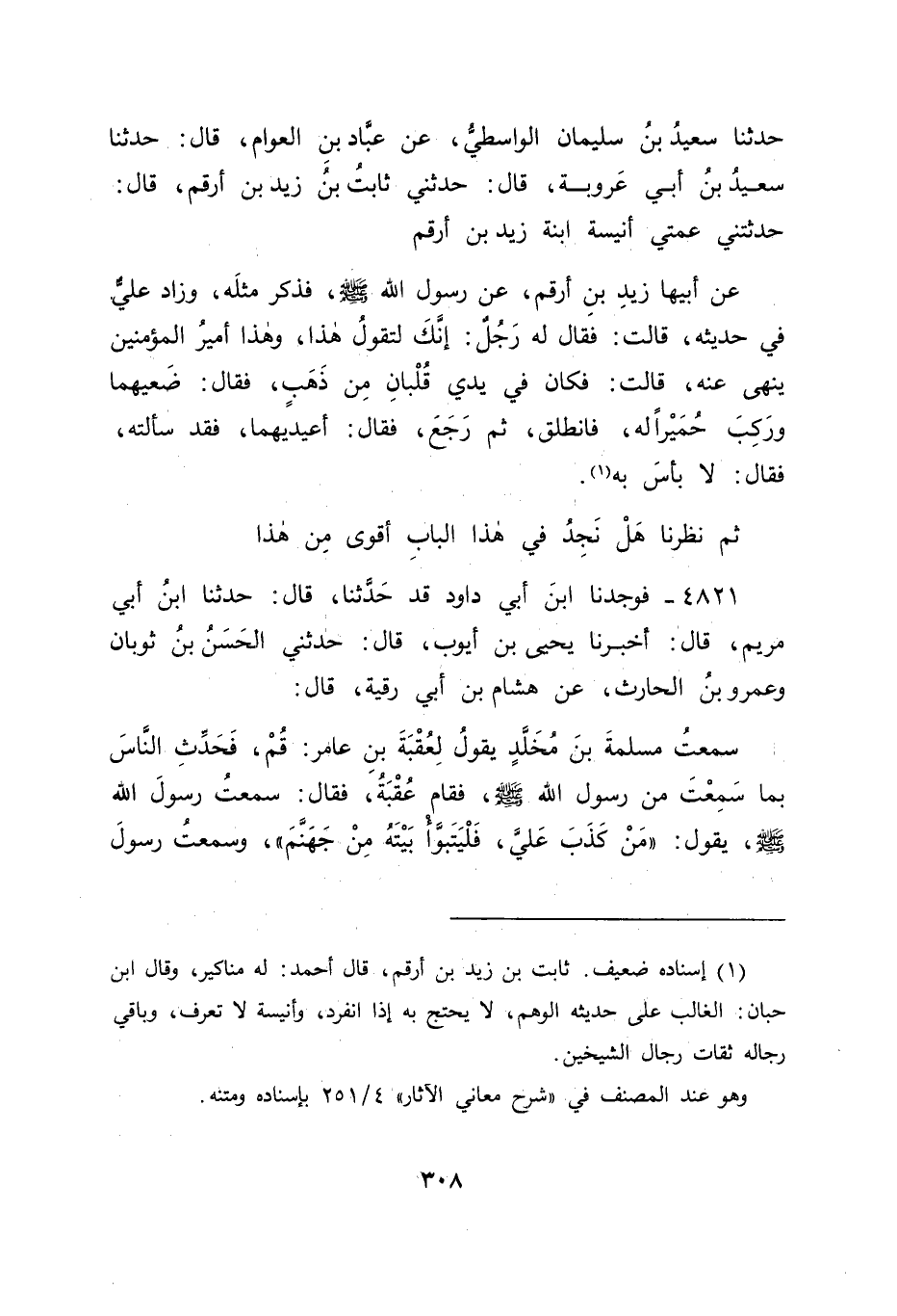 4821 - فَوَجَدْنَا ابْنَ أَبِي دَاوُدَ قَدْ حَدَّثَنَا قَالَ: حَدَّثَنَا ابْنُ أَبِي مَرْيَمَ قَالَ: أَخْبَرَنَا يَحْيَى بْنُ أَيُّوبَ قَالَ: حَدَّثَنِي الْحَسَنُ بْنُ ثَوْبَانَ، وَعَمْرُو بْنُ الْحَارِثِ , عَنْ هِشَامِ بْنِ أَبِي رُقَيَّةَ قَالَ: سَمِعْتُ مَسْلَمَةَ بْنَ مُخَلَّدٍ يَقُولُ لِعُقْبَةَ بْنِ عَامِرٍ: قُمْ فَحَدِّثِ النَّاسَ بِمَا سَمِعْتَ مِنْ رَسُولِ اللهِ صَلَّى اللَّهُ عَلَيْهِ وَسَلَّمَ، فَقَامَ عُقْبَةُ , فَقَالَ: سَمِعْتُ رَسُولَ اللهِ صَلَّى اللَّهُ عَلَيْهِ وَسَلَّمَ يَقُولُ: " مَنْ كَذَبَ عَلَيَّ فَلْيَتَبَوَّأْ بَيْتَهُ مِنْ جَهَنَّمَ " وَسَمِعْتُ رَسُولَ
