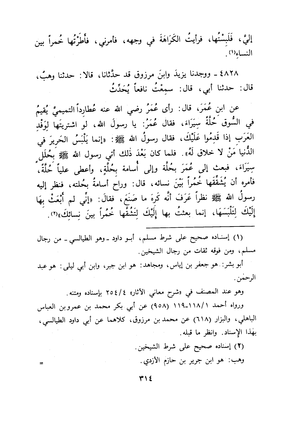 4828 - وَوَجَدْنَا يَزِيدَ وَابْنَ مَرْزُوقٍ قَدْ حَدَّثَانَا، قَالَا , حَدَّثَنَا وَهْبٌ قَالَ: حَدَّثَنَا أَبِي قَالَ: سَمِعْتُ نَافِعًا يُحَدِّثُ عَنِ ابْنِ عُمَرَ قَالَ: رَأَى عُمَرُ رَضِيَ اللهُ عَنْهُ عُطَارِدًا التَّمِيمِيَّ يُقِيمُ فِي السُّوقِ حُلَّةً سِيَرَاءَ، فَقَالَ عُمَرُ: يَا رَسُولَ اللهِ , لَوِ اشْتَرَيْتَهَا لِوَفْدِ الْعَرَبِ إِذَا قَدِمُوا عَلَيْكَ، فَقَالَ رَسُولُ اللهِ صَلَّى اللَّهُ عَلَيْهِ وَسَلَّمَ: " إِنَّمَا يَلْبَسُ الْحَرِيرَ فِي الدُّنْيَا مَنْ لَا خَلَاقَ لَهُ " فَلَمَّا كَانَ بَعْدَ ذَلِكَ أُتِيَ رَسُولُ اللهِ صَلَّى اللَّهُ عَلَيْهِ وَسَلَّمَ بِحُلَلٍ سِيَرَاءَ، فَبَعَثَ إِلَى عُمَرَ بِحُلَّةٍ وَإِلَى أُسَامَةَ بِحُلَّةٍ، وَأَعْطَى عَلِيًّا حُلَّةً، فَأَمَرَهُ أَنْ يُشَقِّقَهَا خُمُرًا بَيْنَ نِسَائِهِ قَالَ: وَرَاحَ أُسَامَةُ بِحُلَّتِهِ، فَنَظَرَ إِلَيْهِ رَسُولُ اللهِ صَلَّى اللَّهُ عَلَيْهِ وَسَلَّمَ نَظَرًا عُرِفَ أَنَّهُ كَرِهَ مَا صَنَعَ , فَقَالَ: " إِنِّي لَمْ أَبْعَثْ بِهَا إِلَيْكَ لِتَلْبَسَهَا، وَإِنَّمَا بَعَثْتُ بِهَا إِلَيْكَ لِتَشُقَّهَا خُمُرًا بَيْنَ نِسَائِكَ "