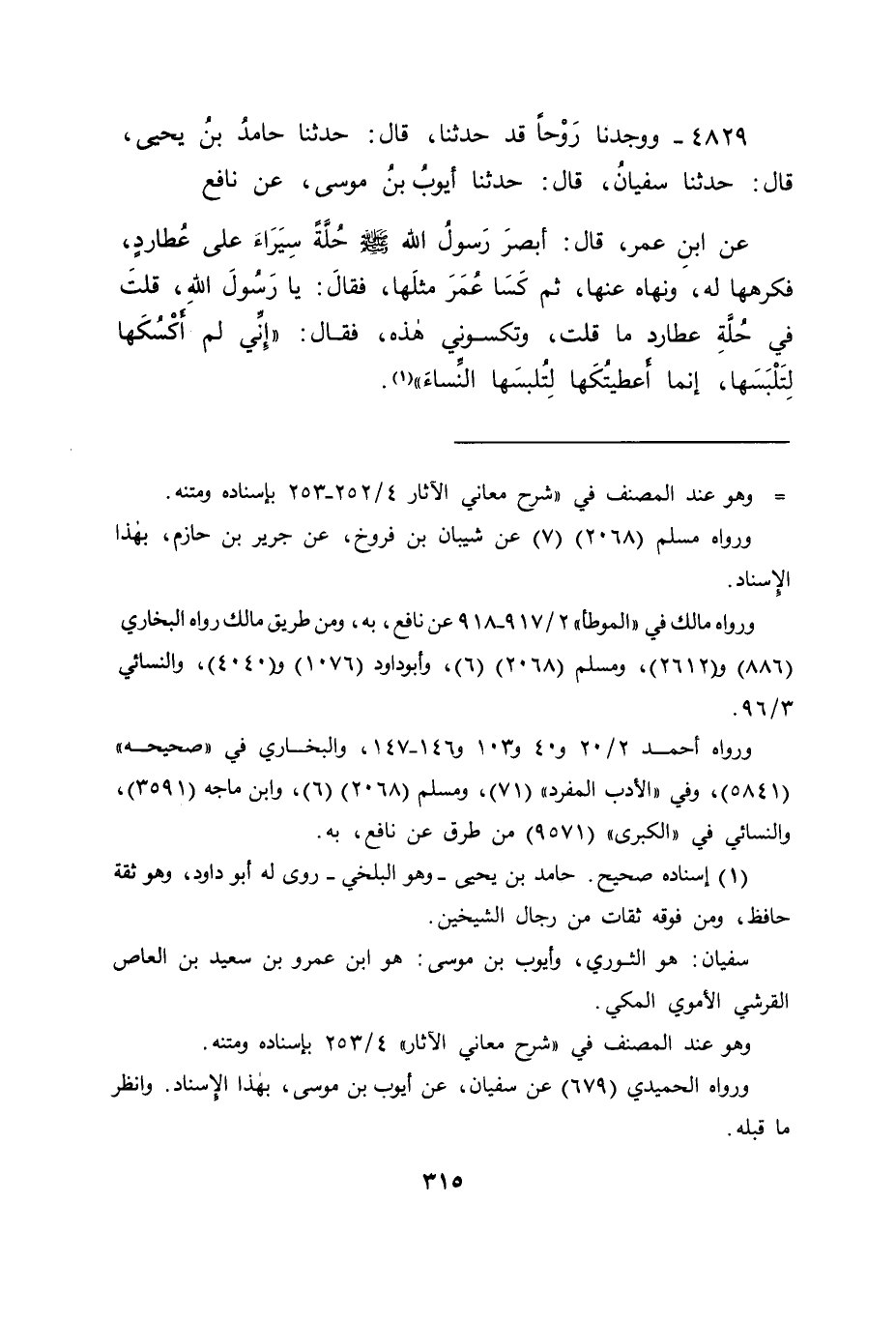 4829 - وَوَجَدْنَا رَوْحًا قَدْ حَدَّثَنَا قَالَ: حَدَّثَنَا حَامِدُ بْنُ يَحْيَى قَالَ: حَدَّثَنَا سُفْيَانُ قَالَ: حَدَّثَنَا سُفْيَانُ قَالَ: حَدَّثَنَا أَيُّوبُ بْنُ مُوسَى , عَنْ نَافِعٍ، عَنِ ابْنِ عُمَرَ قَالَ: أَبْصَرَ رَسُولُ اللهِ صَلَّى اللَّهُ عَلَيْهِ وَسَلَّمَ حُلَّةً سِيَرَاءَ عَلَى عُطَارِدٍ فَكَرِهَهَا لَهُ، وَنَهَاهُ عَنْهَا، ثُمَّ كَسَا عُمَرَ مِثْلَهَا، فَقَالَ: يَا رَسُولَ اللهِ , قُلْتَ فِي حُلَّةِ عُطَارِدٍ مَا قُلْتَ، وَتَكْسُونِي هَذِهِ؟ فَقَالَ: " إِنِّي لَمْ أَكْسُكَهَا لِتَلْبَسَهَا، وَإِنَّمَا أَعْطَيْتُكَهَا لِتُلْبِسَهَا النِّسَاءَ " -[316]- فَكَانَ مَا رُوِّينَا تَوَاتُرَ الْآثَارِ عَنْ رَسُولِ اللهِ صَلَّى اللَّهُ عَلَيْهِ وَسَلَّمَ بِإِبَاحَةِ النِّسَاءِ لُبْسَ الْحَرِيرِ، فَوَجَبَ أَنْ لَا تُعَارِضَ مَا رُوِيَ عَنْهُ فِي ذَلِكَ بِمَا رُوِيَ عَنْهُ فِيمَا يُخَالِفُهُ مِمَّا لَمْ يَجِئْ كَمَجِيئِهِ، وَلَمْ تَتَوَاتَرِ الرِّوَايَاتُ بِهِ كَمَا تَوَاتَرَتِ الرِّوَايَاتُ بِخِلَافِهِ، وَسَنَأْتِي بِالنَّظَرِ فِي ذَلِكَ فِيمَا بَعْدَ هَذَا الْبَابِ مِنْ كِتَابِنَا هَذَا إِنْ شَاءَ اللهُ، وَاللهُ عَزَّ وَجَلَّ نَسْأَلُهُ التَّوْفِيقَ