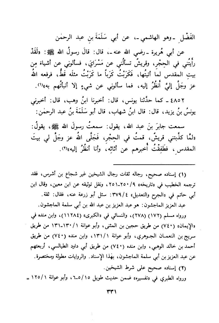 4852 - كَمَا حَدَّثَنَا يُونُسُ قَالَ: أَخْبَرَنَا ابْنُ وَهْبٍ قَالَ: أَخْبَرَنِي يُونُسُ بْنُ يَزِيدَ قَالَ: قَالَ: ابْنُ شِهَابٍ، قَالَ أَبُو سَلَمَةَ بْنُ عَبْدِ الرَّحْمَنِ سَمِعْتُ جَابِرَ بْنَ عَبْدِ اللهِ يَقُولُ: سَمِعْتُ رَسُولَ اللهِ صَلَّى اللَّهُ عَلَيْهِ وَسَلَّمَ يَقُولُ: " لَمَّا كَذَّبَتْنِي قُرَيْشٌ، قُمْتُ فِي الْحِجْرِ، فَجَلَّى الله عَزَّ وَجَلَّ لِي بَيْتَ الْمَقْدِسِ، فَطَفِقْتُ أُخْبِرُهُمْ عَنْ أَثَاثِهِ، وَأَنَا أَنْظُرُ إِلَيْهِ " -[332]-