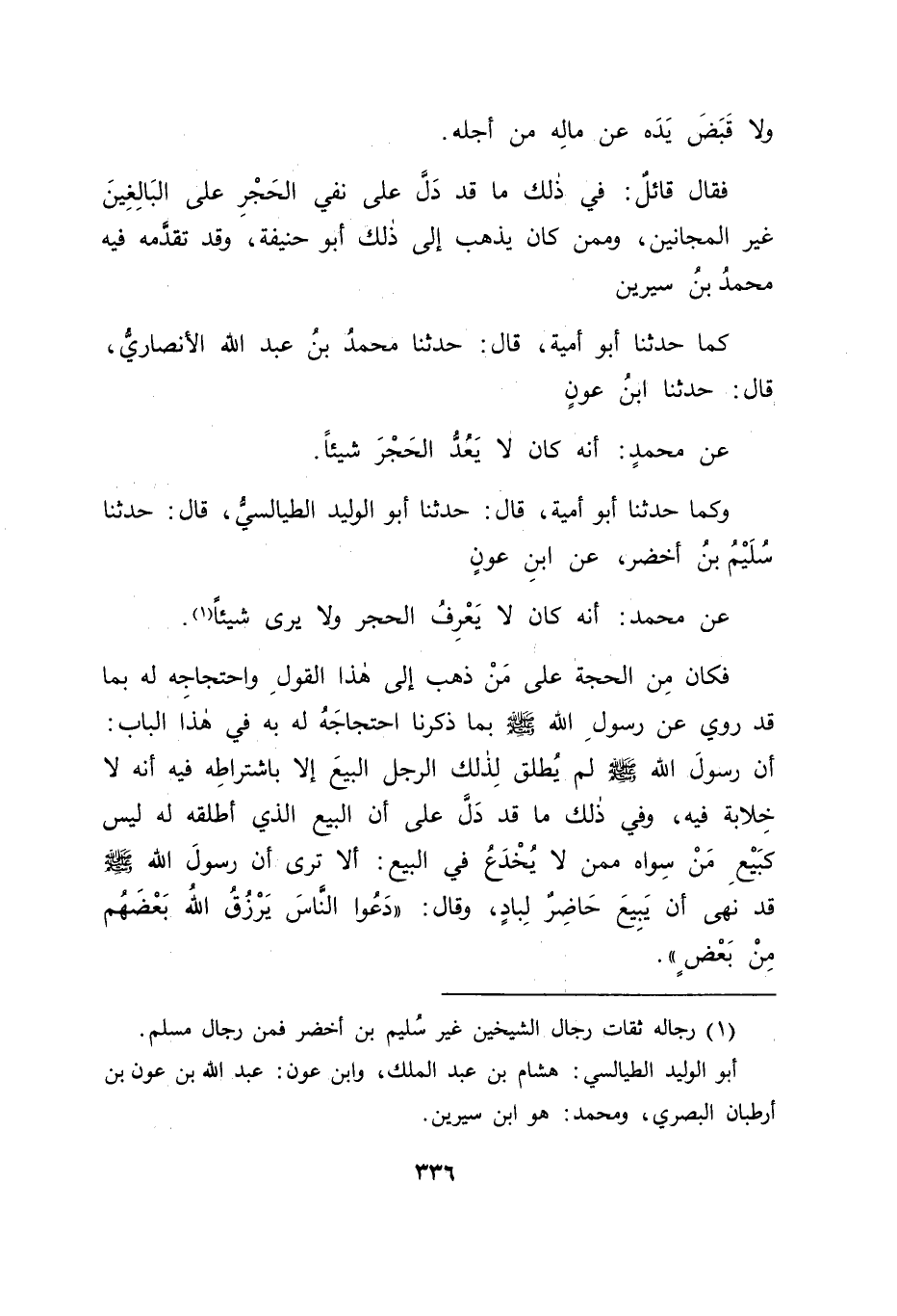 وَكَمَا حَدَّثَنَا أَبُو أُمَيَّةَ قَالَ: حَدَّثَنَا أَبُو الْوَلِيدِ الطَّيَالِسِيُّ قَالَ: حَدَّثَنَا سُلَيْمُ بْنُ أَخْضَرَ , عَنِ ابْنِ عَوْنٍ عَنْ مُحَمَّدٍ: " أَنَّهُ كَانَ لَا يَعْرِفُ الْحَجْرَ وَلَا يَرَى شَيْئًا " فَكَانَ مِنَ الْحُجَّةِ عَلَى مَنْ ذَهَبَ إِلَى هَذَا الْقَوْلِ وَاحْتِجَاجِهِ لَهُ بِمَا قَدْ رُوِيَ عَنْ رَسُولِ اللهِ صَلَّى اللَّهُ عَلَيْهِ وَسَلَّمَ بِمَا ذَكَرْنَا احْتِجَاجَهُ لَهُ بِهِ فِي هَذَا الْبَابِ: أَنَّ رَسُولَ اللهِ صَلَّى اللَّهُ عَلَيْهِ وَسَلَّمَ لَمْ يُطْلِقْ لِذَلِكَ الرَّجُلِ الْبَيْعَ إِلَّا بِاشْتِرَاطِهِ فِيهِ أَنَّهُ لَا خِلَابَةَ فِيهِ وَفِي ذَلِكَ مَا قَدْ دَلَّ عَلَى أَنَّ الْبَيْعَ الَّذِي أَطْلَقَهُ لَهُ لَيْسَ كَبَيْعِ مَنْ سِوَاهُ مِمَّنْ لَا يُخْدَعُ فِي الْبَيْعِ أَلَا تَرَى