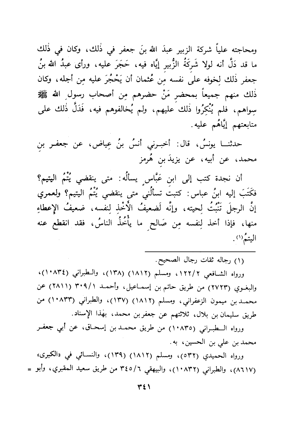 حَدَّثَنَا يُونُسُ قَالَ: أَخْبَرَنِي أَنَسُ بْنُ عِيَاضٍ , عَنْ جَعْفَرِ بْنِ مُحَمَّدٍ , عَنْ أَبِيهِ عَنْ يَزِيدَ بْنِ هُرْمُزَ أَنَّ نَجْدَةَ كَتَبَ إِلَى ابْنِ عَبَّاسٍ يَسْأَلُهُ: مَتَى يَنْقَضِي يُتْمُ الْيَتِيمِ؟ فَكَتَبَ إِلَيْهِ ابْنُ عَبَّاسٍ: " كَتَبْتَ تَسْأَلُنِي مَتَى يَنْقَضِي يُتْمُ الْيَتِيمِ؟ وَلَعَمْرِي إِنَّ الرَّجُلَ تَنْبُتُ لِحْيَتُهُ، وَإِنَّهُ لَضَعِيفُ الْأَخْذِ لِنَفْسِهِ، ضَعِيفُ الْإِعْطَاءِ مِنْهَا، فَإِذَا أَخَذَ لِنَفْسِهِ مِنْ صَالِحِ مَا يَأْخُذُ النَّاسُ، فَقَدِ انْقَطَعَ عَنْهُ الْيُتْمُ " -[342]- فَهَذَا ابْنُ عَبَّاسٍ أَيْضًا قَدْ كَانَ مِنْهُ مَا قَدْ وَافَقَ مَنْ قَدْ ذَكَرْنَاهُ قَبْلَهُ مِنْ أَصْحَابِ رَسُولِ اللهِ صَلَّى اللَّهُ عَلَيْهِ وَسَلَّمَ فِي إِثْبَاتِ الْحَجْرِ