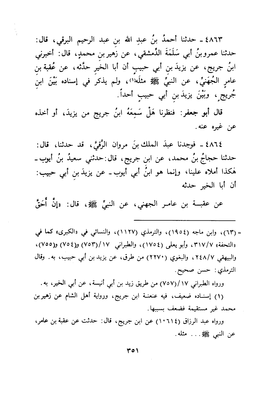 4864 - فَوَجَدْنَا عَبْدَ الْمَلِكِ بْنَ مَرْوَانَ الرَّقِّيَّ قَدْ حَدَّثَنَا قَالَ: حَدَّثَنَا حَجَّاجُ بْنُ مُحَمَّدٍ , عَنِ ابْنِ جُرَيْجٍ قَالَ: حَدَّثَنِي سَعِيدُ بْنُ أَيُّوبَ هَكَذَا أَمْلَاهُ عَلَيْنَا، وَإِنَّمَا هُوَ ابْنُ أَبِي أَيُّوبَ , عَنْ يَزِيدَ بْنِ أَبِي حَبِيبٍ أَنَّ أَبَا الْخَيْرِ، حَدَّثَهُ، عَنْ عُقْبَةَ بْنِ عَامِرٍ الْجُهَنِيِّ عَنِ النَّبِيِّ صَلَّى اللَّهُ عَلَيْهِ وَسَلَّمَ قَالَ: " إِنَّ أَحَقَّ -[352]- الشُّرُوطِ أَنْ يُوَفَّى بِهَا مَا اسْتَحْلَلْتُمْ بِهِ الْفُرُوجَ " فَوَقَفْنَا بِذَلِكَ عَلَى أَنَّ ابْنَ جُرَيْجٍ إِنَّمَا أَخَذَ هَذَا الْحَدِيثَ عَنْ سَعِيدِ بْنِ أَبِي أَيُّوبَ، عَنْ يَزِيدَ ثُمَّ تَأَمَّلْنَا مَتْنَ هَذَا الْحَدِيثِ لِنَقِفَ عَلَى الُمَرَادِ بِهِ إِنْ شَاءَ اللهُ، فَوَجَدْنَا اللهَ عَزَّ وَجَلَّ، قَدْ قَالَ فِي كِتَابِهِ: {وَآتُوا النِّسَاءَ صَدُقَاتِهِنَّ نِحْلَةً} [النساء: 4] وَقَالَ: {وَعَاشِرُوهُنَّ بِالْمَعْرُوفِ} [النساء: 19] وَقَالَ: {فَإِنْ كَرِهْتُمُوهُنَّ فَعَسَى أَنْ تَكْرَهُوا شَيْئًا} [النساء: 19] حَضًّا مِنْهُ لَهُمْ عَلَى إِمْسَاكِهِنَّ لِمَا عَسَى أَنْ يَكُونَ قَدْ عَلِمَهُ عَزَّ وَجَلَّ لَهُمْ فِي ذَلِكَ مِنَ الْخِيَرَةِ فِيمَا يَفْعَلُونَهُ مِنْ ذَلِكَ , ثُمَّ قَالَ {وَآتَيْتُمْ إِحْدَاهُنَّ قِنْطَارًا فَلَا تَأْخُذُوا مِنْهُ شَيْئًا أَتَأْخُذُونَهُ بُهْتَانًا وَإِثْمًا مُبِينًا} [النساء: 20] فَجَعَلَ أَخْذَهُمْ إِيَّاهُ مِنْهُنَّ مِنْ حَيْثُ لَا يَنْبَغِي أَخْذُهُمْ إِيَّاهُ مِنْهُنَّ بُهْتَانًا وَإِثْمًا مُبِينًا , ثُمَّ قَالَ: {وَكَيْفَ تَأْخُذُونَهُ وَقَدْ أَفْضَى بَعْضُكُمْ إِلَى بَعْضٍ وَأَخَذْنَ مِنْكُمْ مِيثَاقًا غَلِيظًا} [النساء: 21] وَكَانَ الْإِفْضَاءُ الْمَذْكُورُ فِي هَذِهِ الْآيَةِ هُوَ الْجِمَاعُ الَّذِي كَانَ بَيْنَهُمْ، وَالْمِيثَاقُ الْمَذْكُورُ فِيهَا هُوَ الْعَقْدُ الَّذِي كَانَ فِيهِ إِحْلَالُهُنَّ فُرُوجَهُنَّ لِمَنْ تَزَوَّجَهُنَّ -[353]- وَقَالَ اللهُ عَزَّ وَجَلَّ عَلَى لِسَانِ رَسُولِهِ صَلَّى اللَّهُ عَلَيْهِ وَسَلَّمَ
