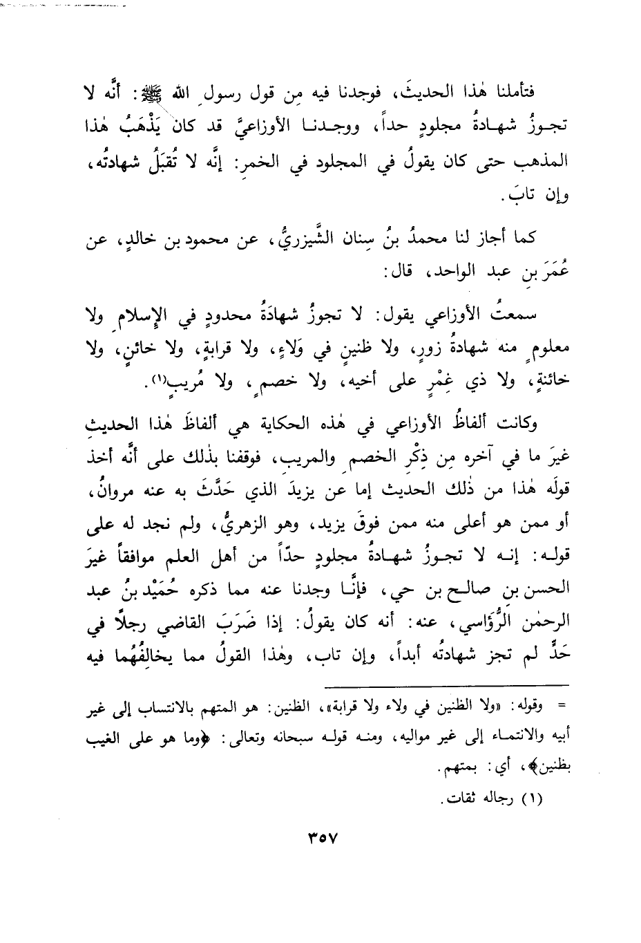 كَمَا أَجَازَ لَنَا مُحَمَّدُ بْنُ سِنَانٍ الشَّيْزَرِيُّ , عَنْ مَحْمُودِ بْنِ خَالِدٍ , عَنْ عُمَرَ بْنِ عَبْدِ الْوَاحِدِ قَالَ سَمِعْتُ الْأَوْزَاعِيَّ يَقُولُ: " لَا تَجُوزُ شَهَادَةُ مَحْدُودٍ فِي الْإِسْلَامِ، وَلَا مَعْلُومٍ مِنْهُ شَهَادَةُ زُورٍ، وَلَا ظَنِينٍ فِي وَلَاءٍ، وَلَا قَرَابَةٍ، وَلَا خَائِنٍ، وَلَا خَائِنَةٍ، وَلَا ذِي غِمْرٍ عَلَى أَخِيهِ، وَلَا خَصْمٍ، وَلَا مُرِيبٍ " وَكَانَتْ أَلْفَاظُ الْأَوْزَاعِيِّ فِي هَذِهِ الْحِكَايَةِ هِيَ أَلْفَاظُ هَذَا الْحَدِيثِ غَيْرَ مَا فِي آخِرِهِ مِنْ ذِكْرِ الْخَصْمِ وَالْمُرِيبِ، فَوَقَفْنَا بِذَلِكَ عَلَى أَنَّهُ أَخَذَ قَوْلَهُ هَذَا مِنْ ذَلِكَ الْحَدِيثِ، إِمَّا عَنْ يَزِيدَ الَّذِي حَدَّثَ بِهِ عَنْهُ مَرْوَانُ، أَوْ مِمَّنْ هُوَ أَعْلَى مِنْهُ مِمَّنْ فَوْقَ يَزِيدَ، وَهُوَ الزُّهْرِيُّ، وَلَمْ نَجِدْ لَهُ عَلَى قَوْلِهِ: إِنَّهُ لَا تَجُوزُ شَهَادَةُ مَجْلُودٍ حَدًّا مِنْ أَهْلِ الْعِلْمِ مُوَافِقًا غَيْرَ الْحَسَنِ بْنِ صَالِحِ بْنِ حَيٍّ، فَإِنَّا وَجَدْنَا عَنْهُ مِمَّا ذَكَرَهُ حُمَيْدُ بْنُ عَبْدِ الرَّحْمَنِ الرُّؤَاسِيُّ عَنْهُ: أَنَّهُ كَانَ يَقُولُ: إِذَا ضَرَبَ الْقَاضِي رَجُلًا فِي حَدٍّ لَمْ تَجُزْ شَهَادَتُهُ أَبَدًا وَإِنْ تَابَ، وَهَذَا الْقَوْلُ مِمَّا يُخَالِفُهُمَا فِيهِ -[358]- فُقَهَاءُ الْأَمْصَارِ سِوَاهُمَا ثُمَّ تَأَمَّلْنَا مَا اخْتَلَفَا وَفُقَهَاءُ الْأَمْصَارِ فِيهِ مِنْ هَذَا الْمَعْنَى، فَوَجَدْنَا أَشْيَاءَ مِمَّا قَدْ حَرَّمَهَا اللهُ عَزَّ وَجَلَّ وَتَوَعَّدَ عَلَيْهَا، وَغَلَّظَ الْعُقُوبَاتِ فِيهَا مِنَ الزِّنَى وَمِنَ السَّرِقَةِ، وَكَانَتِ الْعُقُوبَاتُ فِيهَا كَفَّارَاتٌ لِمُصِيبِهَا، مِنْهَا قَطْعُ أَيْدِي السُّرَّاقِ، وَمِنْهَا: إِقَامَةُ حَدِّ الزِّنَى عَلَى الْأَبْكَارِ مِنَ الزُّنَاةِ، وَهِيَ الْجَلْدُ، وَعَلَى الثَّيِّبِ مِنْهُمْ، وَهِيَ الرَّجْمُ وَوَجَدْنَا أَهْلَ الْعِلْمِ لَا يَخْتَلِفُونَ فِي قَبُولِ شَهَادَةِ الْمَقْطُوعِينَ فِي السَّرِقَاتِ إِذَا تَابُوا، وَلَا فِي قَبُولِ شَهَادَةِ الزُّنَاةِ الْأَبْكَارِ الْمَحْدُودِينَ إِذَا تَابُوا، وَفِي ذَلِكَ مَا قَدْ دَلَّ عَلَى أَنَّ سَائِرَ الْمَحْدُودِينَ فِيمَا سِوَى الزِّنَى وَالسَّرِقَةِ كَذَلِكَ أَيْضًا، غَيْرَ مَا قَدْ أَخْرَجَهُ كِتَابُ اللهِ عَزَّ وَجَلَّ مِنْ ذَلِكَ فِي حَدِّ الْقَذْفِ بِقَوْلِهِ عَزَّ وَجَلَّ: {وَالَّذِينَ يَرْمُونَ الْمُحْصَنَاتِ ثُمَّ لَمْ يَأْتُوا بِأَرْبَعَةِ شُهَدَاءَ فَاجْلِدُوهُمْ ثَمَانِينَ جَلْدَةً وَلَا تَقْبَلُوا لَهُمْ شَهَادَةً أَبَدًا وَأُولَئِكَ هُمُ الْفَاسِقُونَ} [النور: 4] فَأَبَانَهُمْ عَزَّ وَجَلَّ مِمَّنْ سِوَاهُمْ، وَأَلْزَمَهُمُ الْفِسْقَ الَّذِي جَعَلَهُ وَصْفًا لَهُمْ، وَأَعْقَبَ ذَلِكَ بِقَوْلِهِ: {إِلَّا الَّذِينَ تَابُوا مِنْ بَعْدِ ذَلِكَ وَأَصْلَحُوا فَإِنَّ اللهَ غَفُورٌ رَحِيمٌ} [آل عمران: 89] وَكَانَ أَهْلُ الْعِلْمِ قَدِ اخْتَلَفُوا فِي قَبُولِ شَهَادَتِهِمْ بَعْدَ التَّوْبَةِ مِمَّا قَدْ كَانَ هَذَا حُكْمَهُمْ، فَقَالَ بَعْضُهُمْ: يَزُولُ ذَلِكَ عَنْهُمْ بِالتَّوْبَةِ، وَيَرْجِعُونَ إِلَى قَبُولِ الشَّهَادَةِ، وَقَالَ بَعْضُهُمْ: يَزُولُ الْفِسْقُ عَنْهُمُ الَّذِي عَلَيْهِ الْوَعِيدُ، وَلَا تُقْبَلُ لَهُمْ شَهَادَةٌ أَبَدًا، وَكَانَ مِمَّنْ ذَهَبَ إِلَى الْقَوْلِ الْأَوَّلِ أَكْثَرُ أَهْلِ الْحِجَازِ، وَمِمَّنْ ذَهَبَ إِلَى الْقَوْلِ الثَّانِي بَعْضُ أَهْلِ الْحِجَازِ وَكَثِيرٌ مِمَّنْ سِوَاهُمْ -[359]- فَأَمَّا فُقَهَاءُ الْأَمْصَارِ الَّذِينَ دَارَتْ عَلَيْهِمُ الْفُتْيَا كَمَالِكٍ، وَمَنْ سِوَاهُ مِنْ أَهْلِ الْحِجَازِ، فَيَقْبَ
