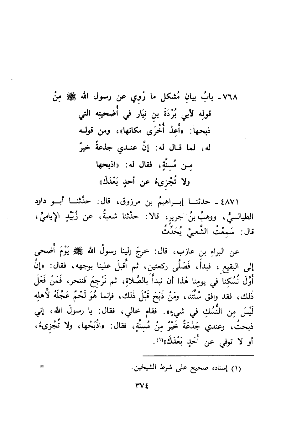 4871 - حَدَّثَنَا إِبْرَاهِيمُ بْنُ مَرْزُوقٍ قَالَ: حَدَّثَنَا أَبُو دَاوُدَ الطَّيَالِسِيُّ، وَوَهْبُ بْنُ جَرِيرٍ قَالَا: حَدَّثَنَا شُعْبَةُ , عَنْ زُبَيْدٍ الْإِيَامِيِّ قَالَ: سَمِعْتُ الشَّعْبِيَّ يُحَدِّثُ عَنِ الْبَرَاءِ بْنِ عَازِبٍ قَالَ: خَرَجَ إِلَيْنَا رَسُولُ اللهِ صَلَّى اللَّهُ عَلَيْهِ وَسَلَّمَ يَوْمَ أَضْحًى إِلَى الْبَقِيعِ، فَبَدَأَ، فَصَلَّى رَكْعَتَيْنِ، ثُمَّ أَقْبَلَ عَلَيْنَا بِوَجْهِهِ، فَقَالَ: " إِنَّ أَوَّلَ نُسُكِنَا فِي يَوْمِنَا هَذَا أَنْ نَبْدَأَ بِالصَّلَاةِ، ثُمَّ نَرْجِعَ فَنَنْحَرَ، فَمَنْ فَعَلَ ذَلِكَ، فَقَدْ وَافَقَ سُنَّتَنَا، وَمَنْ ذَبَحَ قَبْلَ ذَلِكَ، فَإِنَّمَا هُوَ لَحْمٌ عَجَّلَهُ لِأَهْلِهِ لَيْسَ مِنَ النُّسُكِ فِي شَيْءٍ " فَقَامَ خَالِي، فَقَالَ: يَا رَسُولَ اللهِ , إِنِّي ذَبَحْتُ، وَعِنْدِي جَذَعَةٌ خَيْرٌ مِنْ مُسِنَّةٍ، فَقَالَ: " اذْبَحْهَا وَلَا تُجْزِئُ أَوْ لَا تُوُفِّي عَنْ أَحَدٍ بَعْدَكَ " -[375]-