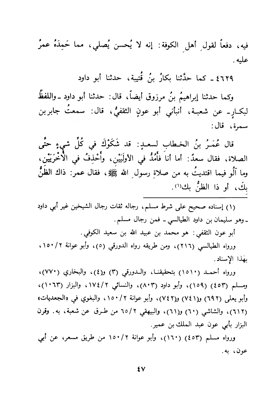 4629 - كَمَا حَدَّثَنَا بَكَّارُ بْنُ قُتَيْبَةَ، حَدَّثَنَا أَبُو دَاوُدَ، وَكَمَا حَدَّثَنَا إِبْرَاهِيمُ بْنُ مَرْزُوقٍ أَيْضًا قَالَ: حَدَّثَنَا أَبُو دَاوُدَ وَاللَّفْظُ لِبَكَّارٍ عَنْ شُعْبَةَ، أَنْبَأَنِي أَبُو عَوْنٍ الثَّقَفِيُّ قَالَ: سَمِعْتُ جَابِرَ بْنَ سَمُرَةَ قَالَ: قَالَ عُمَرُ بْنُ الْخَطَّابِ لِسَعْدٍ: " قَدْ شَكَوْكَ فِي كُلِّ شَيْءٍ حَتَّى الصَّلَاةِ، فَقَالَ سَعْدٌ: أَمَّا أَنَا فَأَمُدُّ فِي الْأُولَيَيْنِ، وَأَحْذِفُ فِي الْأُخْرَيَيْنِ، وَمَا آلُو فِيمَا اقْتَدَيْتُ بِهِ مِنْ صَلَاةِ رَسُولِ اللهِ صَلَّى اللَّهُ عَلَيْهِ وَسَلَّمَ، فَقَالَ عُمَرُ: ذَاكَ الظَّنُّ بِكَ، أَوْ ذَا الظَّنُّ بِكَ " -[48]-