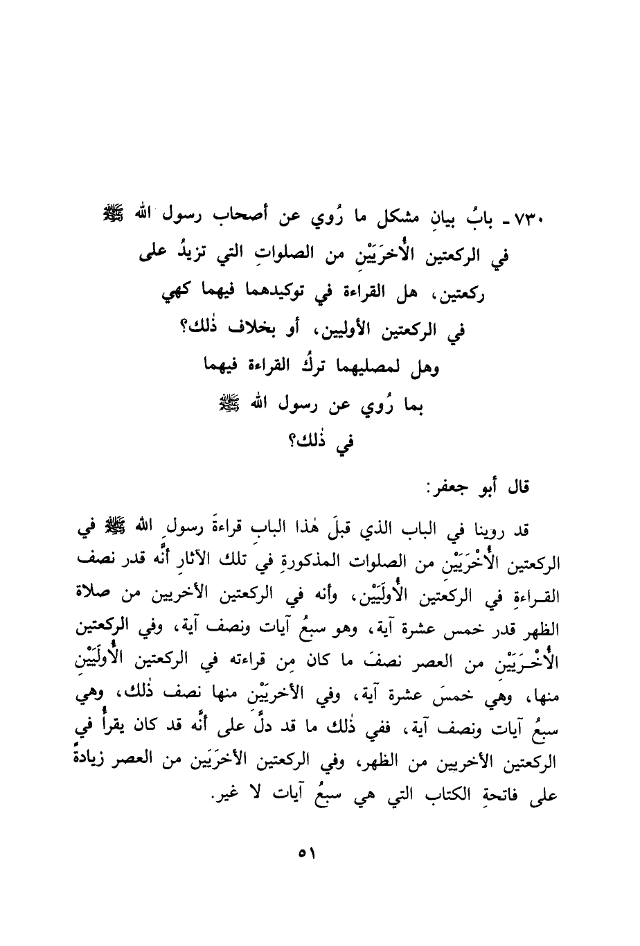 بَابُ بَيَانِ مُشْكِلِ مَا رُوِيَ عَنْ أَصْحَابِ رَسُولِ اللهِ صَلَّى اللَّهُ عَلَيْهِ وَسَلَّمَ فِي الرَّكْعَتَيْنِ الْأُخْرَيَيْنِ مِنَ الصَّلَوَاتِ الَّتِي تَزِيدُ عَلَى رَكْعَتَيْنٍ، هَلِ الْقِرَاءَةُ فِي تَوْكِيدِهِمَا فِيهِمَا كَهِيَ فِي الرَّكْعَتَيْنِ الْأُولَيَيْنِ، أَوْ بِخِلَافِ ذَلِكَ؟ وَهَلْ لِمُصَلِّيهِمَا تَرْكُ الْقِرَاءَةِ فِيهِمَا بِمَا رُوِيَ عَنْ رَسُولِ اللهِ صَلَّى اللَّهُ عَلَيْهِ وَسَلَّمَ فِي ذَلِكَ؟ قَالَ أَبُو جَعْفَرٍ: قَدْ رُوِّينَا فِي الْبَابِ الَّذِي قَبْلَ هَذَا الْبَابِ قِرَاءَةَ رَسُولِ اللهِ صَلَّى اللَّهُ عَلَيْهِ وَسَلَّمَ فِي الرَّكْعَتَيْنِ الْأُخْرَيَيْنِ مِنَ الصَّلَوَاتِ الْمَذْكُورَةِ فِي تِلْكَ الْآثَارِ، أَنَّهُ قَدْرُ نِصْفِ الْقِرَاءَةِ فِي الرَّكْعَتَيْنِ الْأُولَيَيْنِ، وَأَنَّهُ فِي الرَّكْعَتَيْنِ الْأُخْرَيَيْنِ مِنْ صَلَاةِ الظُّهْرِ قَدْرُ خَمْسَ عَشْرَةَ آيَةً، وَهُوَ سَبْعُ آيَاتٍ وَنِصْفُ آيَةٍ، وَفِي الرَّكْعَتَيْنِ الْأُخْرَيَيْنِ مِنَ الْعَصْرِ نِصْفُ مَا كَانَ مِنْ قِرَاءَتِهِ فِي الرَّكْعَتَيْنِ الْأُولَيَيْنِ مِنْهَا، وَهِيَ خَمْسَ عَشْرَةَ آيَةً، وَفِي الْأُخْرَيَيْنِ مِنْهَا نِصْفُ ذَلِكَ، وَهِيَ سَبْعُ آيَاتٍ وَنِصْفُ آيَةٍ، فَفِي ذَلِكَ مَا قَدْ دَلَّ عَلَى أَنَّهُ قَدْ كَانَ يَقْرَأُ فِي الرَّكْعَتَيْنِ الْأُخْرَيَيْنِ مِنَ الظُّهْرِ، وَفِي الرَّكْعَتَيْنِ الْأُخْرَيَيْنِ مِنَ الْعَصْرِ زِيَادَةً عَلَى فَاتِحَةِ الْكِتَابِ الَّتِي هِيَ سَبْعُ آيَاتٍ لَا غَيْرَ