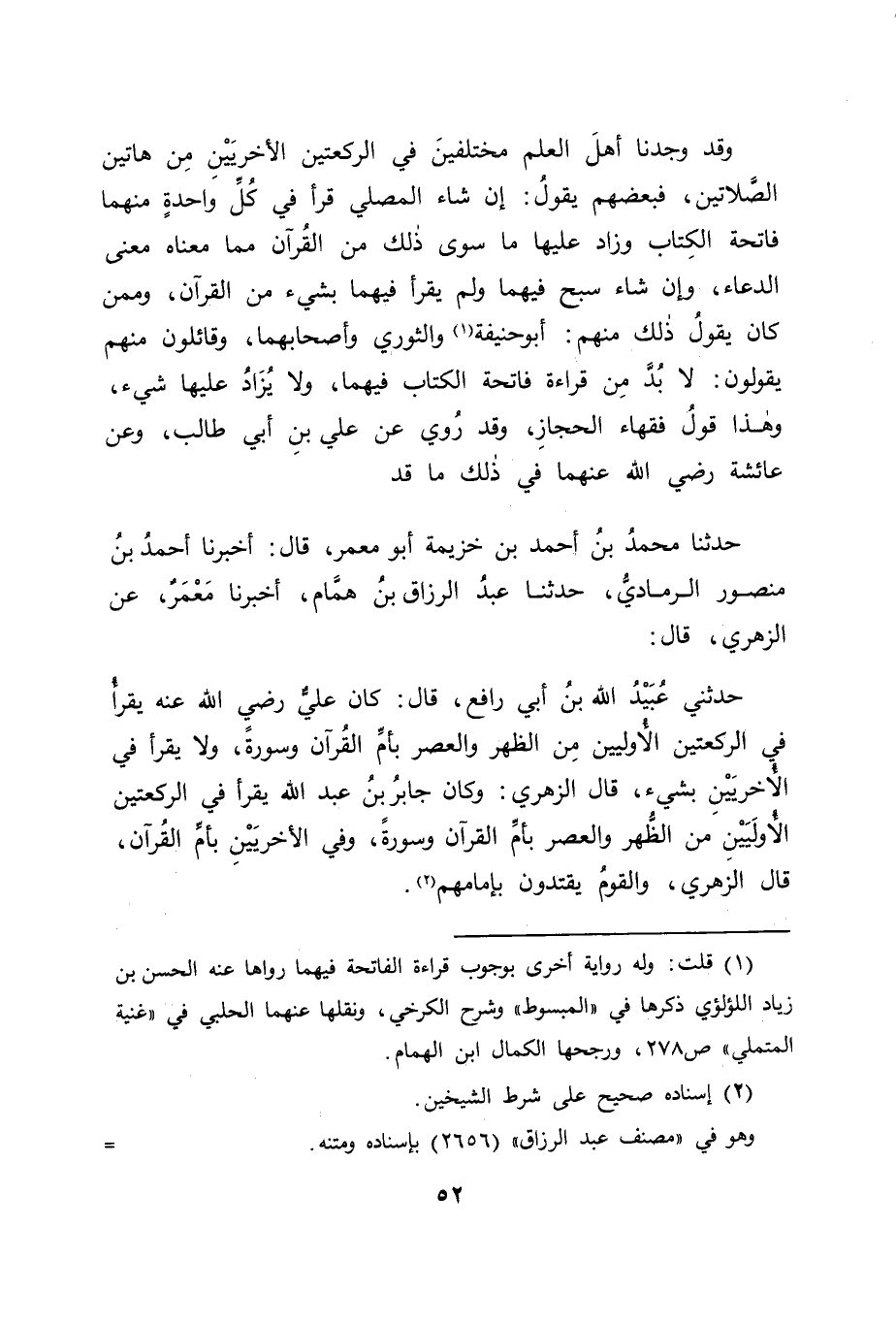 حَدَّثَنَا مُحَمَّدُ بْنُ أَحْمَدَ بْنِ خُزَيْمَةَ أَبُو مَعْمَرٍ قَالَ: أَخْبَرَنَا أَحْمَدُ بْنُ مَنْصُورٍ الرَّمَادِيُّ , حَدَّثَنَا عَبْدُ الرَّزَّاقِ بْنُ هَمَّامٍ , أَخْبَرَنَا مَعْمَرٌ، عَنِ الزُّهْرِيِّ قَالَ: حَدَّثَنِي عُبَيْدُ اللهِ بْنُ أَبِي رَافِعٍ قَالَ: كَانَ عَلِيٌّ رَضِيَ اللهُ عَنْهُ يَقْرَأُ فِي الرَّكْعَتَيْنِ الْأُولَيَيْنِ مِنَ الظُّهْرِ وَالْعَصْرِ بِأُمِّ الْقُرْآنِ وَسُورَةٍ، وَلَا يَقْرَأُ فِي الْأُخْرَيَيْنِ بِشَيْءٍ "
