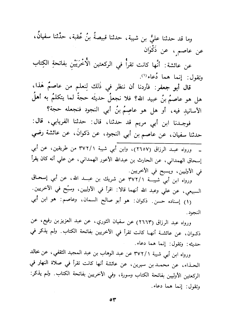 وَمَا قَدْ حَدَّثَنَا عَلِيُّ بْنُ شَيْبَةَ , حَدَّثَنَا قَبِيصَةُ بْنُ عُقْبَةَ , حَدَّثَنَا سُفْيَانُ , عَنْ عَاصِمٍ , عَنْ ذَكْوَانَ، عَنْ عَائِشَةَ: " أَنَّهَا كَانَتْ تَقْرَأُ فِي الرَّكْعَتَيْنِ الْأُخْرَيَيْنِ بِفَاتِحَةِ الْكِتَابِ، وَتَقُولُ: إِنَّمَا هُمَا دُعَاءٌ " قَالَ أَبُو جَعْفَرٍ: فَأَرَدْنَا أَنْ نَنْظُرَ فِي ذَلِكَ لِنَعْلَمَ مَنْ عَاصِمٌ هَذَا، هَلْ هُوَ عَاصِمُ بْنُ عُبَيْدِ اللهِ؟ فَلَا نَجْعَلُ حَدِيثَهُ حُجَّةً لِمَا يَتَكَلَّمُ بِهِ أَهْلُ الْأَسَانِيدِ فِيهِ، أَوْ هَلْ هُوَ عَاصِمُ بْنُ أَبِي النَّجُودِ فَنَجْعَلُهُ حُجَّةً؟