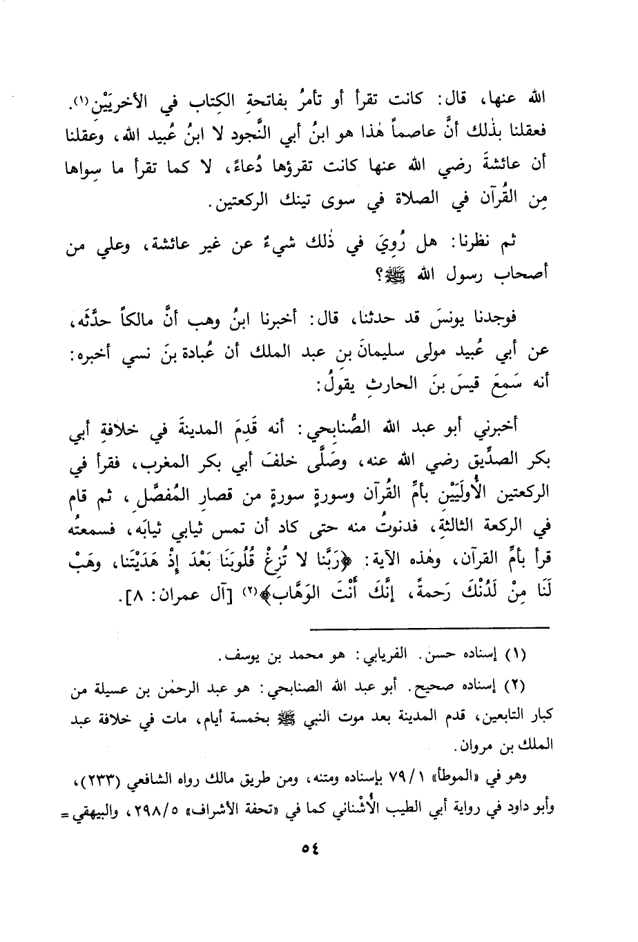فَوَجَدْنَا يُونُسَ قَدْ حَدَّثَنَا قَالَ: أَخْبَرَنَا ابْنُ وَهْبٍ أَنَّ مَالِكًا، حَدَّثَهُ، عَنْ أَبِي عُبَيْدٍ مَوْلَى سُلَيْمَانَ بْنِ عَبْدِ الْمَلِكِ أَنَّ عُبَادَةَ بْنَ نُسَيٍّ، أَخْبَرَهُ: أَنَّهُ سَمِعَ قَيْسَ بْنَ الْحَارِثِ يَقُولُ: أَخْبَرَنِي أَبُو عَبْدِ اللهِ الصُّنَابِحِيُّ: أَنَّهُ قَدِمَ الْمَدِينَةَ فِي خِلَافَةِ أَبِي بَكْرٍ الصِّدِّيقِ رَضِيَ اللهُ عَنْهُ، وَصَلَّى خَلْفَ أَبِي بَكْرٍ الْمَغْرِبَ، فَقَرَأَ فِي الرَّكْعَتَيْنِ الْأُولَيَيْنِ بِأُمِّ الْقُرْآنِ وَسُورَةٍ سُورَةٍ مِنْ قِصَارِ الْمُفَصَّلِ، ثُمَّ قَامَ فِي الرَّكْعَةِ الثَّالِثَةِ، فَدَنَوْتُ مِنْهُ حَتَّى كَادَ أَنْ تَمَسَّ ثِيَابِي ثِيَابَهُ، فَسَمِعْتُهُ قَرَأَ بِأُمِّ الْقُرْآنِ، وَهَذِهِ الْآيَةُ: {رَبَّنَا لَا تُزِغْ قُلُوبَنَا بَعْدَ إِذْ هَدَيْتَنَا وَهَبْ لَنَا مِنْ لَدُنْكَ رَحْمَةً إِنَّكَ أَنْتَ الْوَهَّابُ} [آل عمران: 8]-[55]- وَوَجَدْنَا عَبْدَ الرَّحْمَنِ بْنَ عَمْرٍو الدِّمَشْقِيَّ قَدْ حَدَّثَنَا قَالَ عَبْدُ الرَّحْمَنِ بْنُ إِبْرَاهِيمَ , حَدَّثَنَا الْوَلِيدُ بْنُ مُسْلِمٍ , حَدَّثَنَا الْأَوْزَاعِيُّ، وَمَالِكٌ قَالَا: حَدَّثَنَا أَبُو عُبَيْدٍ , حَدَّثَنِي عُبَادَةُ بْنُ نُسَيٍّ , عَنْ قَيْسِ بْنِ الْحَارِثِ، ثُمَّ ذَكَرَ مِثْلَهُ قَالَ عُبَادَةُ: فَحَضَرْتُ عُمَرَ بْنَ عَبْدِ الْعَزِيزِ وَهُوَ يَقُولُ لِقَيْسٍ، وَسَأَلَ عَنْ هَذَا الْحَدِيثِ، فَحَدَّثَ بِهِ قَالَ عُمَرُ: مَا تَرَكْتُهَا مُنْذُ سَمِعْتُكَ تُحَدِّثُ بِهِ، وَإِنْ كُنْتُ قَبْلَ ذَلِكَ لَعَلَى غَيْرِهِ، قُلْتُ: وَمَا هُوَ يَا أَمِيرَ الْمُؤْمِنِينَ؟ قَالَ: كُنْتُ أَقْرَأُ: قُلْ هُوَ اللهُ أَحَدٌ