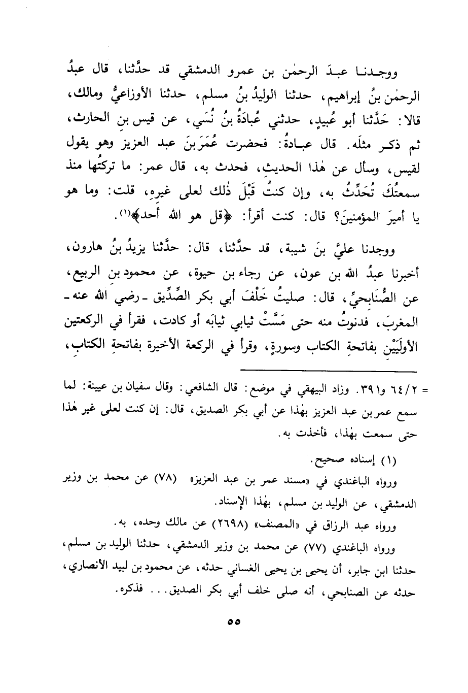 وَوَجَدْنَا عَلِيَّ بْنَ شَيْبَةَ قَدْ حَدَّثَنَا قَالَ: حَدَّثَنَا يَزِيدُ بْنُ هَارُونَ , أَخْبَرَنَا عَبْدُ اللهِ بْنُ عَوْنٍ , عَنْ رَجَاءِ بْنِ حَيْوَةَ , عَنْ مَحْمُودِ بْنِ الرَّبِيعِ، عَنِ الصُّنَابِحِيِّ قَالَ: " صَلَّيْتُ خَلْفَ أَبِي بَكْرٍ الصِّدِّيقِ رَضِيَ اللهُ عَنْهُ الْمَغْرِبَ، فَدَنَوْتُ مِنْهُ حَتَّى مَسَّتْ ثِيَابِي ثِيَابَهُ أَوْ كَادَتْ، فَقَرَأَ فِي الرَّكْعَتَيْنِ الْأُولَيَيْنِ بِفَاتِحَةِ الْكِتَابِ وَسُورَةٍ، وَقَرَأَ فِي الرَّكْعَةِ الْأَخِيرَةِ بِفَاتِحَةِ الْكِتَابِ، -[56]- وَقَالَ: {رَبَّنَا لَا تُزِغْ قُلُوبَنَا بَعْدَ إِذْ هَدَيْتَنَا} [آل عمران: 8] إِلَى قَوْلِهِ: {الْوَهَّابُ} [آل عمران: 8] ثُمَّ كَبَّرَ وَرَكَعَ " قَالَ يَزِيدُ: وَأَخْبَرَنِي مُحَمَّدُ بْنُ رَاشِدٍ، عَنْ مَكْحُولٍ قَالَ: وَاللهِ مَا كَانَتْ قِرَاءَةً، وَلَكِنَّهَا كَانَتْ دُعَاءً وَوَجَدْنَا عَبْدَ الرَّحْمَنِ بْنَ عَمْرٍو قَدْ حَدَّثَنَا قَالَ: حَدَّثَنَا أَبُو نُعَيْمٍ، حَدَّثَنَا عَاصِمُ بْنُ رَجَاءِ بْنِ حَيْوَةَ الْكِنْدِيُّ، عَنْ عُبَادَةَ بْنِ نُسَيٍّ، عَنِ الصُّنَابِحِيِّ، وَلَمْ يَذْكُرْ بَيْنَهُمَا أَحَدًا، ثُمَّ ذَكَرَ مِثْلَ حَدِيثَهُ الَّذِي ذَكَرْنَاهُ عَنْهُ فِي هَذَا الْبَابِ وَوَجَدْنَا ابْنَ أَبِي دَاوُدَ قَدْ حَدَّثَنَا قَالَ: حَدَّثَنَا خَطَّابُ بْنُ عُثْمَانَ قَالَ: حَدَّثَنَا إِسْمَاعِيلُ بْنُ عَيَّاشٍ، عَنْ عُبَادَةَ بْنِ نُسَيٍّ، عَنْ أَبِي عَبْدِ الرَّحْمَنِ، وَلَمْ يَذْكُرْ بَيْنَهُمَا أَحَدًا، وَقَالَ: عَنْ أَبِي عَبْدِ الرَّحْمَنِ، وَلَمْ يَقُلْ: عَنْ أَبِي عَبْدِ اللهِ، ثُمَّ ذَكَرَ مِثْلَهُ -[57]- وَكَانَ فِي هَذَا الْحَدِيثِ مَا قَدْ شَدَّ مَا ذَهَبَ إِلَيْهِ الَّذِينَ قَالُوا: إِنَّ الْقِرَاءَةَ فِي الرَّكْعَتَيْنِ الْأُخْرَيَيْنِ إِنَّمَا هُوَ دُعَاءٌ وَتَسْبِيحٌ، لَا كَالْقِرَاءَةِ فِي الرَّكْعَتَيْنِ الْأُولَيَيْنِ مِنَ الصَّلَوَاتِ، وَهَذَا مِمَّا لَمْ يَقُلْهُ مَنْ قَالَهُ رَأْيًا، وَلَا اسْتِنْبَاطًا، وَلَا اسْتِخْرَاجًا إِذْ كَانَ مِثْلُهُ لَا يُقَالُ بِالرَّأْيِ وَلَا بِالِاسْتِنْبَاطِ وَالِاسْتِخْرَاجِ، وَإِنَّمَا يُقَالُ بِالتَّوْقِيفِ، وَمَا كَانَتْ هَذِهِ سَبِيلَهُ، لَمْ يَصْلُحْ خِلَافُهُ، وَلَا الْقَوْلُ بِغَيْرِهِ، وَقَدْ كَانَ إِبْرَاهِيمُ النَّخَعِيُّ يَذْهَبُ إِلَى هَذَا الْقَوْلِ أَيْضًا