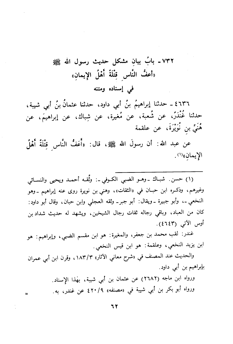 4636 - حَدَّثَنَا إِبْرَاهِيمُ بْنُ أَبِي دَاوُدَ , حَدَّثَنَا عُثْمَانُ بْنُ أَبِي شَيْبَةَ , حَدَّثَنَا غُنْدَرٌ , عَنْ شُعْبَةَ , عَنْ مُغِيرَةَ , عَنْ شِبَاكٍ , عَنْ إِبْرَاهِيمَ , عَنْ هُنَيِّ بْنِ نُوَيْرَةَ , عَنْ عَلْقَمَةَ، عَنْ عَبْدِ اللهِ: أَنَّ رَسُولَ اللهِ صَلَّى اللَّهُ عَلَيْهِ وَسَلَّمَ قَالَ: " أَعَفُّ النَّاسِ قِتْلَةً أَهْلُ الْإِيمَانِ "