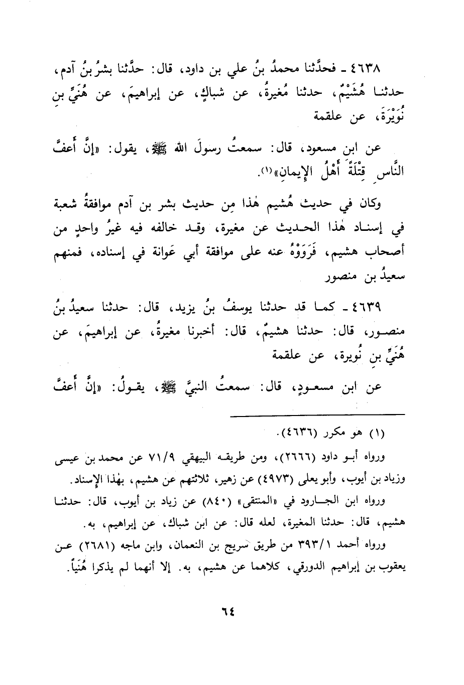 4639 - كَمَا قَدْ حَدَّثَنَا يُوسُفُ بْنُ يَزِيدَ قَالَ: حَدَّثَنَا سَعِيدُ بْنُ مَنْصُورٍ قَالَ: حَدَّثَنَا هُشَيْمٌ قَالَ: أَخْبَرَنَا مُغِيرَةُ , عَنْ إِبْرَاهِيمَ , عَنْ هُنَيِّ بْنِ نُوَيْرَةَ , عَنْ عَلْقَمَةَ، عَنِ ابْنِ مَسْعُودٍ قَالَ: سَمِعْتُ النَّبِيَّ صَلَّى اللَّهُ عَلَيْهِ وَسَلَّمَ يَقُولُ: " إِنَّ أَعَفَّ -[65]- النَّاسِ قِتْلَةً أَهْلُ الْإِيمَانِ " وَمِنْهُمْ: مُوسَى بْنُ دَاوُدَ