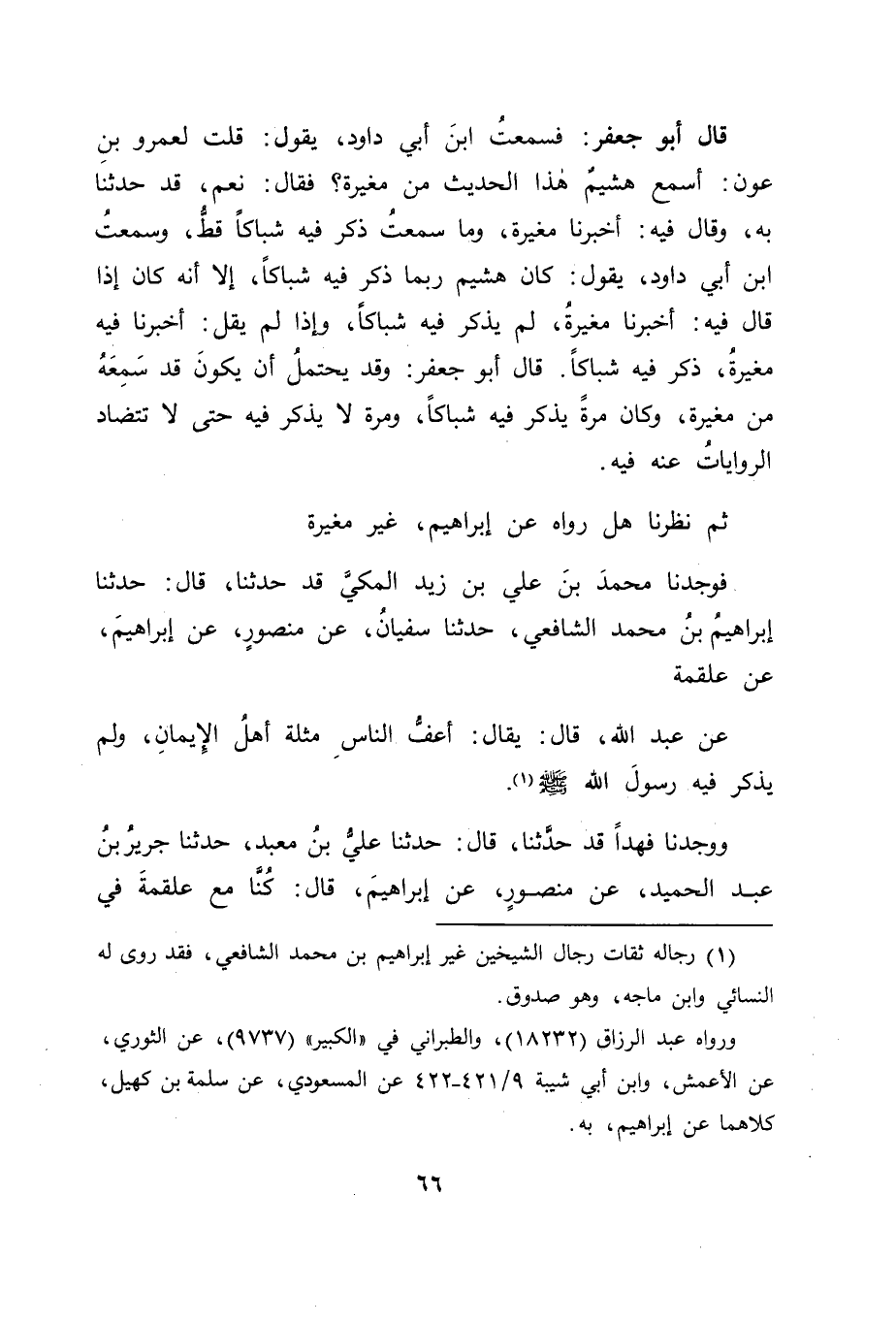 فَوَجَدْنَا مُحَمَّدَ بْنَ عَلِيِّ بْنِ زَيْدٍ الْمَكِّيَّ قَدْ حَدَّثَنَا قَالَ: حَدَّثَنَا إِبْرَاهِيمُ بْنُ مُحَمَّدٍ الشَّافِعِيُّ، حَدَّثَنَا سُفْيَانُ، عَنْ مَنْصُورٍ، عَنْ إِبْرَاهِيمَ، عَنْ عَلْقَمَةَ عَنْ عَبْدِ اللهِ قَالَ: يُقَالَ: " أَعَفُّ النَّاسِ مُثْلَةً أَهْلُ الْإِيمَانِ " وَلَمْ يَذْكُرْ فِيهِ رَسُولَ اللهِ صَلَّى اللَّهُ عَلَيْهِ وَسَلَّمَ