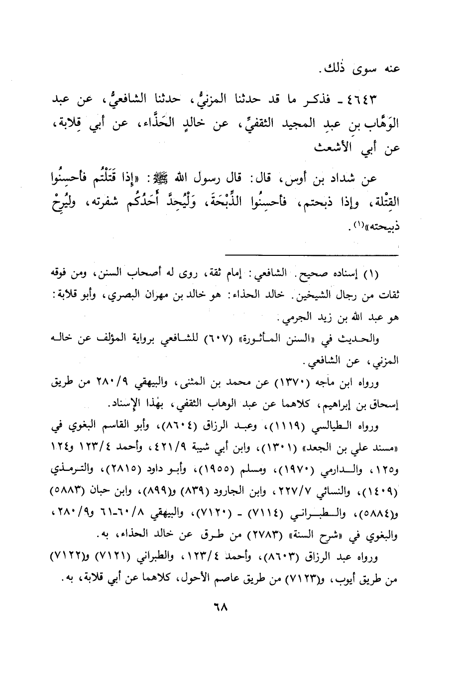 4643 - فَذَكَرَ مَا قَدْ حَدَّثَنَا الْمُزَنِيُّ , حَدَّثَنَا الشَّافِعِيُّ , عَنْ عَبْدِ الْوَهَّابِ بْنِ عَبْدِ الْمَجِيدِ الثَّقَفِيِّ , عَنْ خَالِدٍ الْحَذَّاءِ , عَنْ أَبِي قِلَابَةَ , عَنْ أَبِي الْأَشْعَثِ، عَنْ شَدَّادِ بْنِ أَوْسٍ قَالَ: قَالَ رَسُولُ اللهِ صَلَّى اللَّهُ عَلَيْهِ وَسَلَّمَ: " إِذَا قَتَلْتُمْ فَأَحْسِنُوا الْقِتْلَةَ، وَإِذَا ذَبَحْتُمْ، فَأَحْسِنُوا الذِّبْحَةَ، وَلْيُحِدَّ أَحَدُكُمْ شَفْرَتَهُ، وَلْيُرِحْ ذَبِيحَتَهُ " -[69]- وَإِذَا كَانَ ذَلِكَ هُوَ الَّذِي يَجِبُ أَنْ يُمْتَثَلَ فِي غَيْرِ بَنِي آدَمَ كَانَ امْتِثَالُهُ فِيمَا حَلَّ قَتْلُهُ مِنْ بَنِي آدَمَ أَوْلَى، فَكَانَ مِنْ حُجَّتِنَا عَلَيْهِ فِي ذَلِكَ أَنَّ الَّذِي كَانَ مِنْ رَسُولِ اللهِ صَلَّى اللَّهُ عَلَيْهِ وَسَلَّمَ فِي الْعُرَنِيِّينَ كَانَ قَبْلَ نُزُولِ آيَةِ الْمُحَارَبَةِ، وَكَانَ مَا كَانَ مِنْ رَسُول اللهِ صَلَّى اللَّهُ عَلَيْهِ وَسَلَّمَ فِي ذَلِكَ هُوَ حُكْمُ اللهِ عَزَّ وَجَلَّ , وَكَانَ فِي ذَلِكَ الْفِعْلُ فِي ذَلِكَ الْوَقْتِ، كَمَا أَنَّ مِنْ حُكْمِهِ عَزَّ وَجَلَّ رَجْمَ الزُّنَاةِ الْمُحْصَنِينَ حَتَّى يُقْتَلُوا بِذَلِكَ، وَإِنْ هَرَبُوا اتُّبِعُوا حَتَّى يُؤْتَى عَلَى أَنْفُسِهِمْ، وَفِي ذَلِكَ مَا قَدْ يَجُوزُ أَنْ تَتَّسِعَ فِيهِ الْمُدَّةُ، وَإِذَا كَانَ ذَلِكَ كَذَلِكَ فِي الزُّنَاةِ الْمُحْصَنِينَ، لَمْ يَكُنْ مُنْكَرًا أَنْ يَكُونَ قَدْ كَانَتِ الْعُقُوبَةُ فِيمَا كَانَ مِنَ الْعُرَنِيِّينَ مَا كَانَ مِنْهُمْ، وَإِنْ طَالَتْ فِيهَا الْمُدَّةُ حَتَّى يَمُوتُوا، ثُمَّ رَدَّ اللهُ عَزَّ وَجَلَّ الْحُكْمَ فِي أَمْثَالِهِمْ إِلَى مَا أَنْزَلَهُ فِي آيَةِ الْمُحَارَبَةِ، وَكَانَ فِي ذَلِكَ مَا قَدْ دَلَّ عَلَى أَنَّهُ لَا يَتَجَاوَرُ مَا فِيهَا إِلَى مَا سِوَاهُ، وَنَهَى صَلَّى اللَّهُ عَلَيْهِ وَسَلَّمَ عَنِ الْمُثْلَةِ، وَأَمَرَ بِمَا فِي حَدِيثِ شَدَّادٍ أَنَّهُ لَا يَخْرُجُ عَنْ عُقُوبَاتِ اللهِ عَزَّ وَجَلَّ إِلَى مَا سِوَاهَا بِمَا هُوَ أَكْثَرُ مِنْهَا، فَبَانَ بِحَمْدِ اللهِ وَنِعْمَتِهِ أَنْ لَا تَضَادَّ فِي شَيْءٍ مِنْ هَذِهِ الْآثَارِ، وَاللهَ نَسْأَلُهُ التَّوْفِيقَ