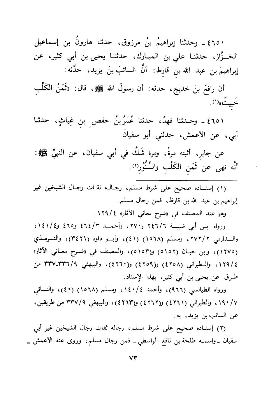 4651 - وَحَدَّثَنَا فَهْدٌ , حَدَّثَنَا عُمَرُ بْنُ حَفْصِ بْنِ غِيَاثٍ , حَدَّثَنَا أَبِي، عَنِ الْأَعْمَشِ , حَدَّثَنِي أَبُو سُفْيَانَ , عَنْ جَابِرٍ أَثْبَتَهُ مَرَّةً، وَمَرَّةً شَكَّ فِي أَبِي سُفْيَانَ عَنِ النَّبِيِّ صَلَّى اللَّهُ عَلَيْهِ وَسَلَّمَ: أَنَّهُ " نَهَى عَنْ ثَمَنِ الْكَلْبِ وَالسِّنَّوْرِ " -[74]-