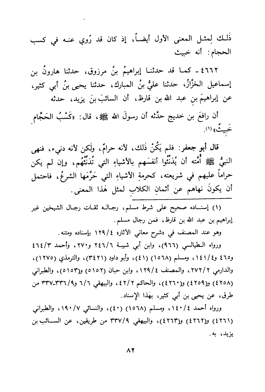 4662 - كَمَا قَدْ حَدَّثَنَا إِبْرَاهِيمُ بْنُ مَرْزُوقٍ , حَدَّثَنَا هَارُونُ بْنُ إِسْمَاعِيلَ الْخَزَّازُ , حَدَّثَنَا عَلِيُّ بْنُ الْمُبَارَكِ , حَدَّثَنَا يَحْيَى بْنُ أَبِي كَثِيرٍ , عَنْ إِبْرَاهِيمَ بْنِ عَبْدِ اللهِ بْنِ قَارِظٍ، أَنَّ السَّائِبَ بْنَ يَزِيدَ، حَدَّثَهُ أَنَّ رَافِعَ بْنَ خَدِيجٍ حَدَّثَهُ أَنَّ رَسُولَ اللهِ صَلَّى اللَّهُ عَلَيْهِ وَسَلَّمَ قَالَ: " كَسْبُ الْحَجَّامِ خَبِيثٌ " قَالَ أَبُو جَعْفَرٍ: فَلَمْ يَكُنْ ذَلِكَ لِأَنَّهُ حَرَامٌ، وَلَكِنْ لِأَنَّهُ دَنِيءٌ، فَنَهَى النَّبِيُّ صَلَّى اللَّهُ عَلَيْهِ وَسَلَّمَ أُمَّتَهُ أَنْ يُدَنِّئُوا أَنْفُسَهُمْ بِالْأَشْيَاءِ الَّتِي تُدَنِّئُهُمْ، وَإِنْ لَمْ يَكُنْ حَرَامًا عَلَيْهِمْ فِي شَرِيعَتِهِ، كَحُرْمَةِ الْأَشْيَاءِ الَّتِي حَرَّمَهَا الشَّرْعُ، فَاحْتُمِلَ أَنْ يَكُونَ نَهَاهُمْ عَنْ أَثْمَانِ الْكِلَابِ لِمِثْلِ هَذَا الْمَعْنَى، -[83]- ثُمَّ نَظَرْنَا هَلْ رُوِيَ عَنْ رَسُولِ اللهِ صَلَّى اللَّهُ عَلَيْهِ وَسَلَّمَ شَيْءٌ يَدُلُّ عَلَى إِحْلَالِ أَثْمَانِ الْكِلَابِ الَّتِي يُنْتَفَعُ بِهَا