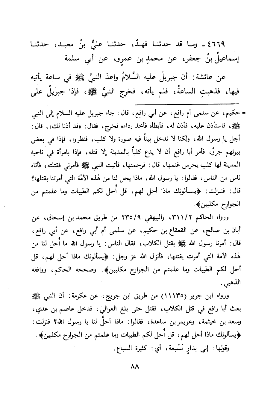 4669 - وَمَا قَدْ حَدَّثَنَا فَهْدٌ , حَدَّثَنَا عَلِيُّ بْنُ مَعْبَدٍ , حَدَّثَنَا إِسْمَاعِيلُ بْنُ جَعْفَرٍ , عَنْ مُحَمَّدِ بْنِ عَمْرٍو , عَنْ أَبِي سَلَمَةَ عَنْ عَائِشَةَ: أَنَّ جِبْرِيلَ عَلَيْهِ السَّلَامُ وَاعَدَ النَّبِيَّ صَلَّى اللَّهُ عَلَيْهِ وَسَلَّمَ فِي سَاعَةٍ يَأْتِيهِ فِيهَا، فَذَهَبَتِ السَّاعَةُ، فَلَمْ يَأْتِهِ، فَخَرَجَ النَّبِيُّ صَلَّى اللَّهُ عَلَيْهِ وَسَلَّمَ، فَإِذَا جِبْرِيلُ عَلَى -[89]- الْبَابِ، فَقَالَ: مَا يَمْنَعُكَ أَنْ تَدْخُلَ الْبَيْتَ؟ قَالَ: إِنَّ فِي الْبَيْتِ كَلْبًا، وَإِنَّا لَا نَدْخُلُ بَيْتًا فِيهِ كَلْبٌ وَلَا صُورَةٌ، فَأَمَرَ النَّبِيُّ صَلَّى اللَّهُ عَلَيْهِ وَسَلَّمَ بِالْكَلْبِ فَأُخْرِجَ، ثُمَّ أَمَرَ بِالْكِلَابِ أَنْ تُقْتَلَ فَاحْتُمِلَ أَنْ يَكُونَ نَهْيُهُ كَانَ عَنْ أَثْمَانِ الْكِلَابِ فِي الْوَقْتِ الَّذِي كَانَ هَذَا الْحُكْمُ حُكْمَهَا، ثُمَّ أَبَاحَ النَّبِيُّ صَلَّى اللَّهُ عَلَيْهِ وَسَلَّمَ بَعْضَهَا