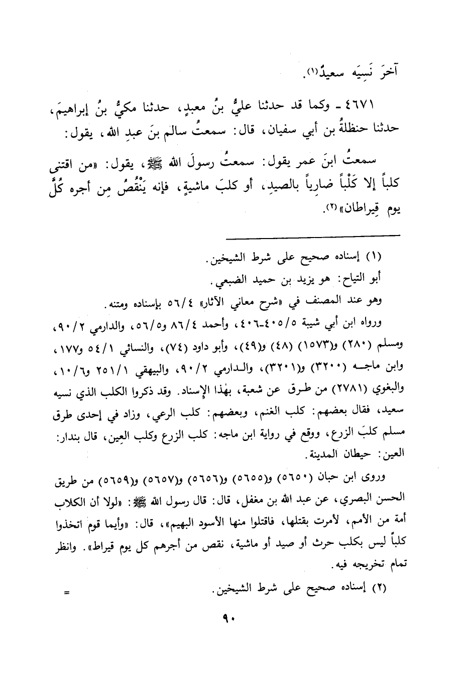 4671 - وَكَمَا قَدْ حَدَّثَنَا عَلِيُّ بْنُ مَعْبَدٍ , حَدَّثَنَا مَكِّيُّ بْنُ إِبْرَاهِيمَ , حَدَّثَنَا حَنْظَلَةُ بْنُ أَبِي سُفْيَانَ قَالَ: سَمِعْتُ سَالِمَ بْنَ عَبْدِ اللهِ يَقُولُ: سَمِعْتُ ابْنَ عُمَرَ يَقُولُ: سَمِعْتُ رَسُولَ اللهِ صَلَّى اللَّهُ عَلَيْهِ وَسَلَّمَ يَقُولُ: " مَنِ اقْتَنَى كَلْبًا إِلَّا كَلْبًا ضَارِيًا بِالصَّيْدِ، أَوْ كَلْبَ مَاشِيَةٍ، فَإِنَّهُ يَنْقُصُ مِنْ أَجْرِهِ كُلَّ يَوْمٍ قِيرَاطَانِ "